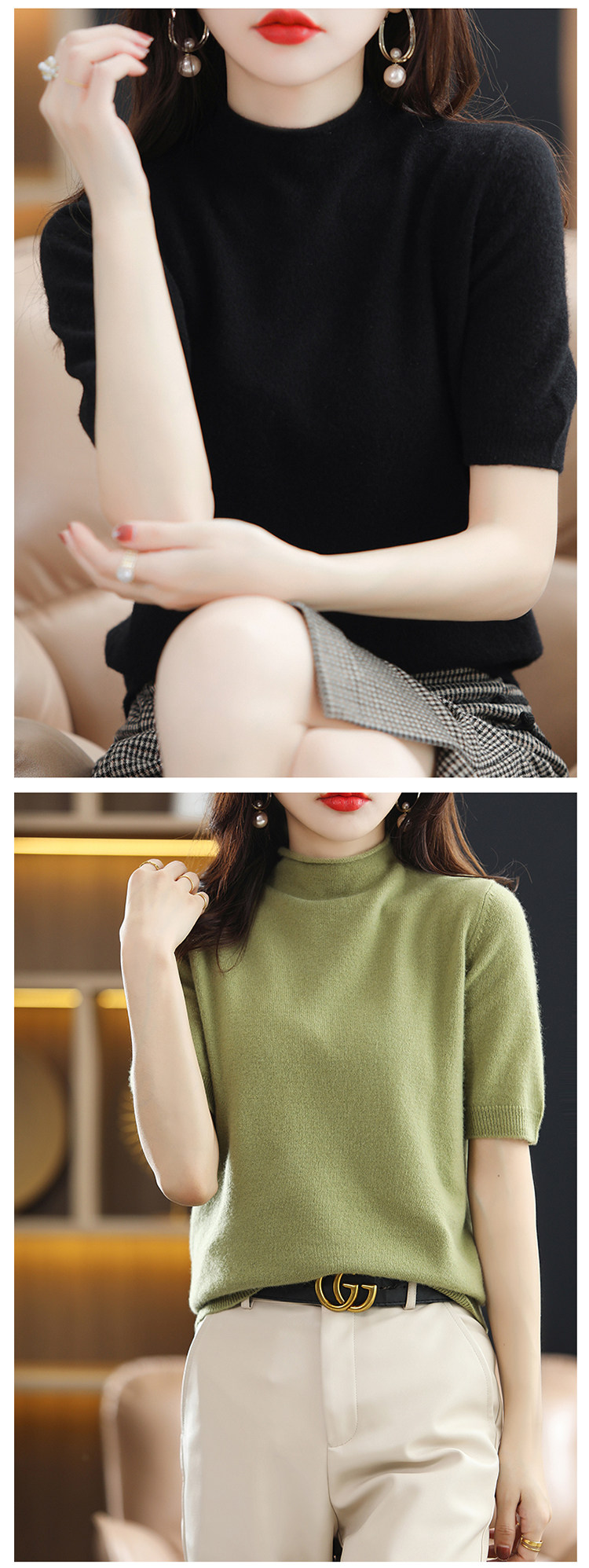 Шерстяной свитер, трикотажная футболка, высокий воротник, свободный крой, в западном стиле