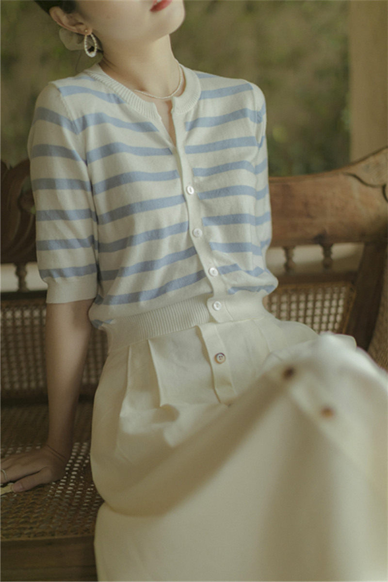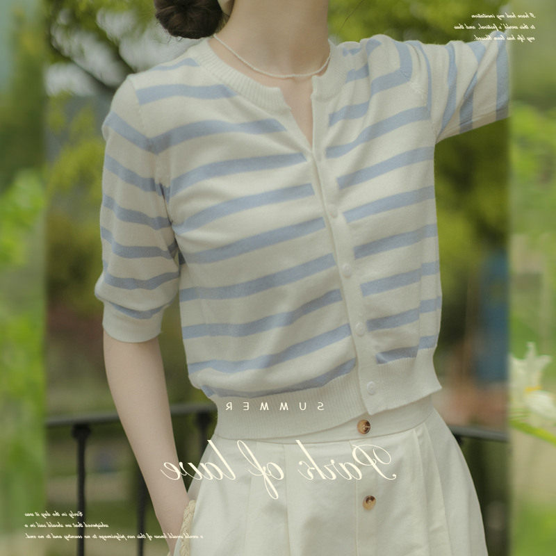 Летний трикотажный ретро кардиган, шелковая футболка, французский стиль, короткий рукав, V-образный вырез, в стиле Шанель
