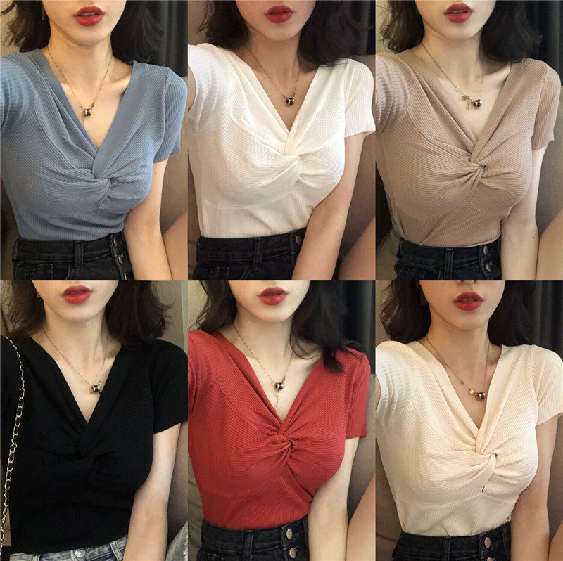 Летний тонкий трикотажный свитер, футболка, коллекция 2022, облегающий крой, V-образный вырез, короткий рукав