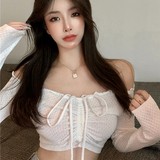 Дизайнерский сексуальный короткий лонгслив, свитер, тренд сезона, в обтяжку, открытые плечи и длинный рукав