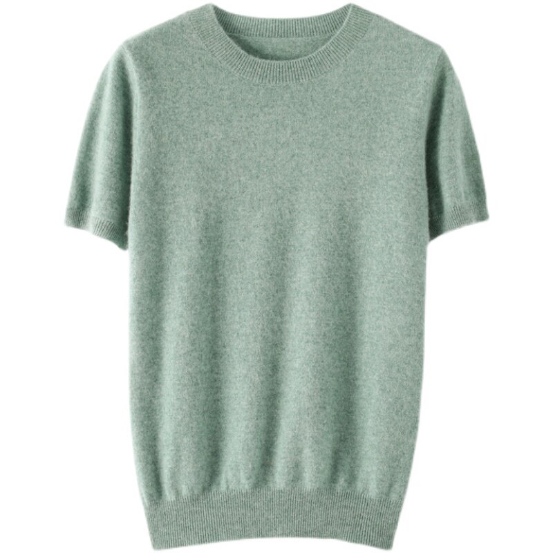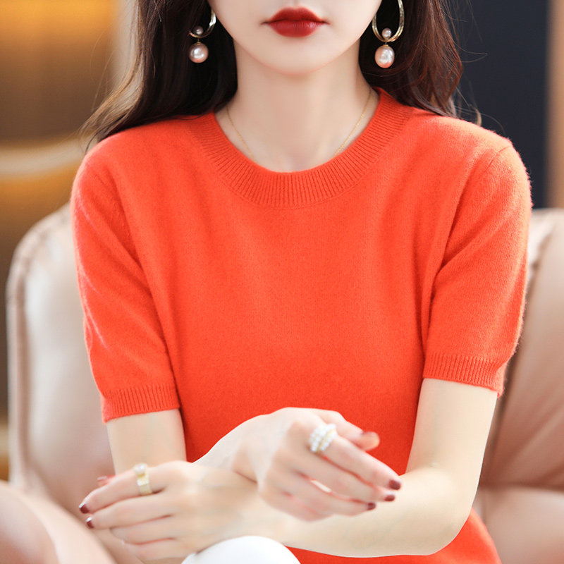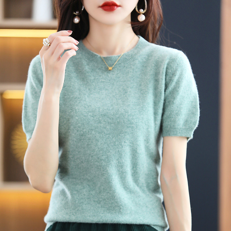 Летний шерстяной свитер с круглым воротником, короткая базовая приятная телу трикотажная тонкая кашемировая рубашка