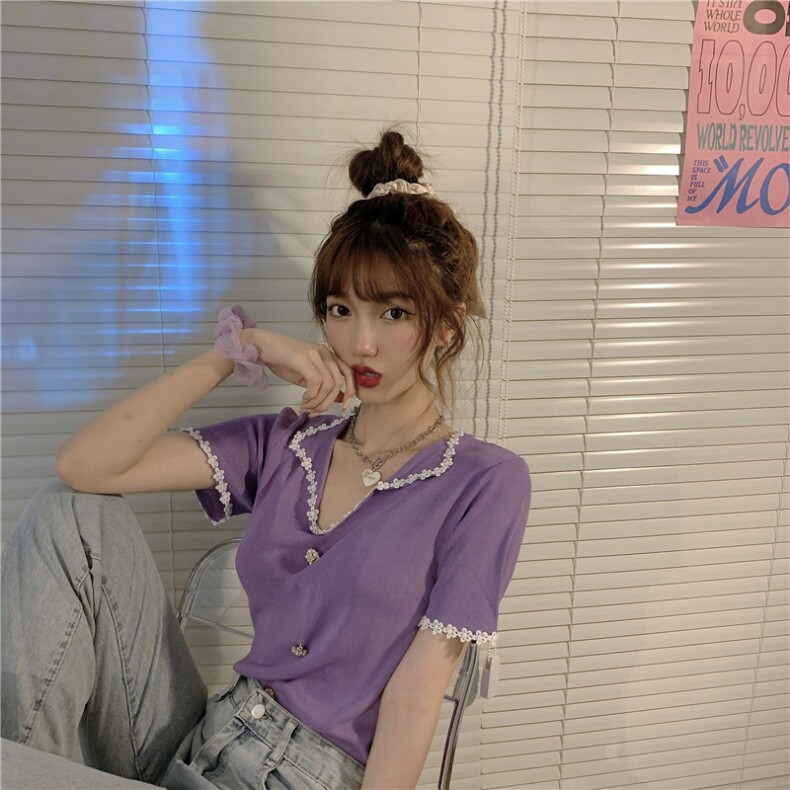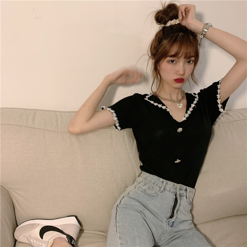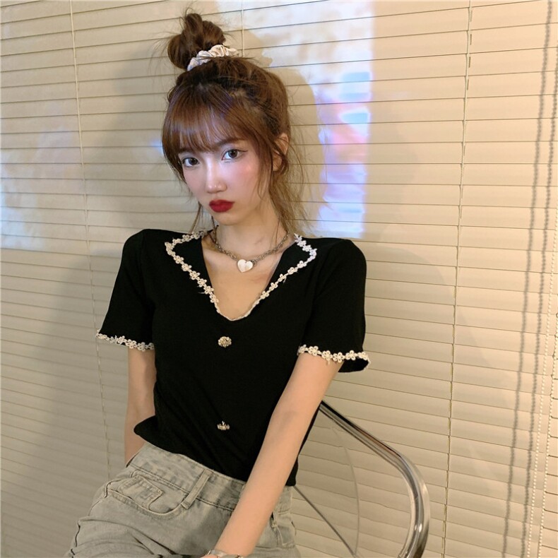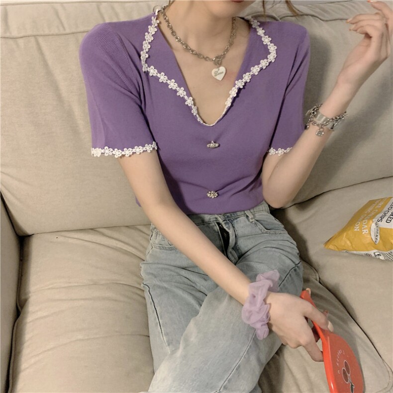 Трикотажный свитер, тонкая короткая дизайнерская футболка, коллекция 2022, короткий рукав, тренд сезона, V-образный вырез