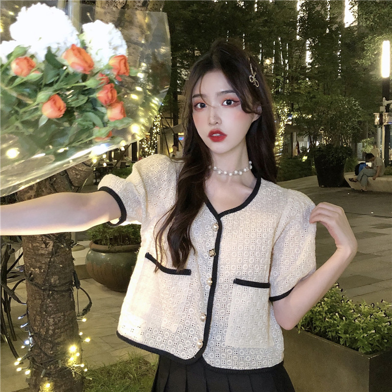 Летний кардиган, рубашка, большой размер, в стиле Шанель, французский стиль, короткий рукав, подходит для полных девушек, в западном стиле, рукава фонарики