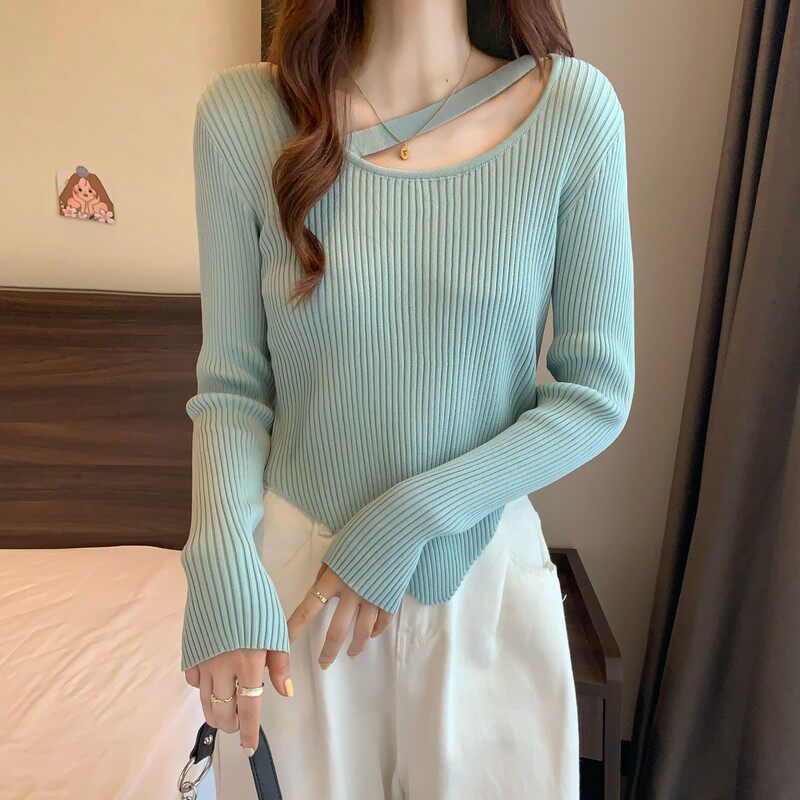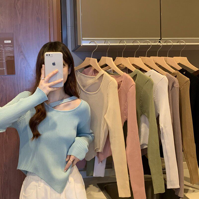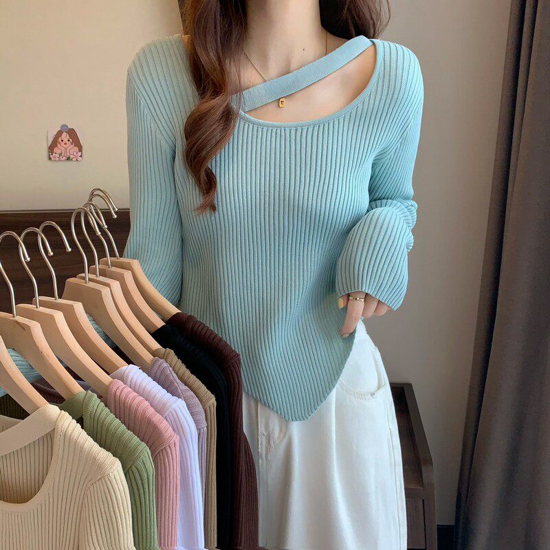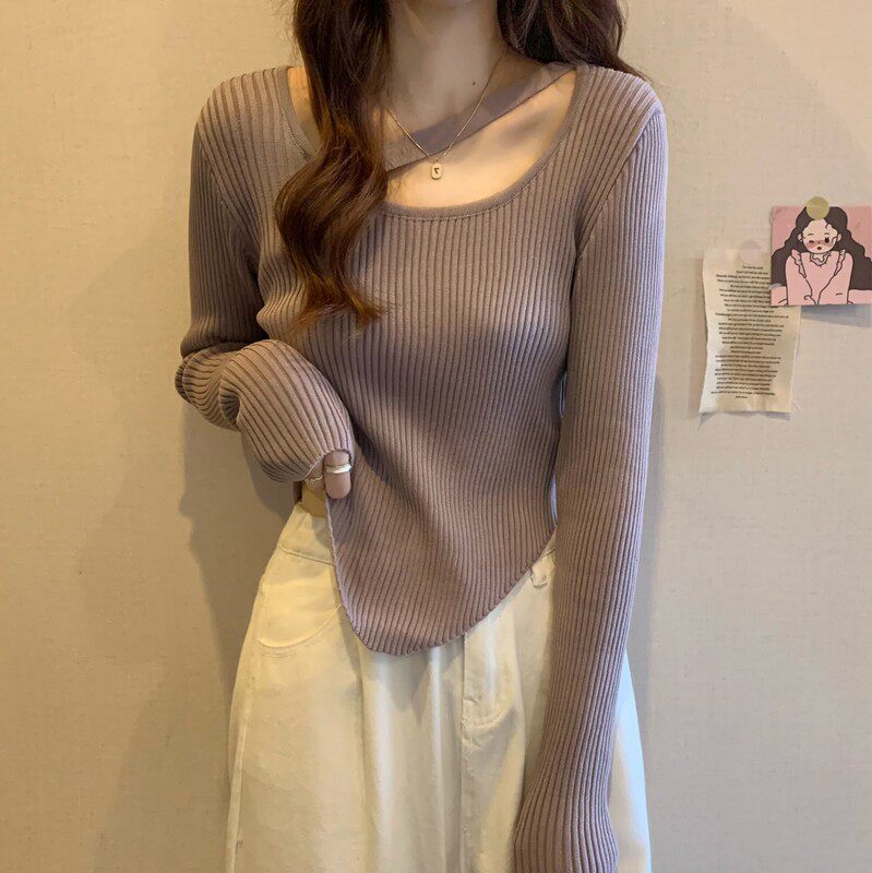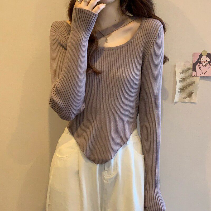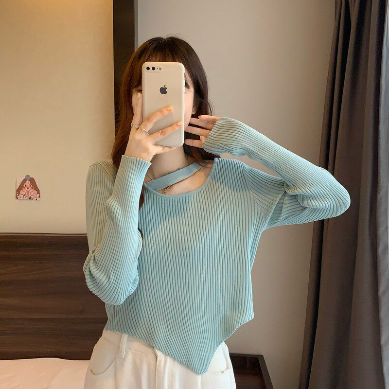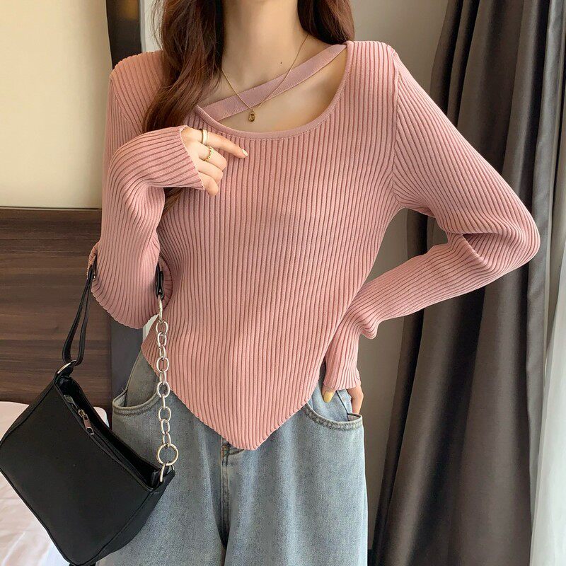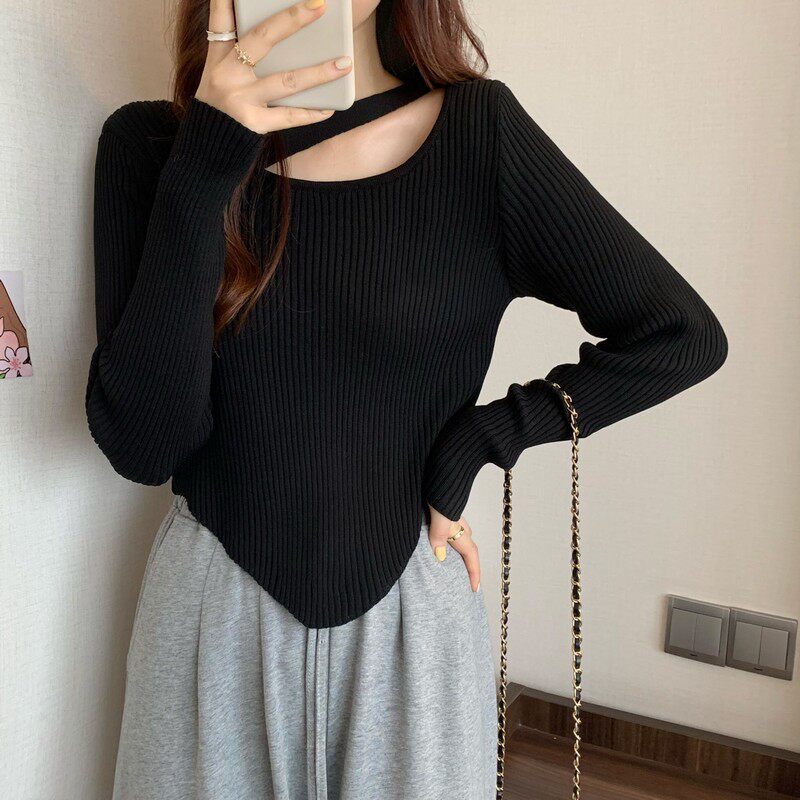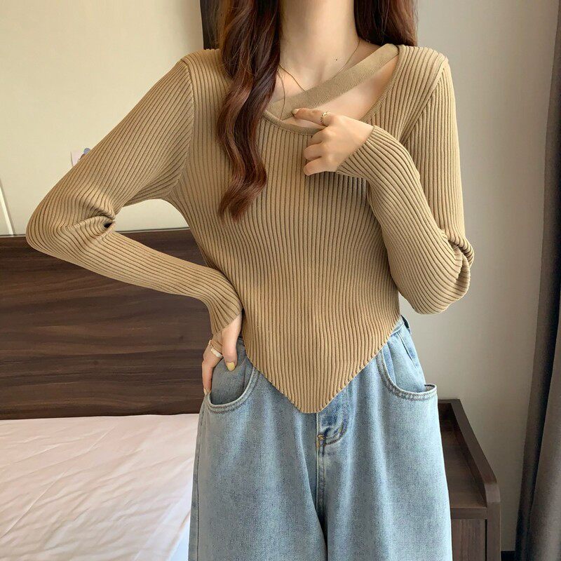 Весенне-осенний тонкий тонкий свитер с длинными рукавами и подолом, нишевый нишевый свитер западного дизайна, нерегулярный короткий свитер для женщин