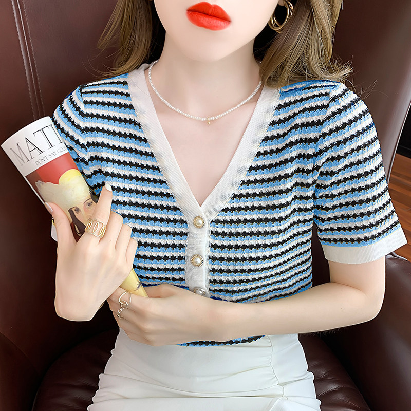 Шелковая летняя футболка, летняя одежда, трикотажный тонкий модный свитер, V-образный вырез, коллекция 2022