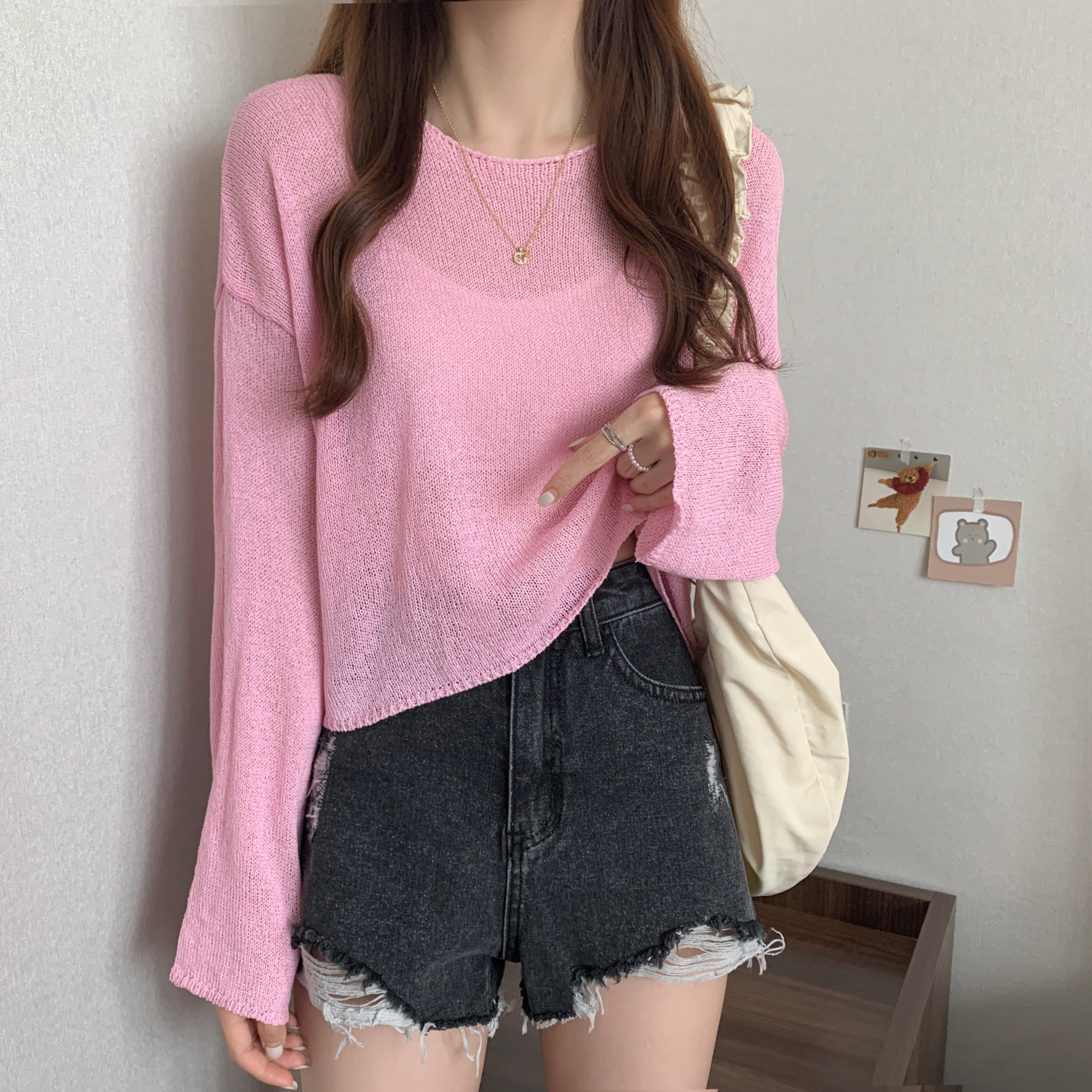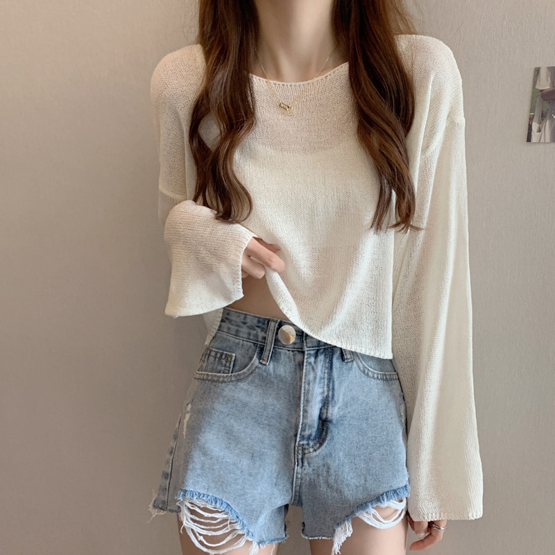 Тонкий трикотажный шелковый белый дизайнерский свитер, короткий лонгслив, свободный крой, тренд сезона, защита от солнца