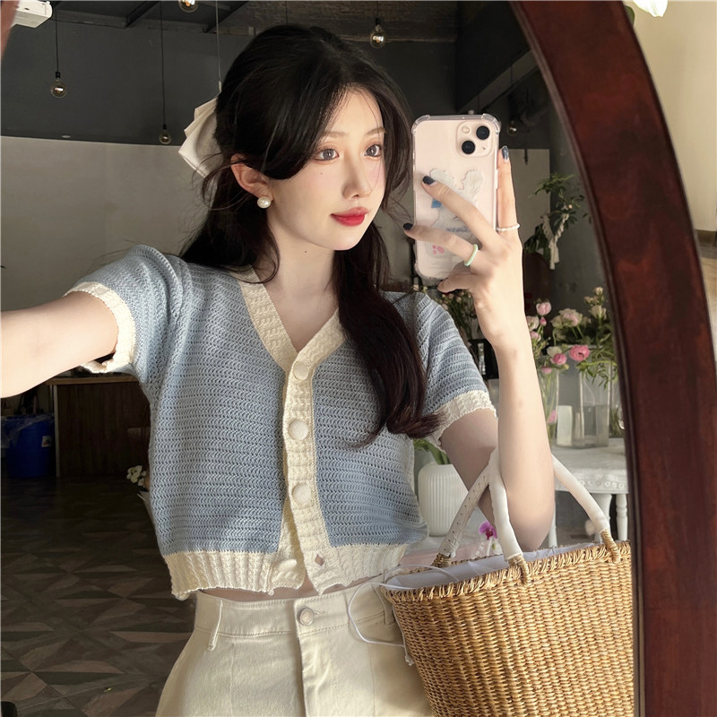 Трикотажный осенний свитер, кардиган, футболка, V-образный вырез, коллекция 2022, короткий рукав