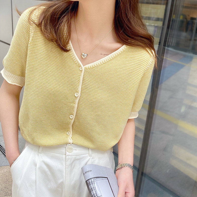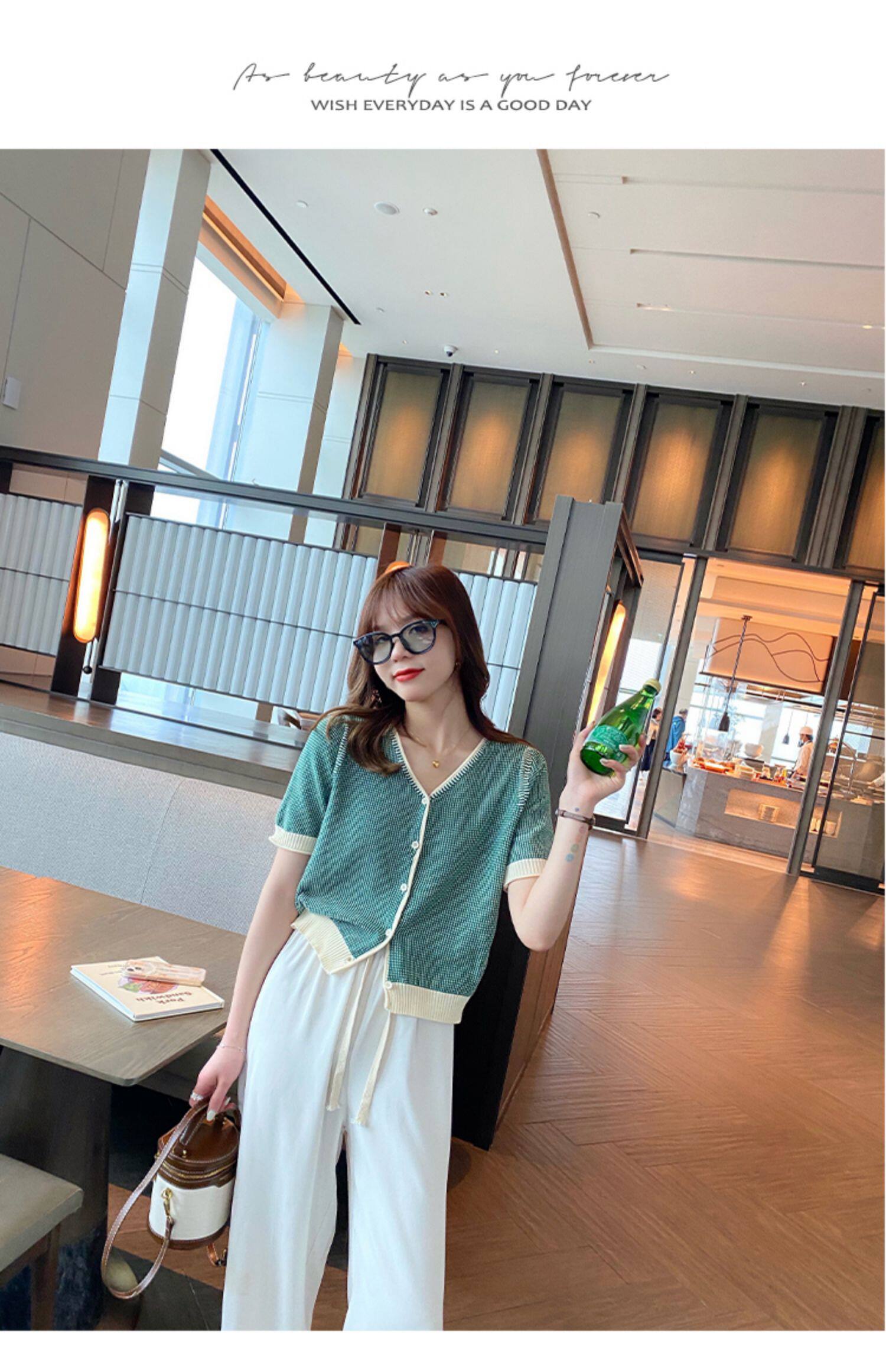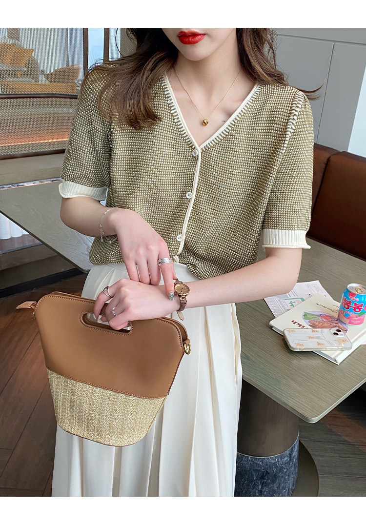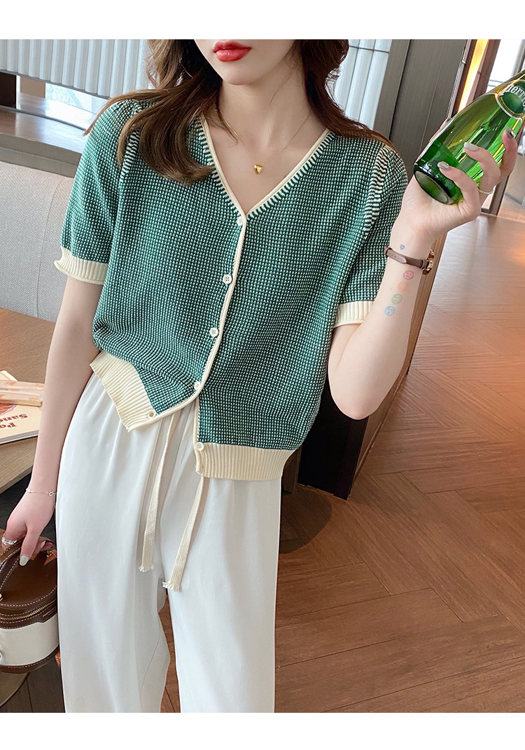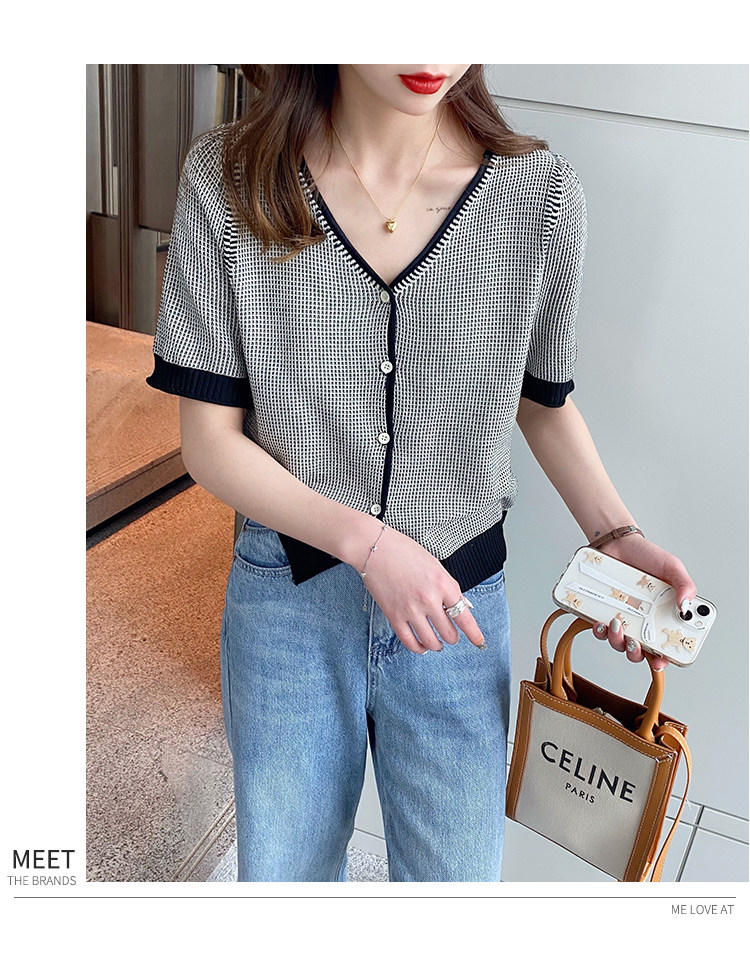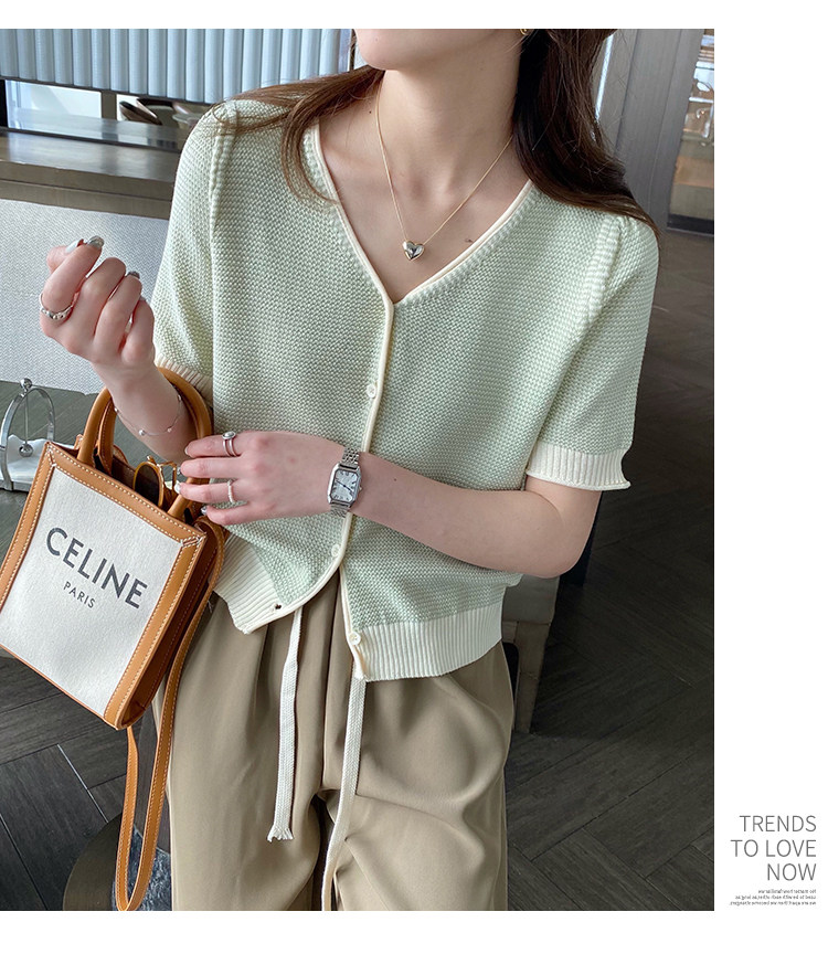 Трикотажный летний тонкий кардиган, шелковая куртка, в стиле Шанель, короткий рукав, коллекция 2023, V-образный вырез