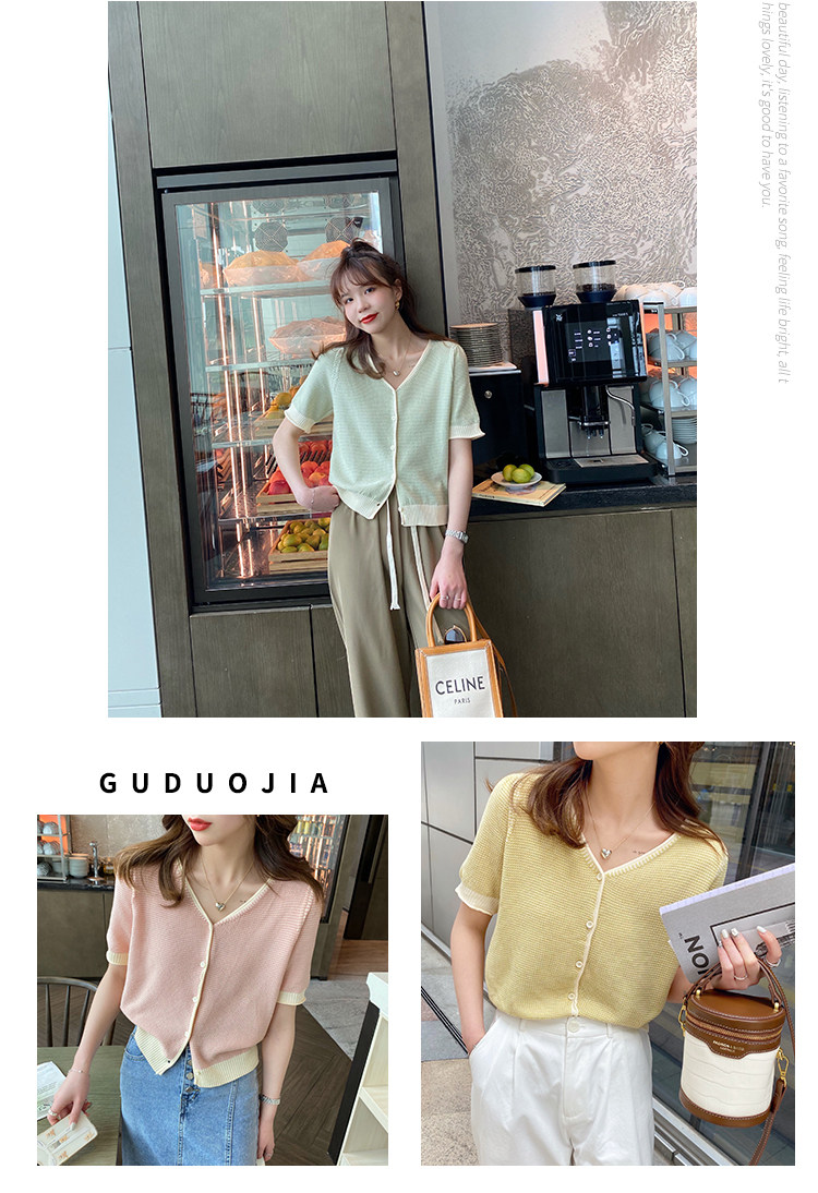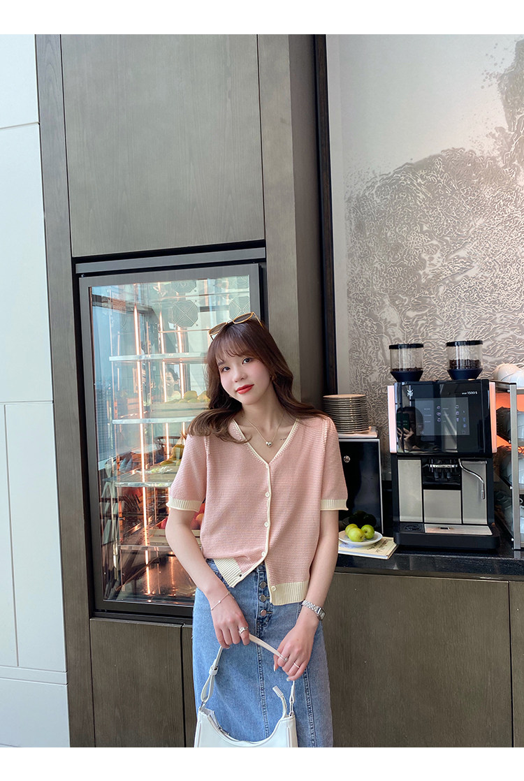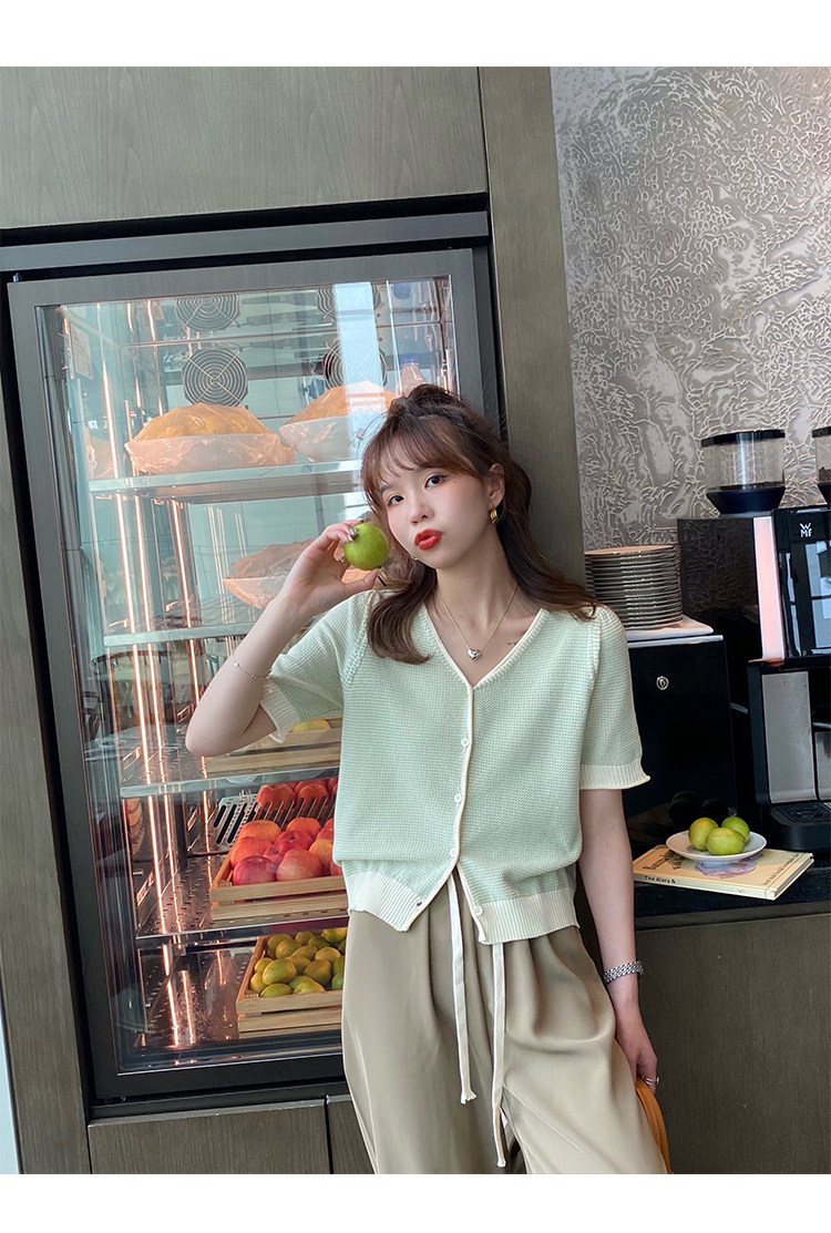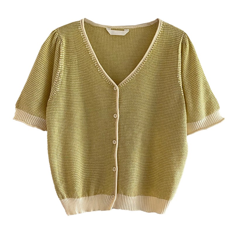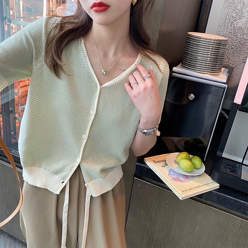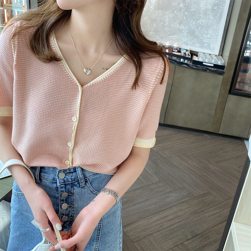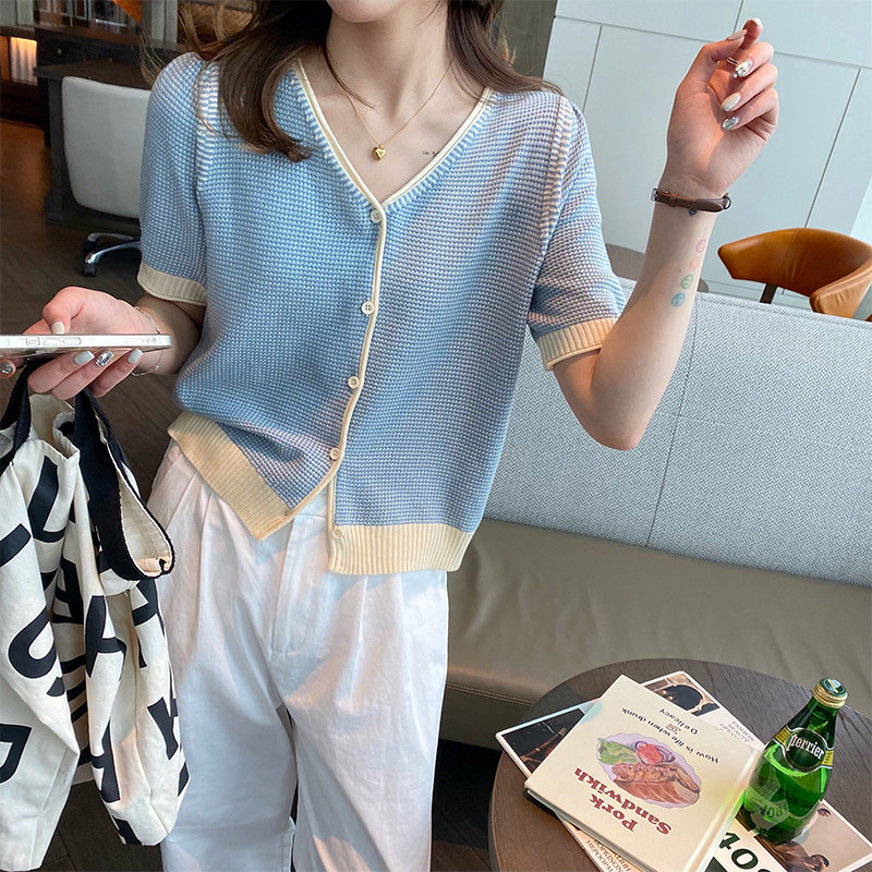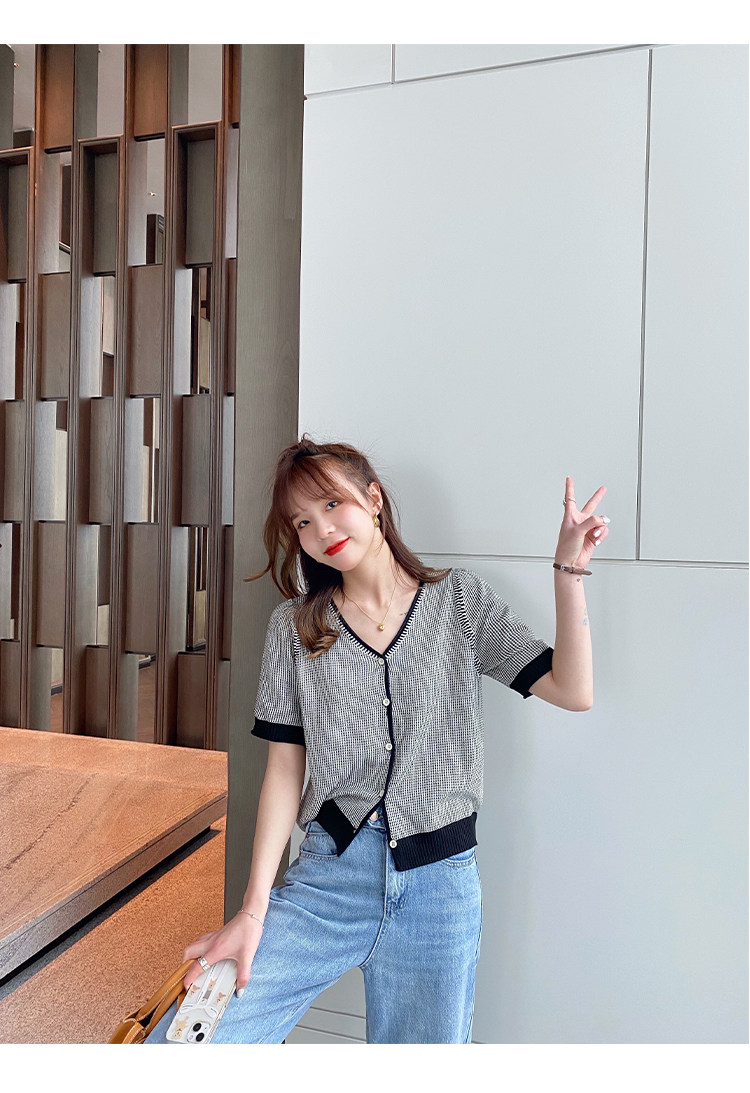 Трикотажный летний тонкий кардиган, шелковая куртка, в стиле Шанель, короткий рукав, коллекция 2023, V-образный вырез