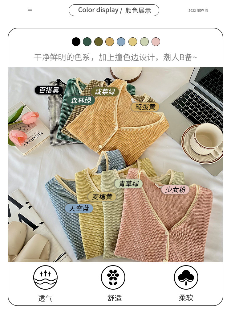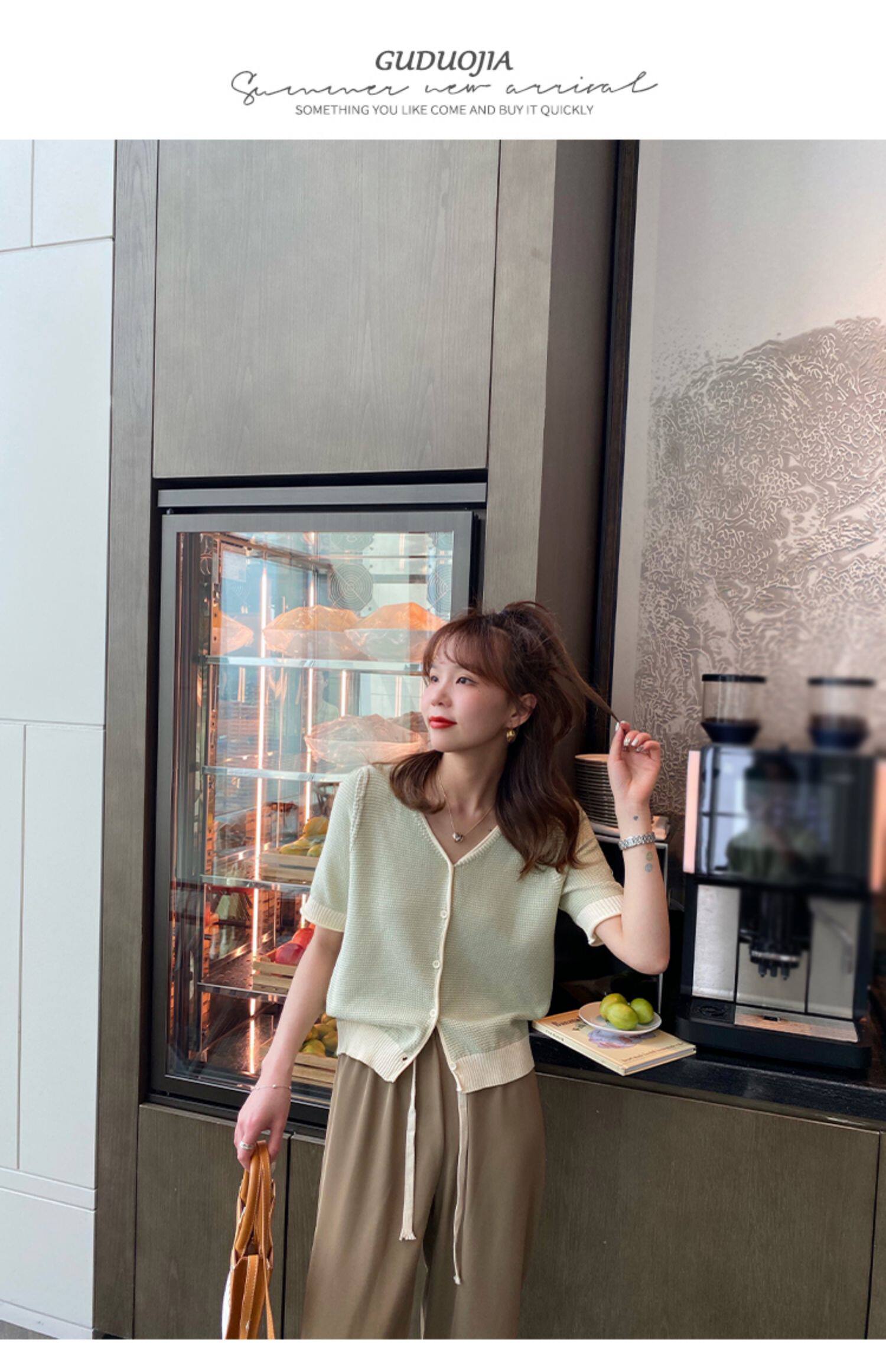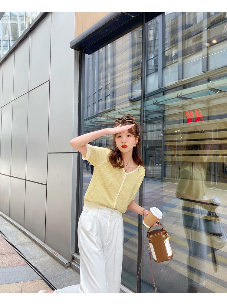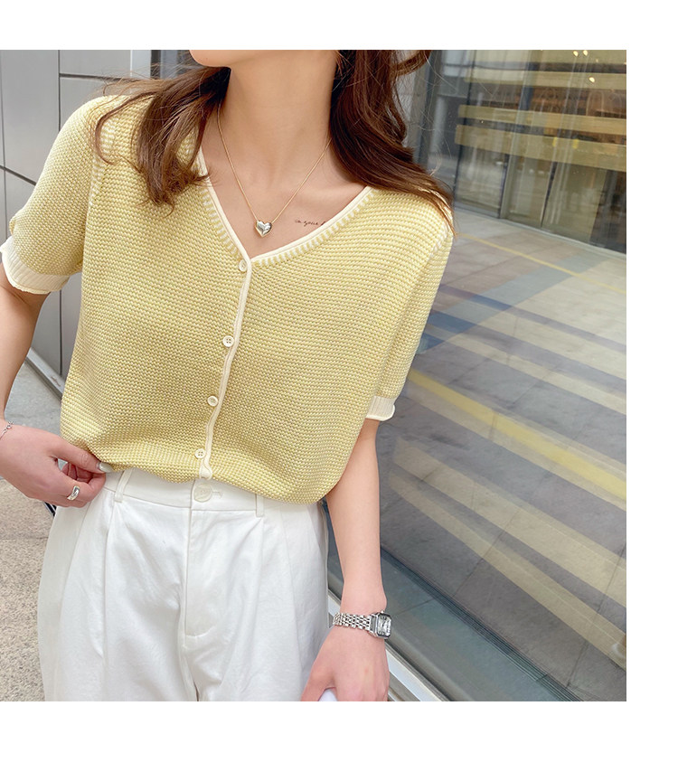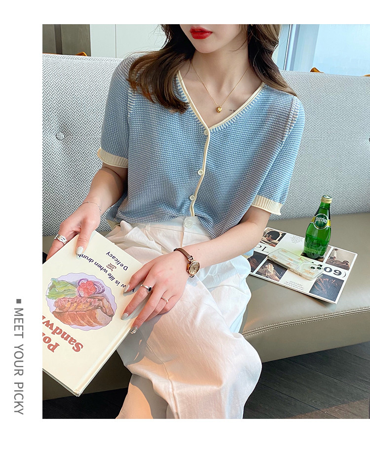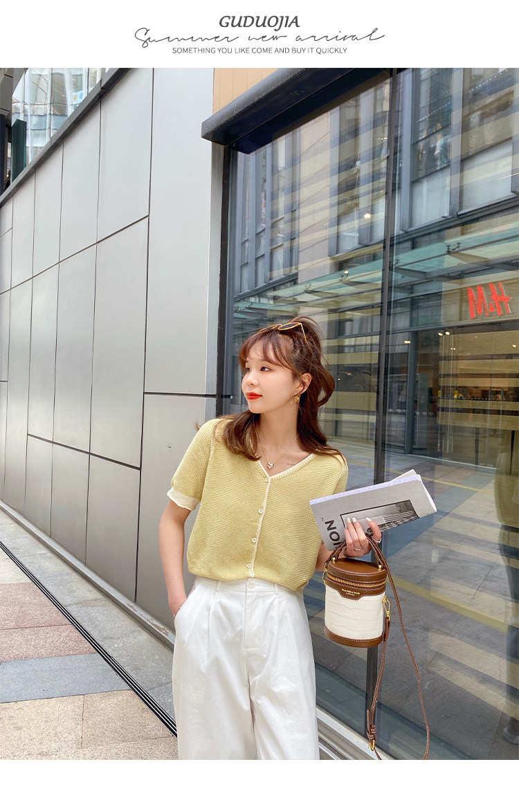 Трикотажный летний тонкий кардиган, шелковая куртка, в стиле Шанель, короткий рукав, коллекция 2023, V-образный вырез