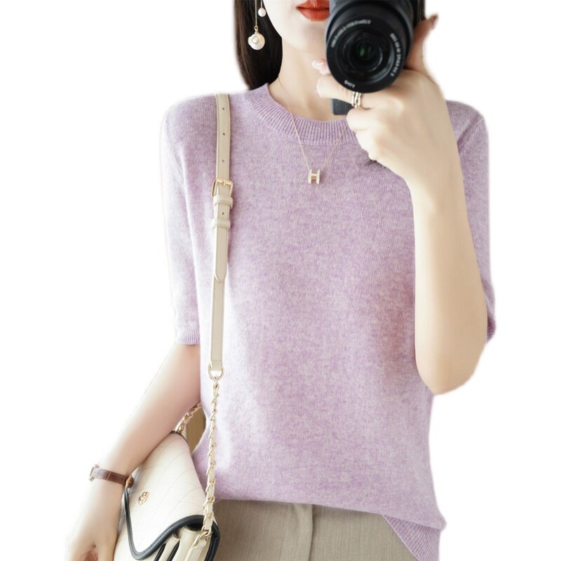 Летний кашемировый шерстяной трикотажный тонкий свитер с круглым воротником, короткий рукав, в корейском стиле