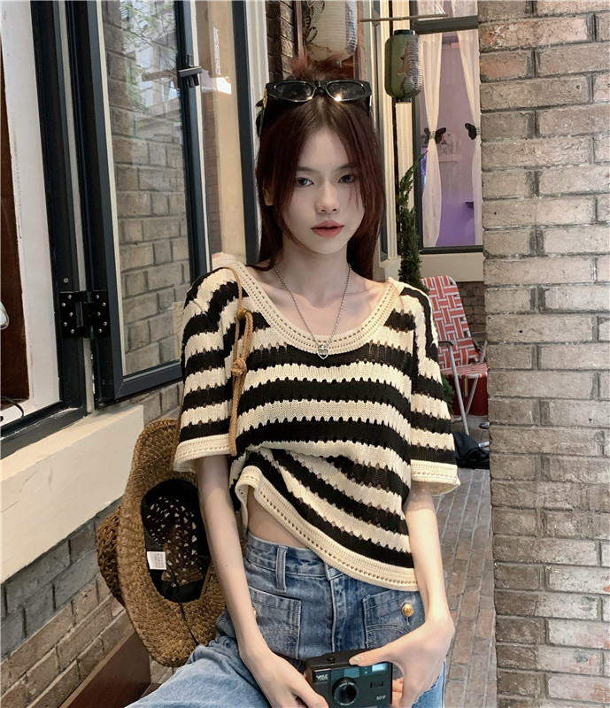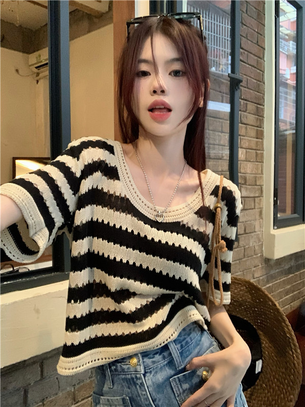 Трикотажный летний тонкий свитер, дизайнерская короткая брендовая футболка с коротким рукавом, тренд сезона