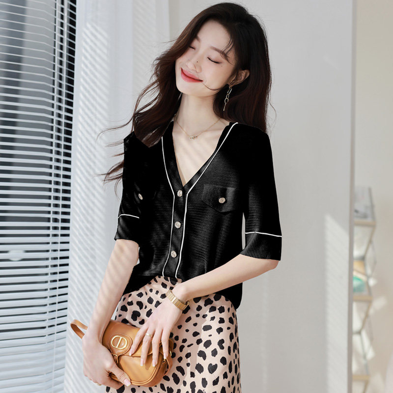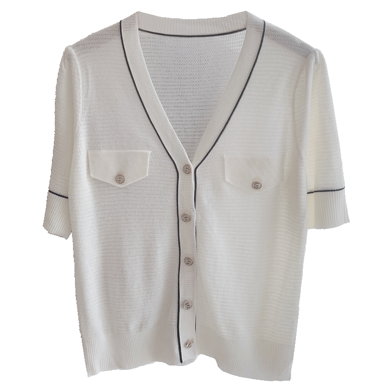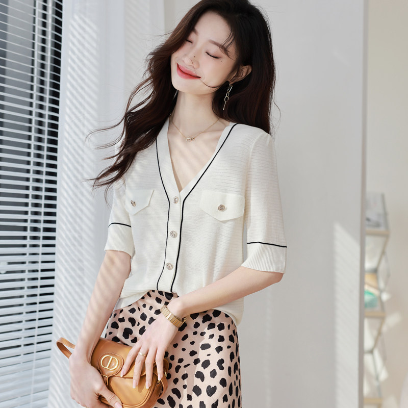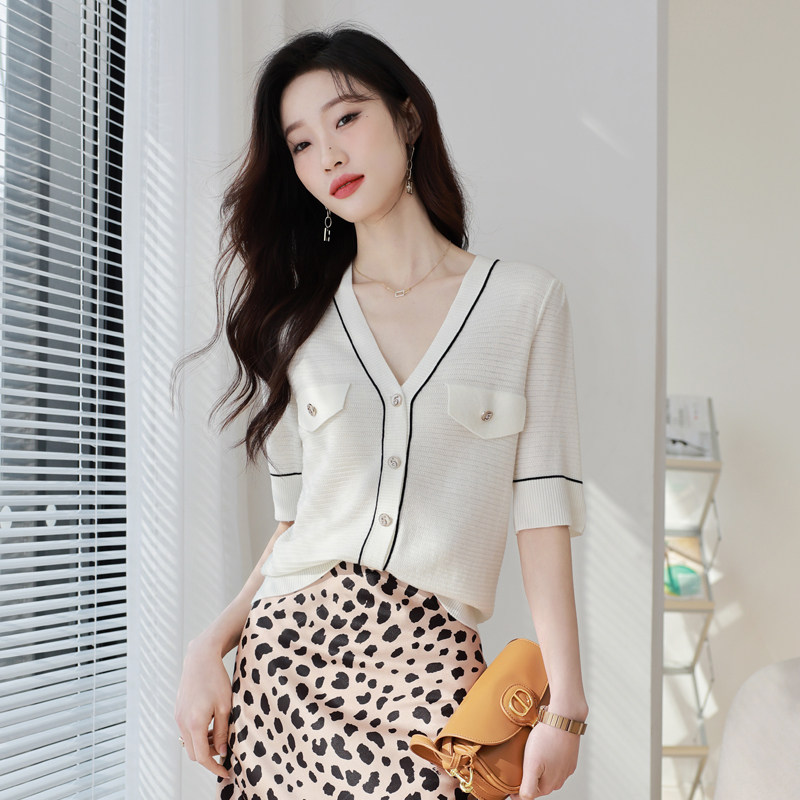 Летняя футболка, трикотажный кардиган, тонкая куртка, в стиле Шанель, короткий рукав, изысканный стиль, V-образный вырез