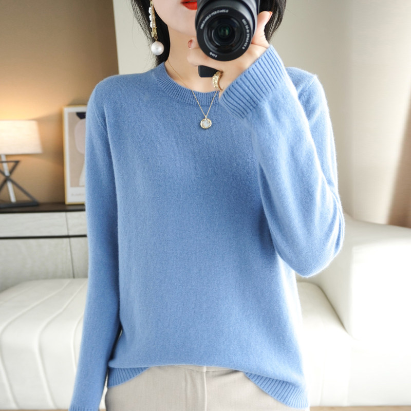 Кашемировый осенний трикотажный приталенный шерстяной свитер с круглым воротником