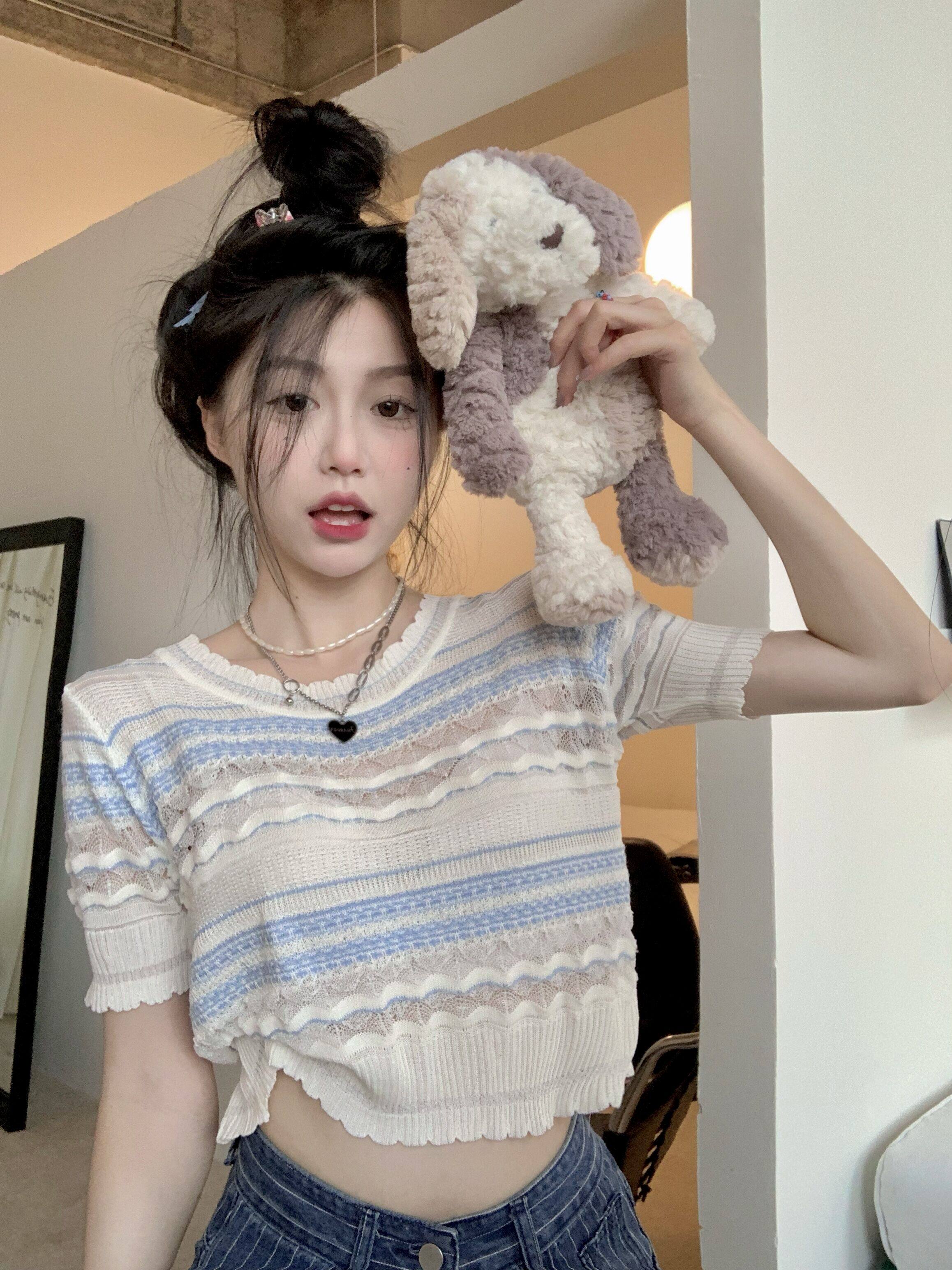 Трикотажный летний дизайнерский свежий свитер с круглым воротником, французский стиль, тренд сезона, короткий рукав