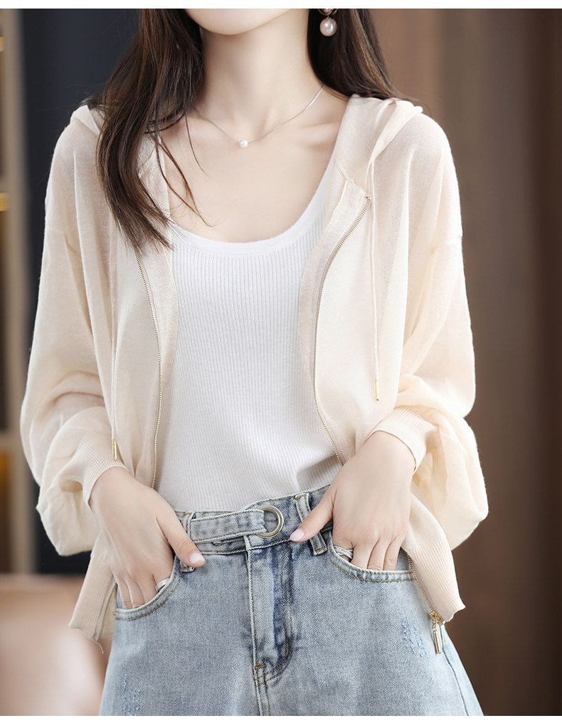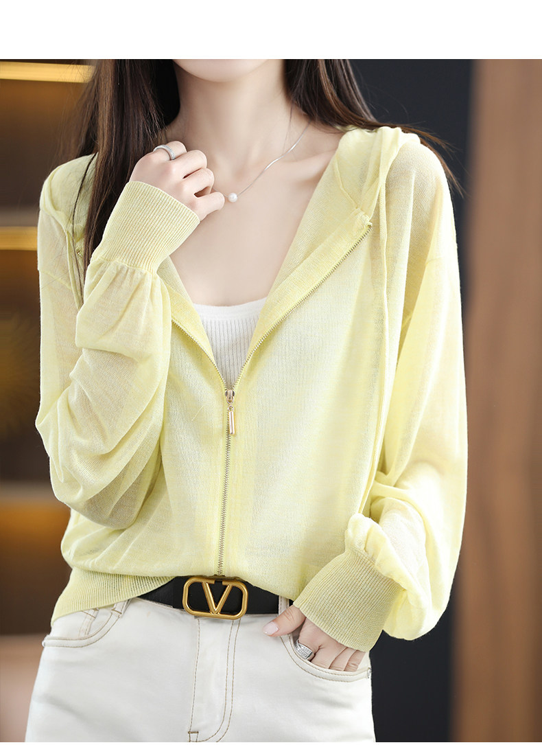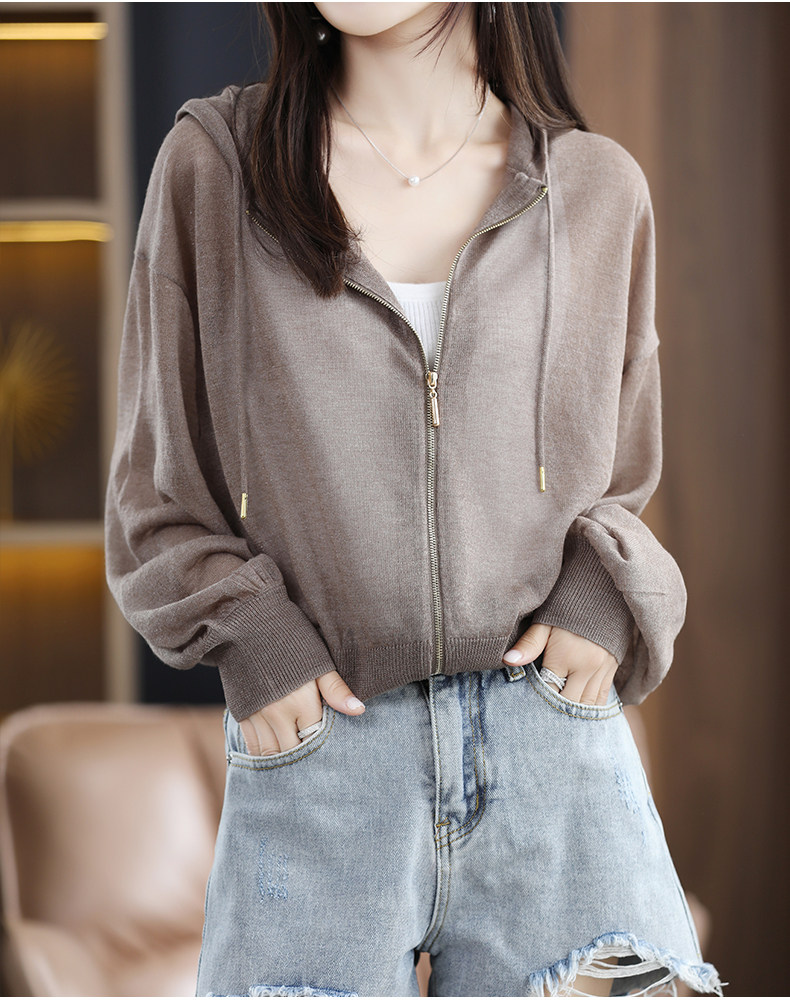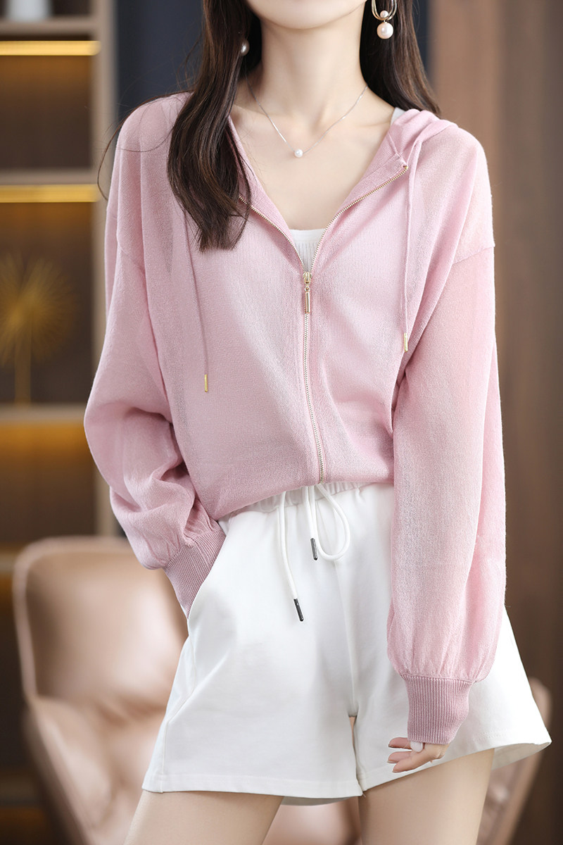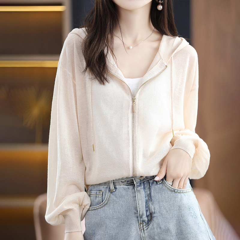 Летняя шелковая толстовка с капюшоном, трикотажный кардиган, рубашка, рукава фонарики, оверсайз