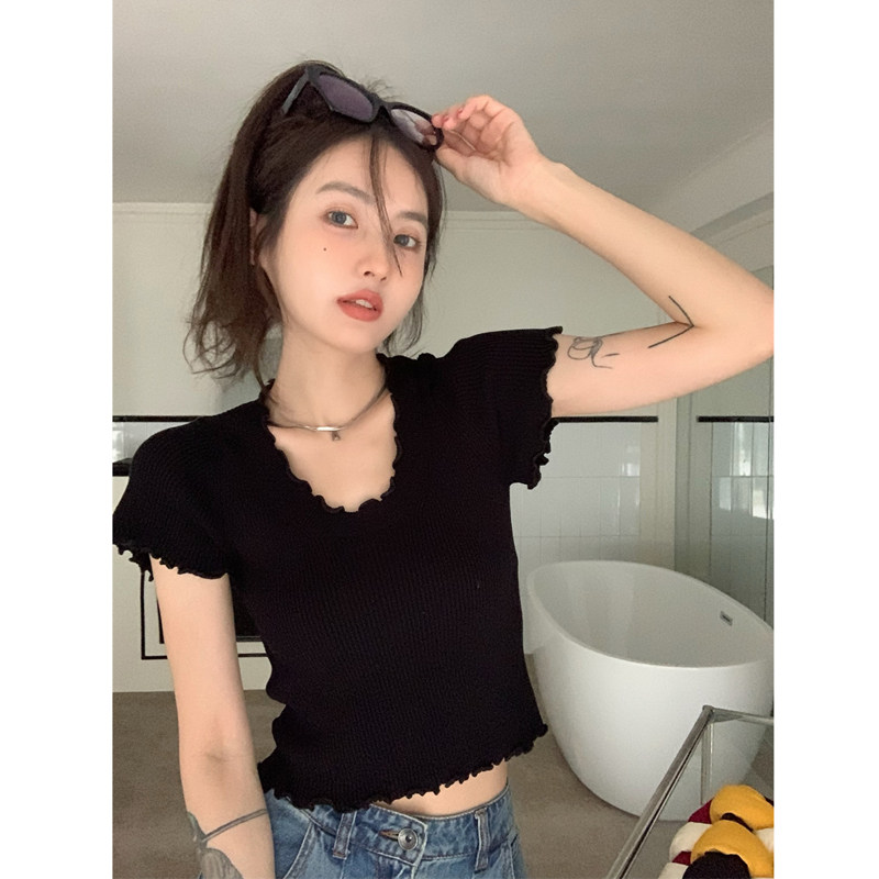 Летний милый короткий однотонный трикотажный свитер с круглым воротником