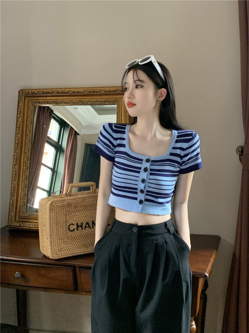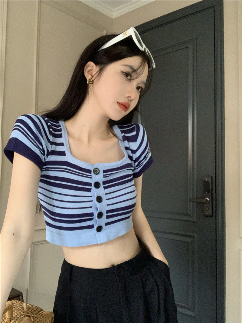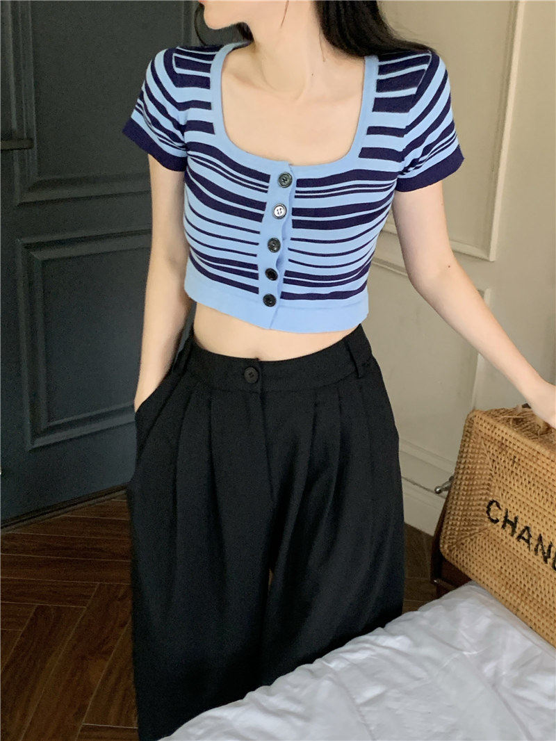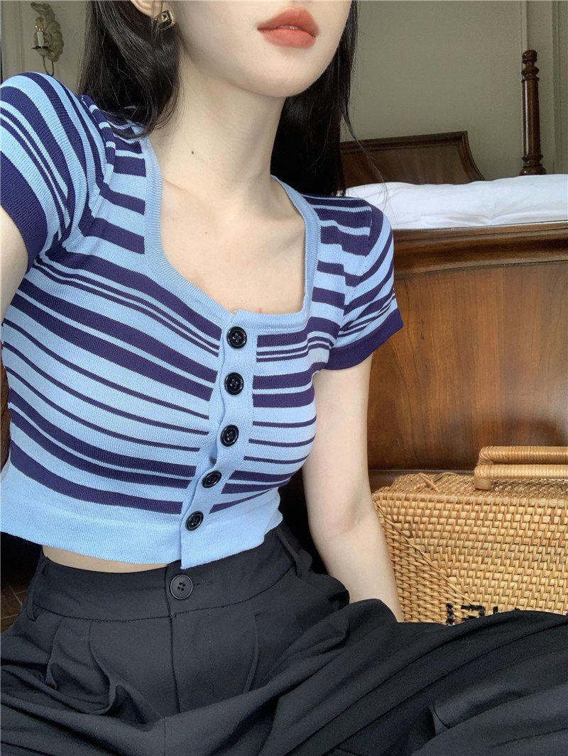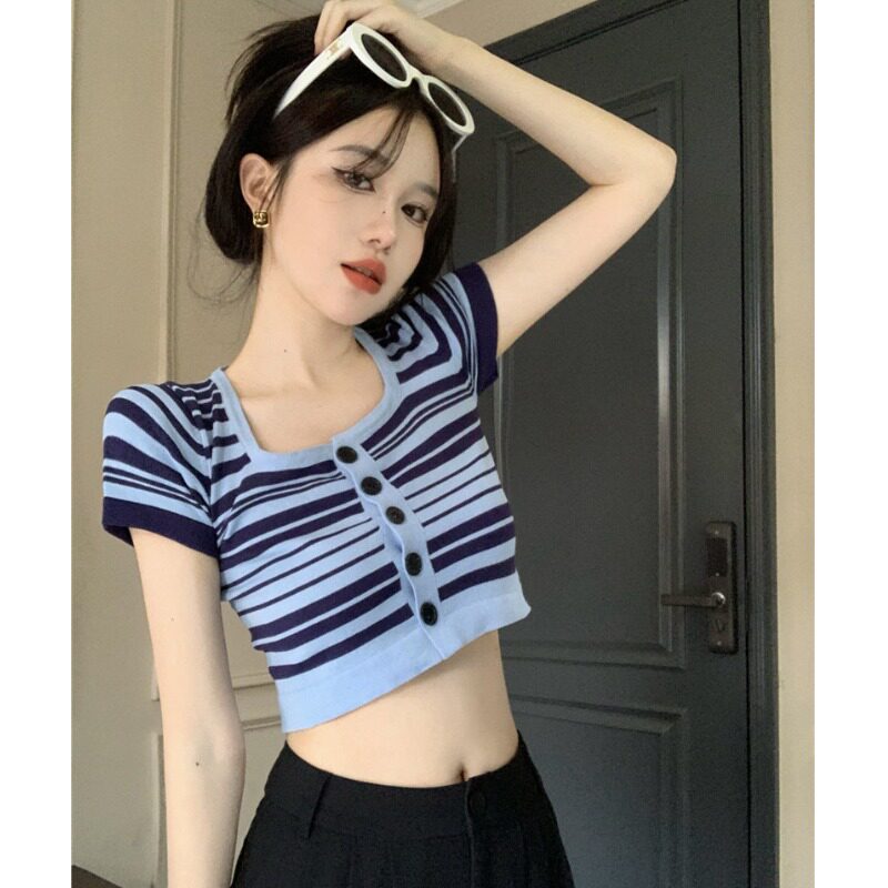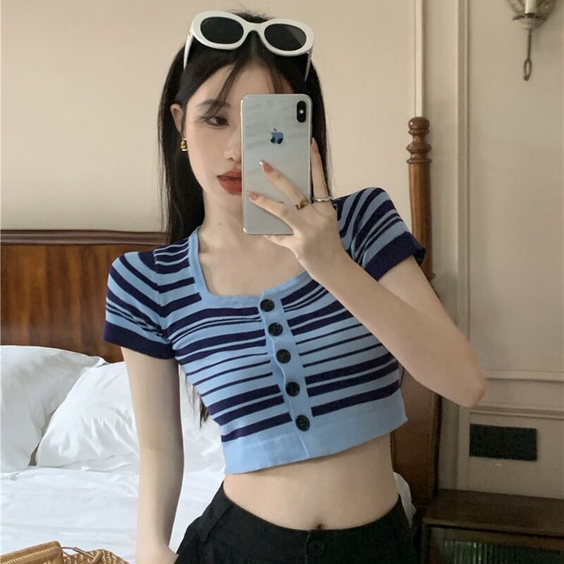Синяя трикотажная летняя шелковая короткая приталенная футболка с коротким рукавом, квадратный вырез