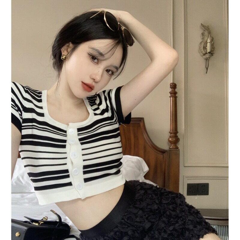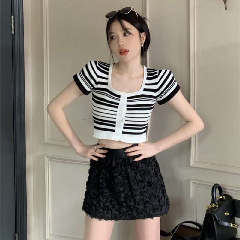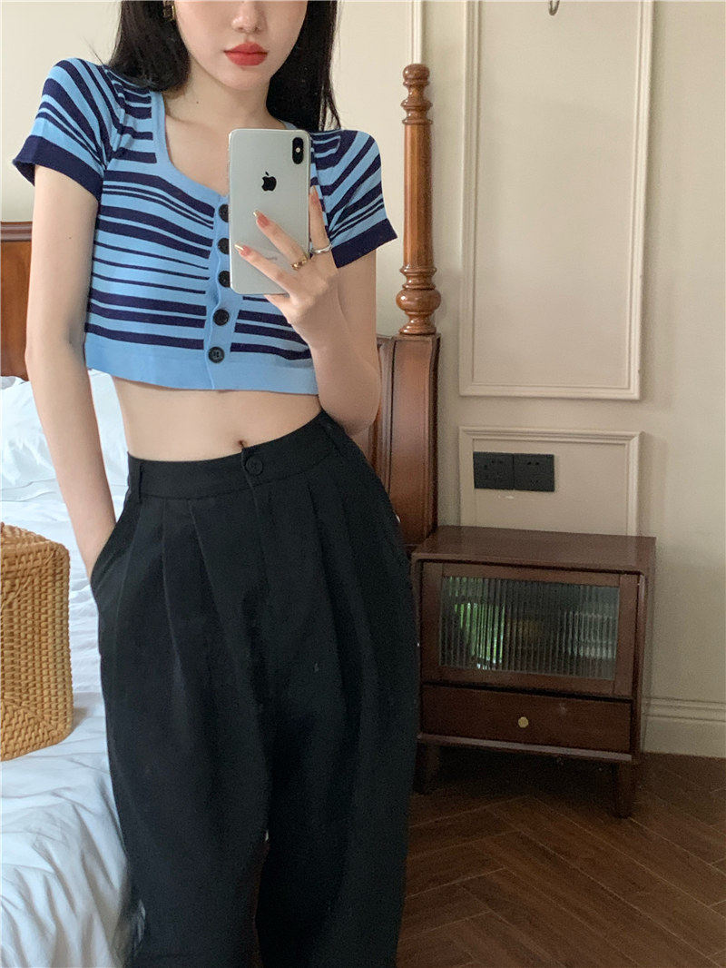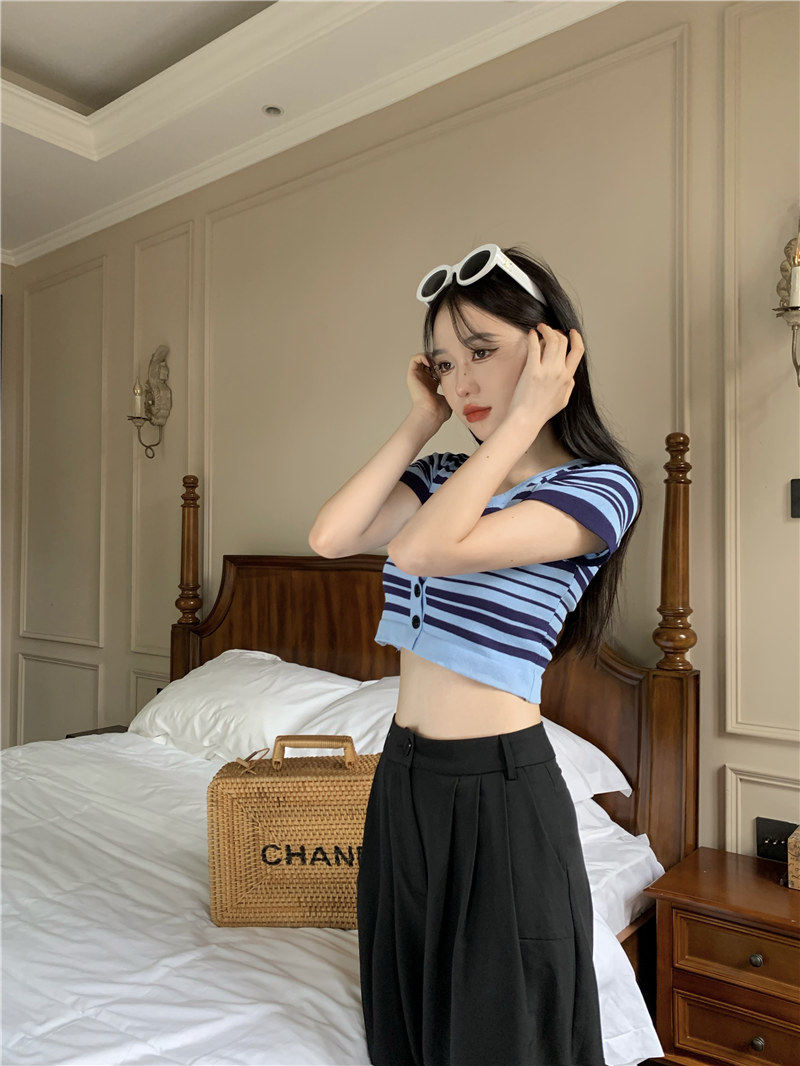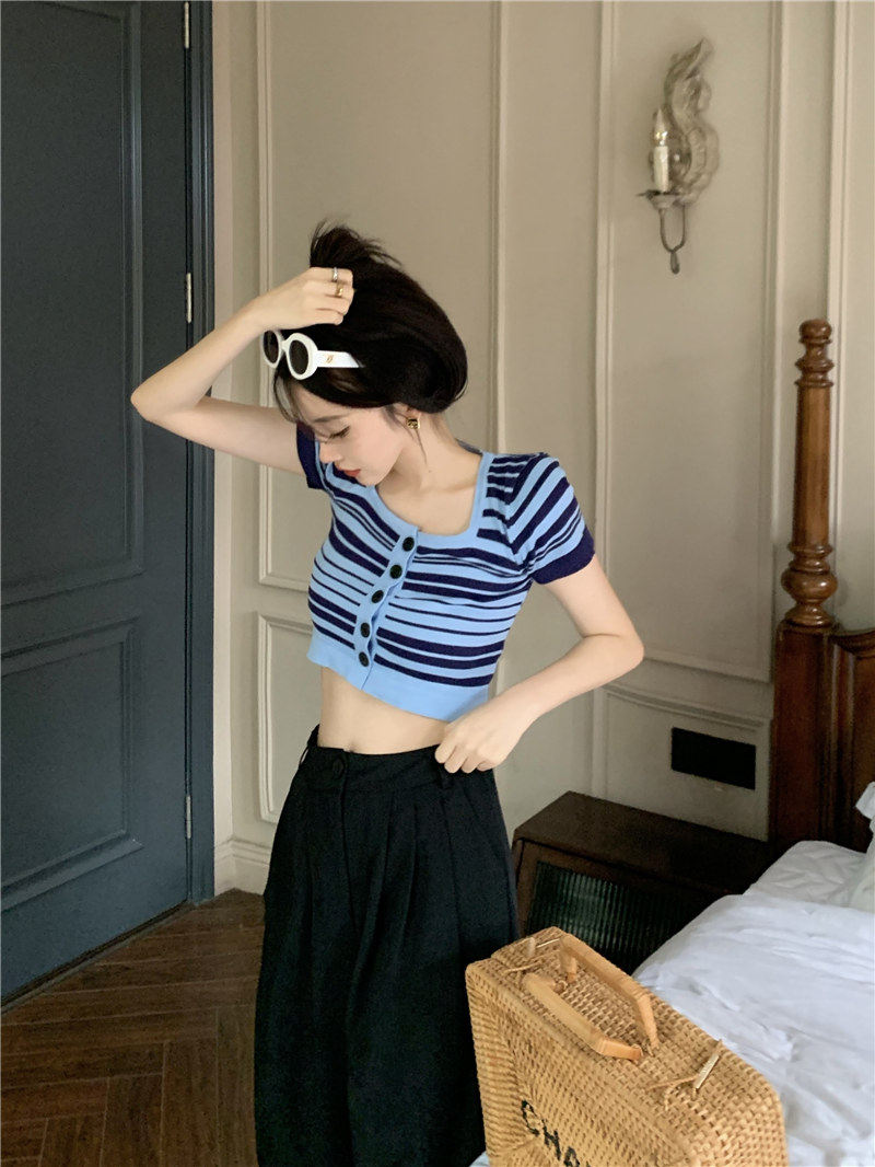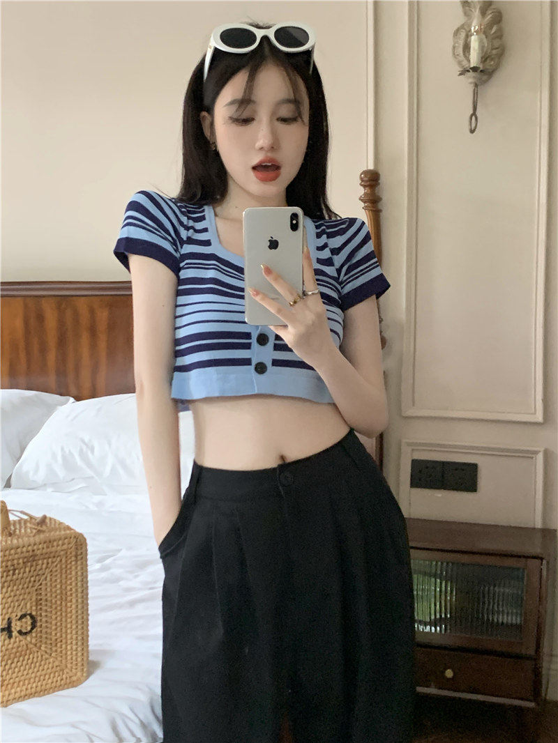 Синяя трикотажная летняя шелковая короткая приталенная футболка с коротким рукавом, квадратный вырез