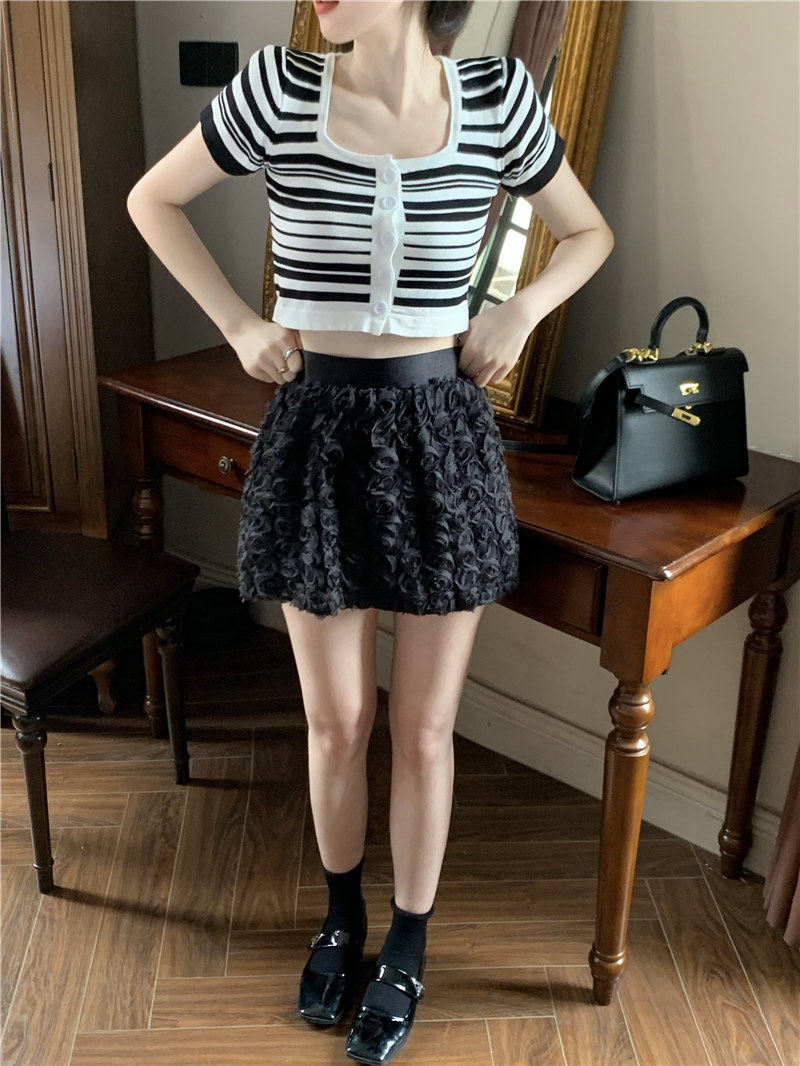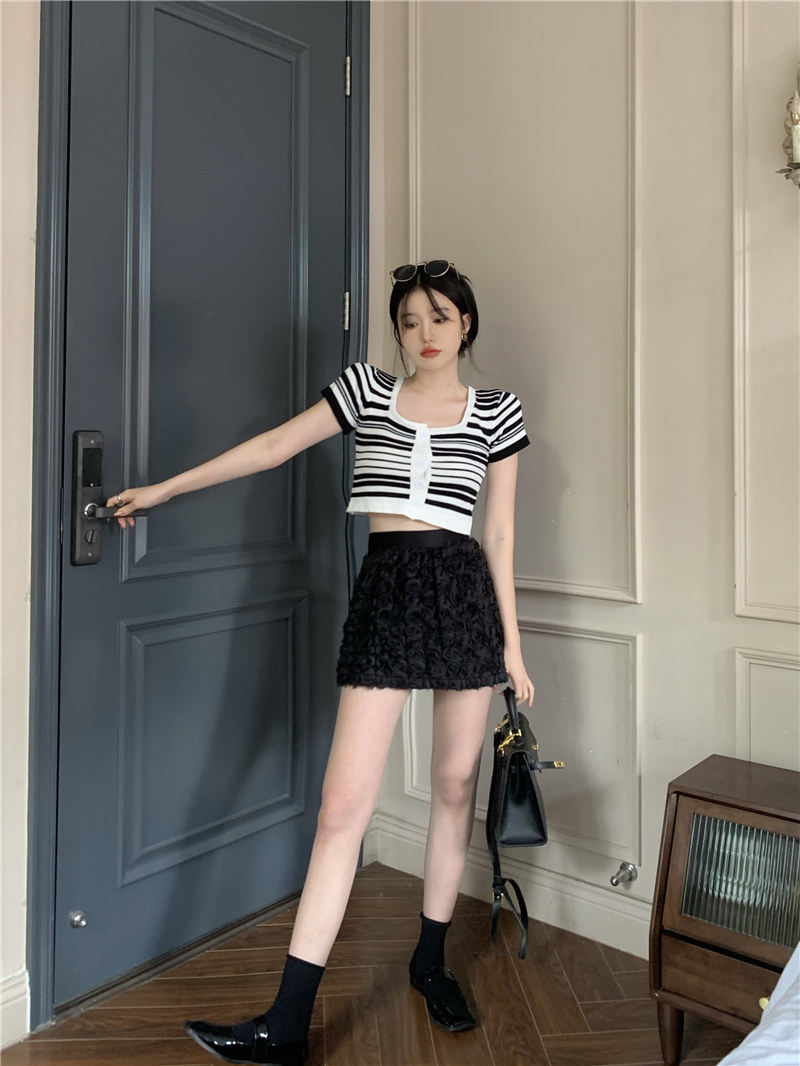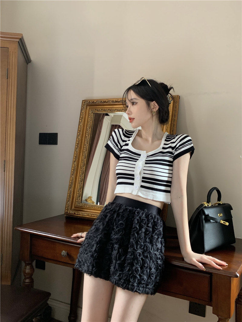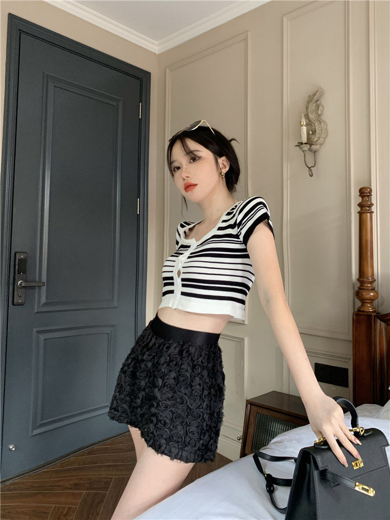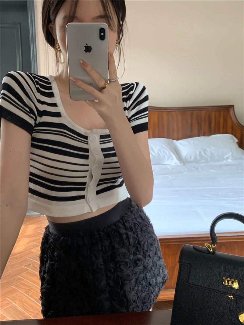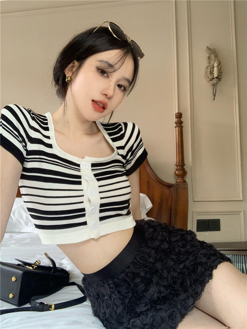 Синяя трикотажная летняя шелковая короткая приталенная футболка с коротким рукавом, квадратный вырез