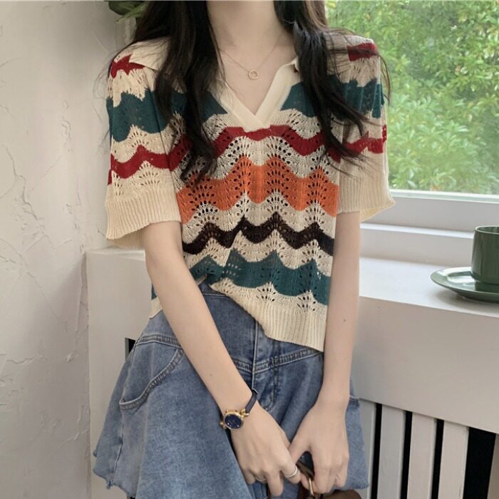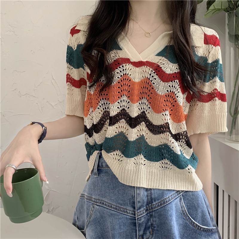 Трикотажная летняя тонкая дизайнерская короткая шелковая футболка polo, V-образный вырез, оверсайз, свободный крой
