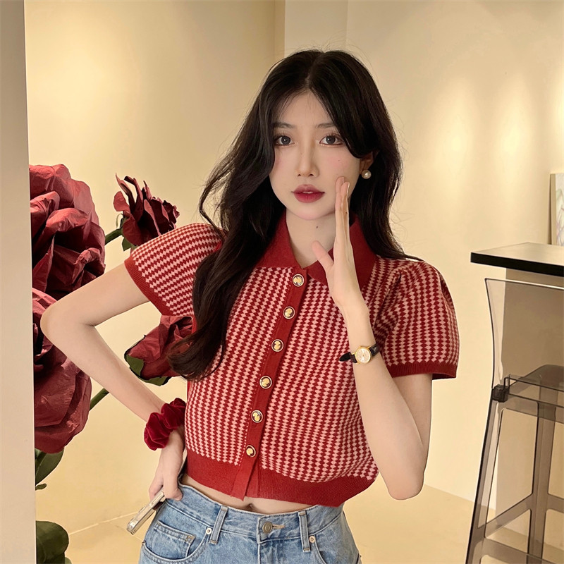 Трикотажный летний кардиган с ромбовидным узором, дизайнерская короткая футболка polo, тренд сезона