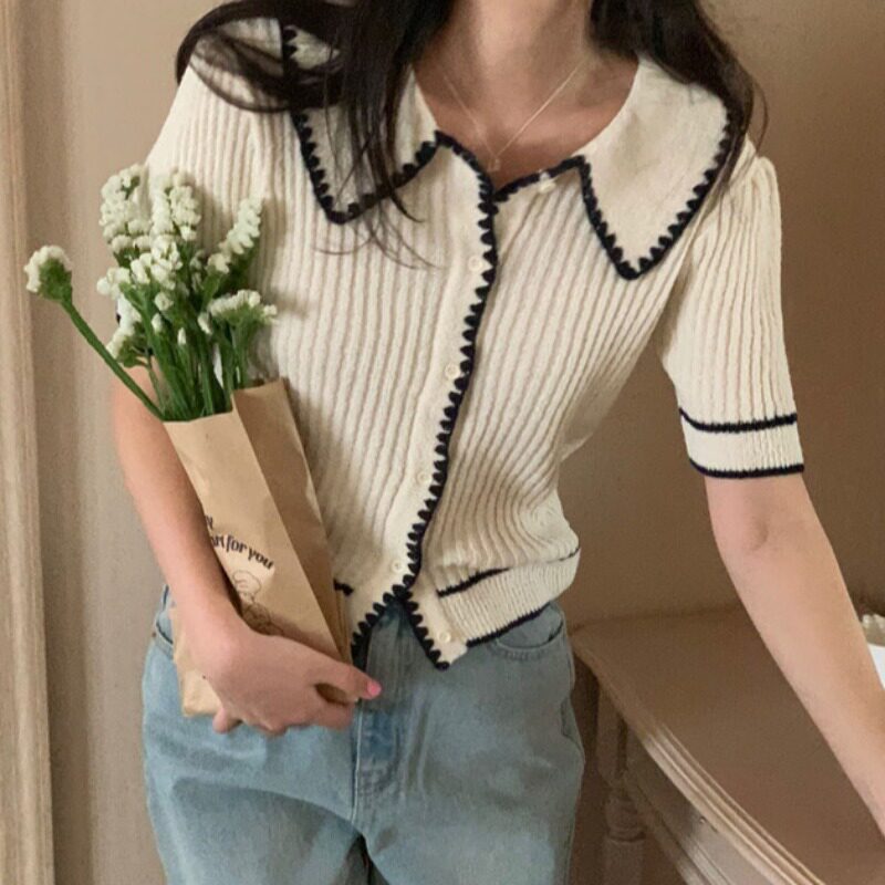 Летний трикотажный короткий кардиган, изысканный стиль, короткий рукав