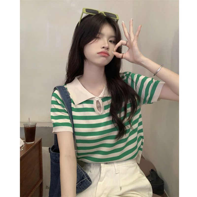 Трикотажный летний приталенный короткий свитер, воротник поло, в корейском стиле, коллекция 2022