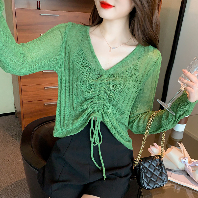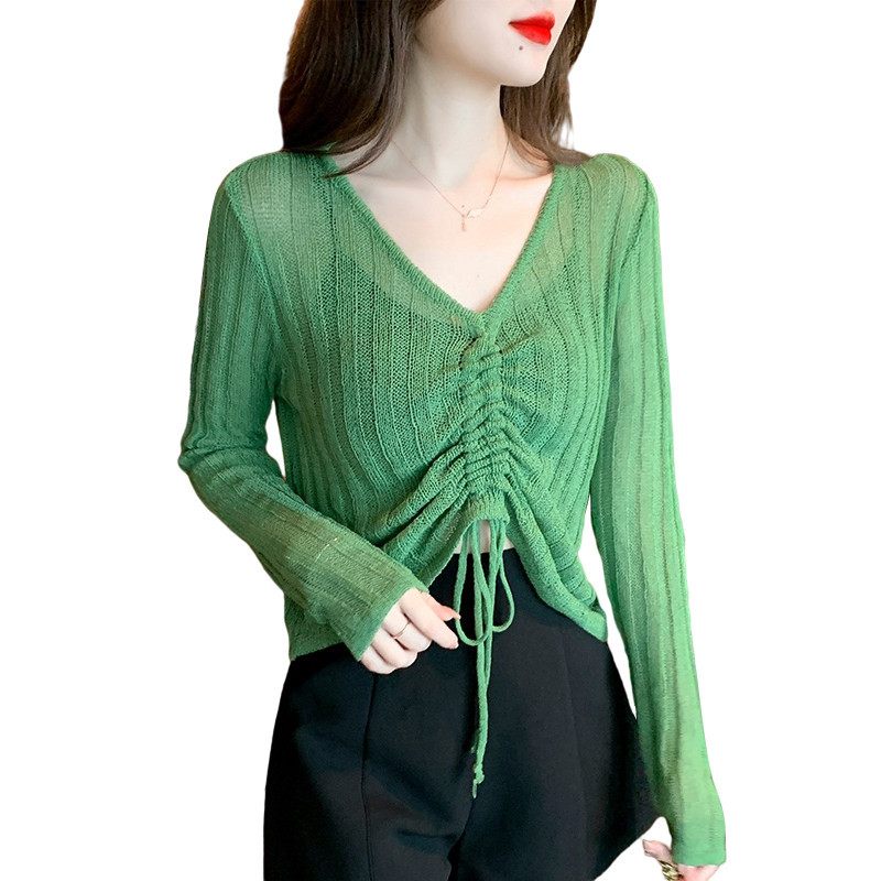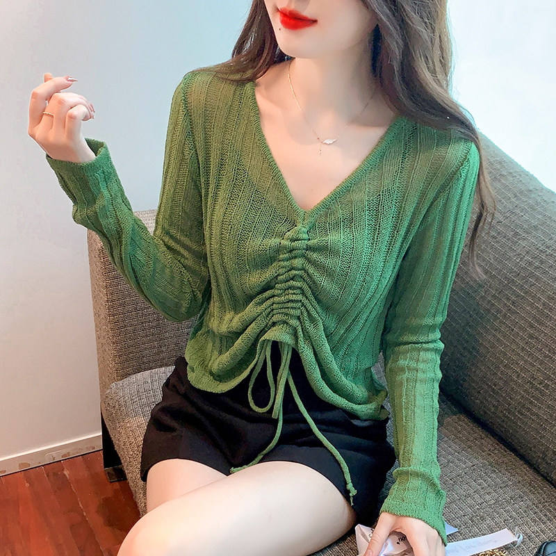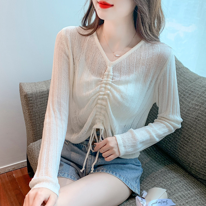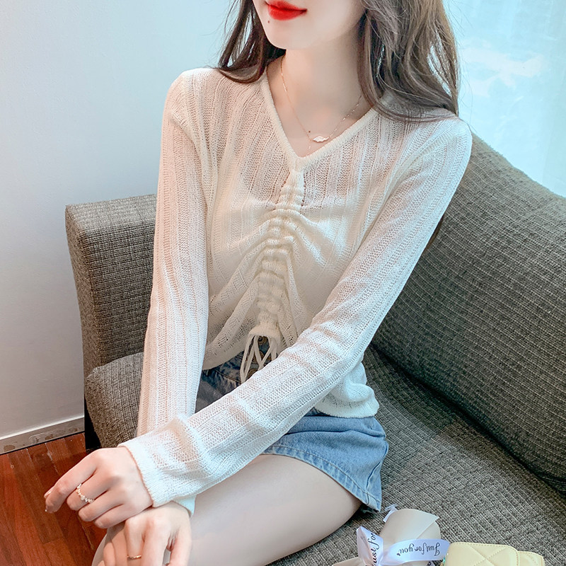 Осенний короткий лонгслив, белый базовый свитер, в корейском стиле, V-образный вырез, на шнурках, облегающий крой