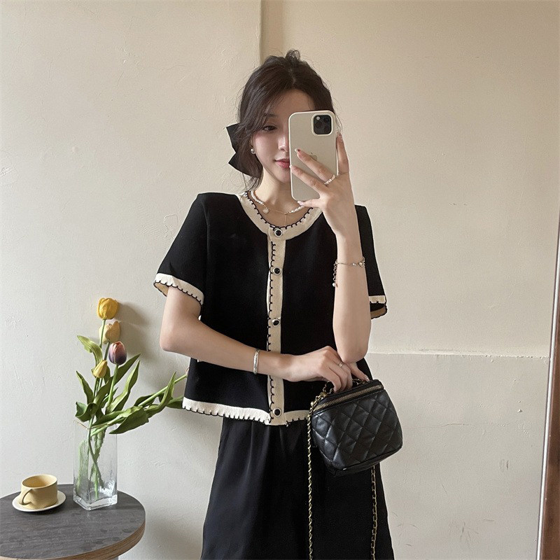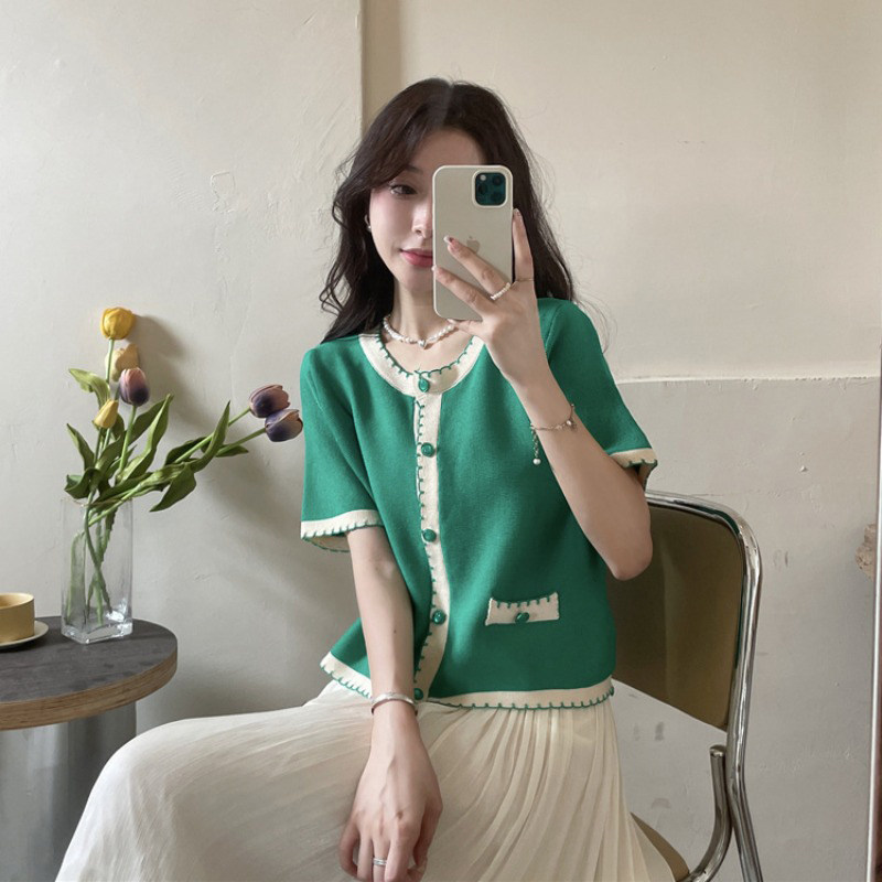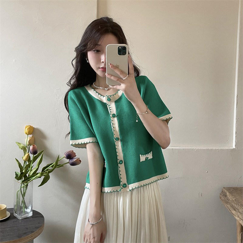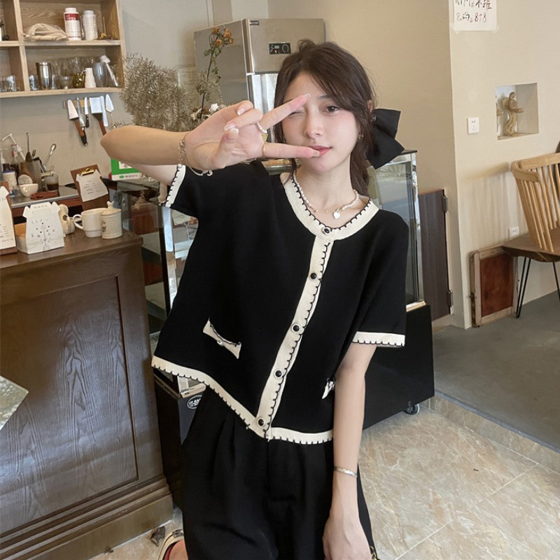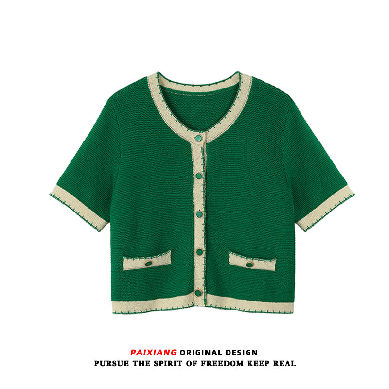 Трикотажный летний свитер, ретро дизайнерский короткий кардиган, в стиле Шанель, V-образный вырез, оверсайз, свободный крой