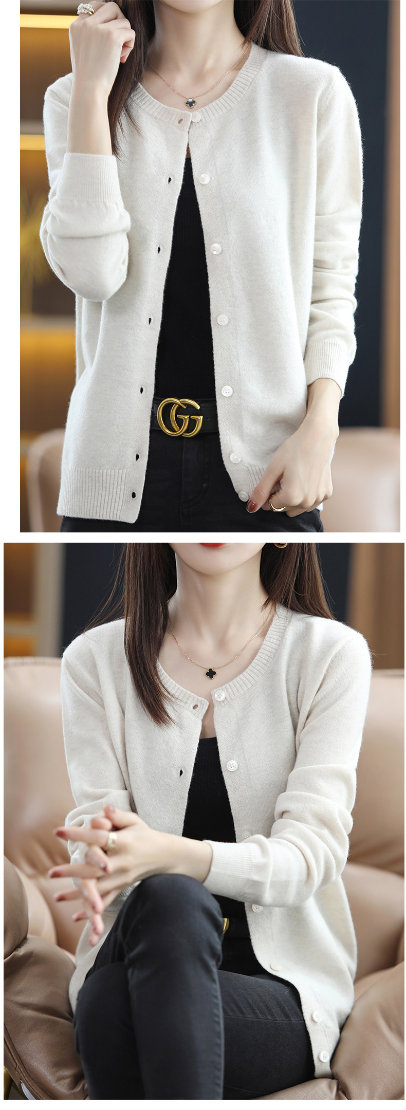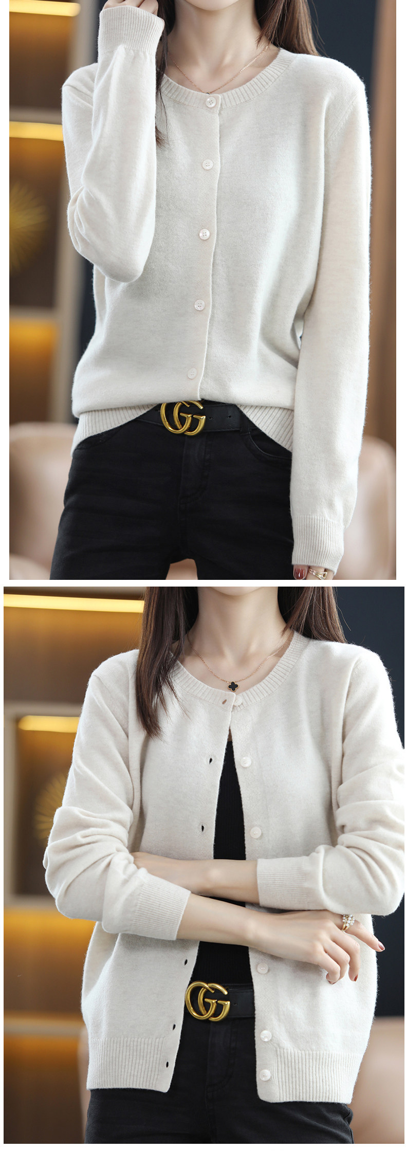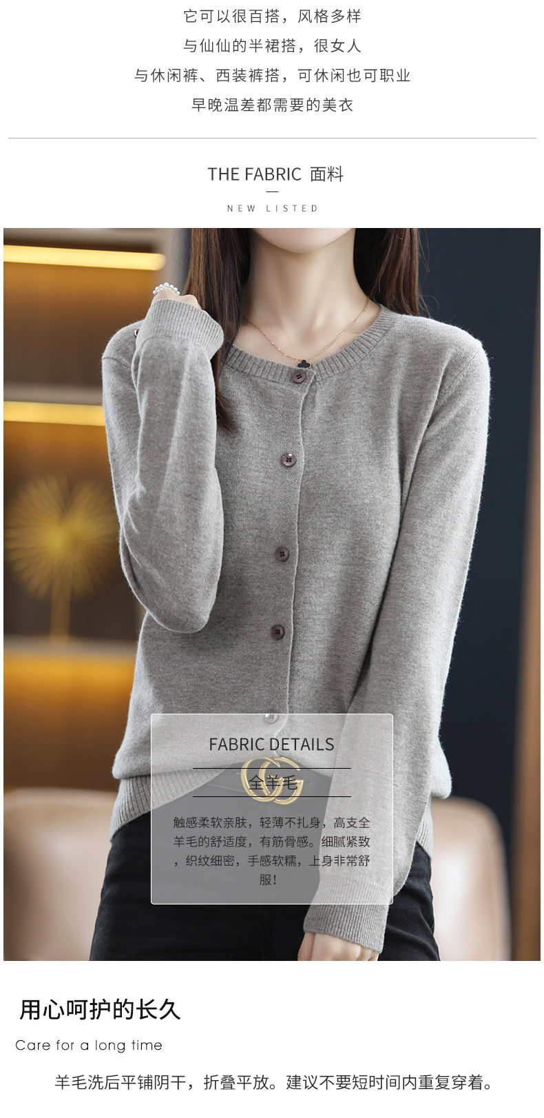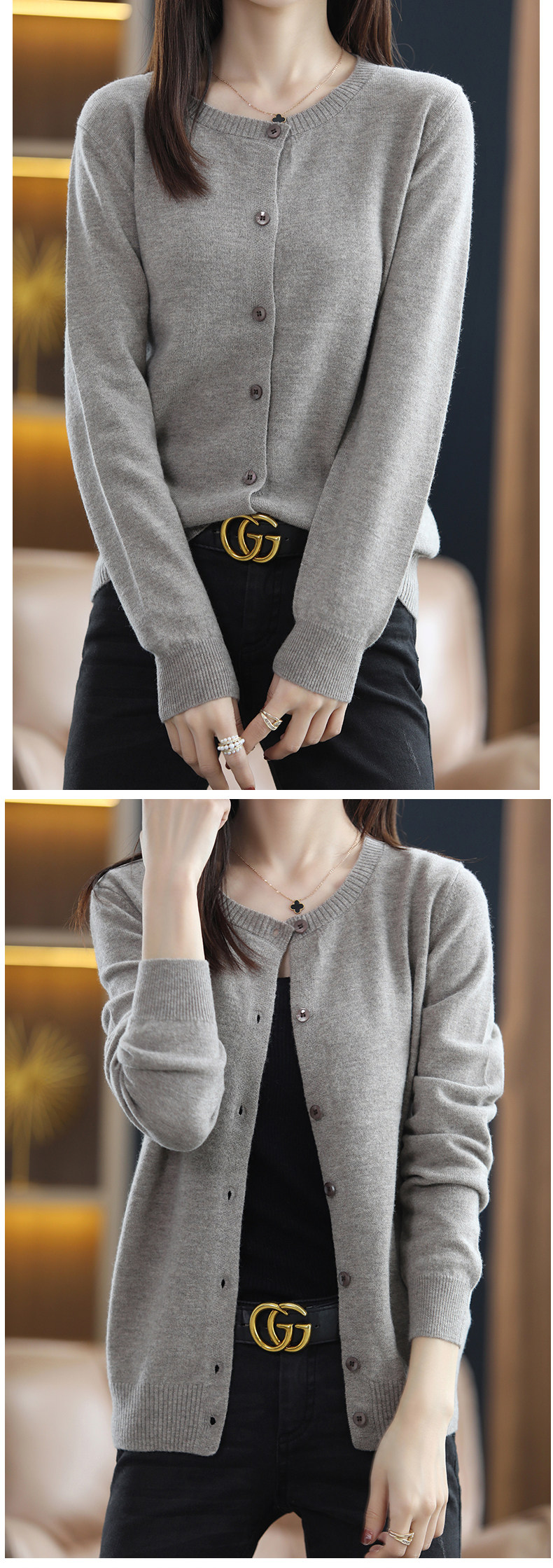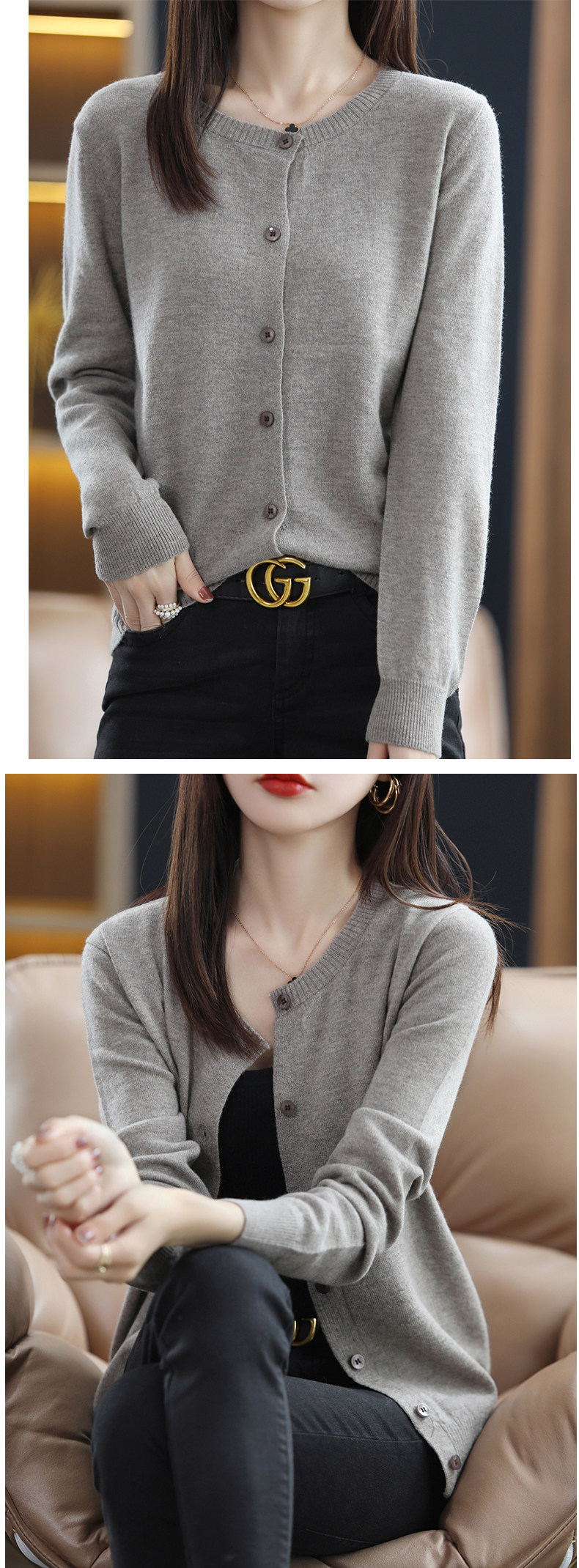 Осенний шерстяной тонкий кардиган, свитер с круглым воротником