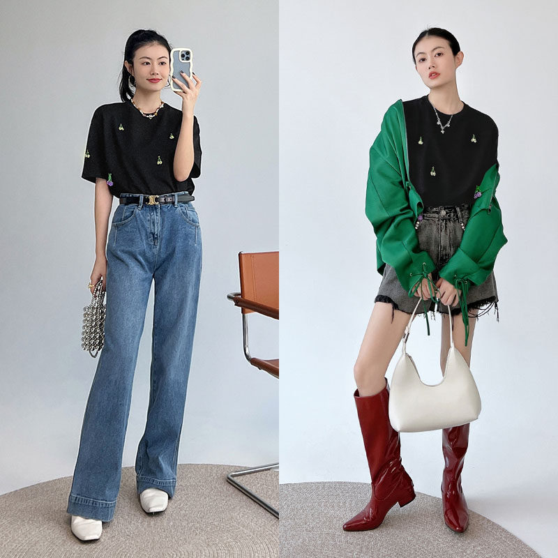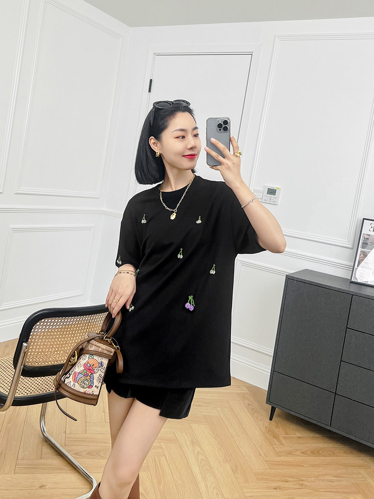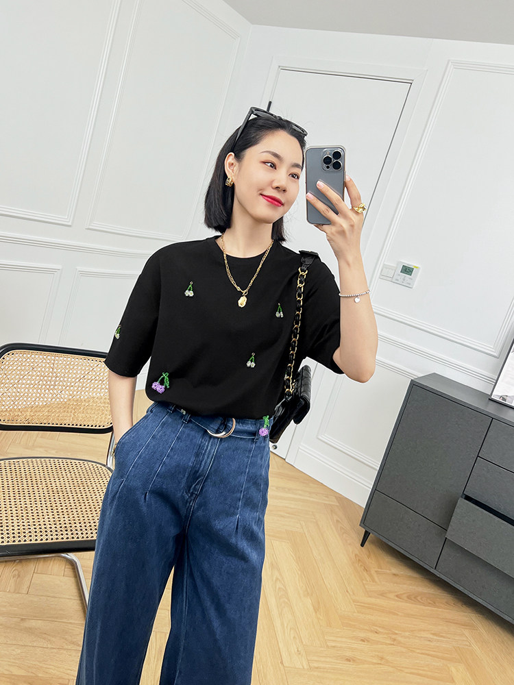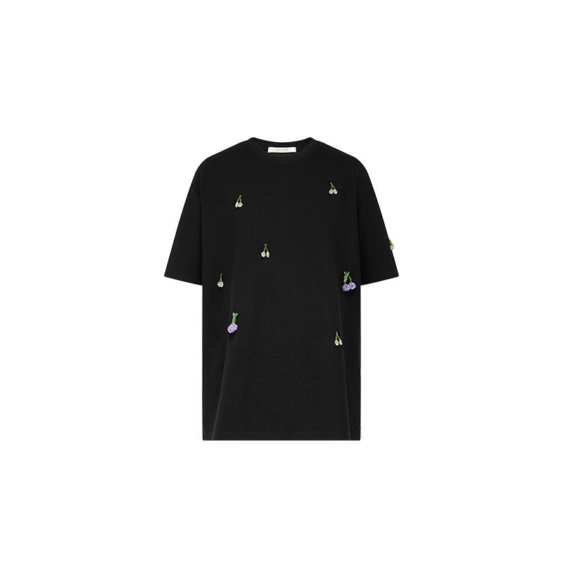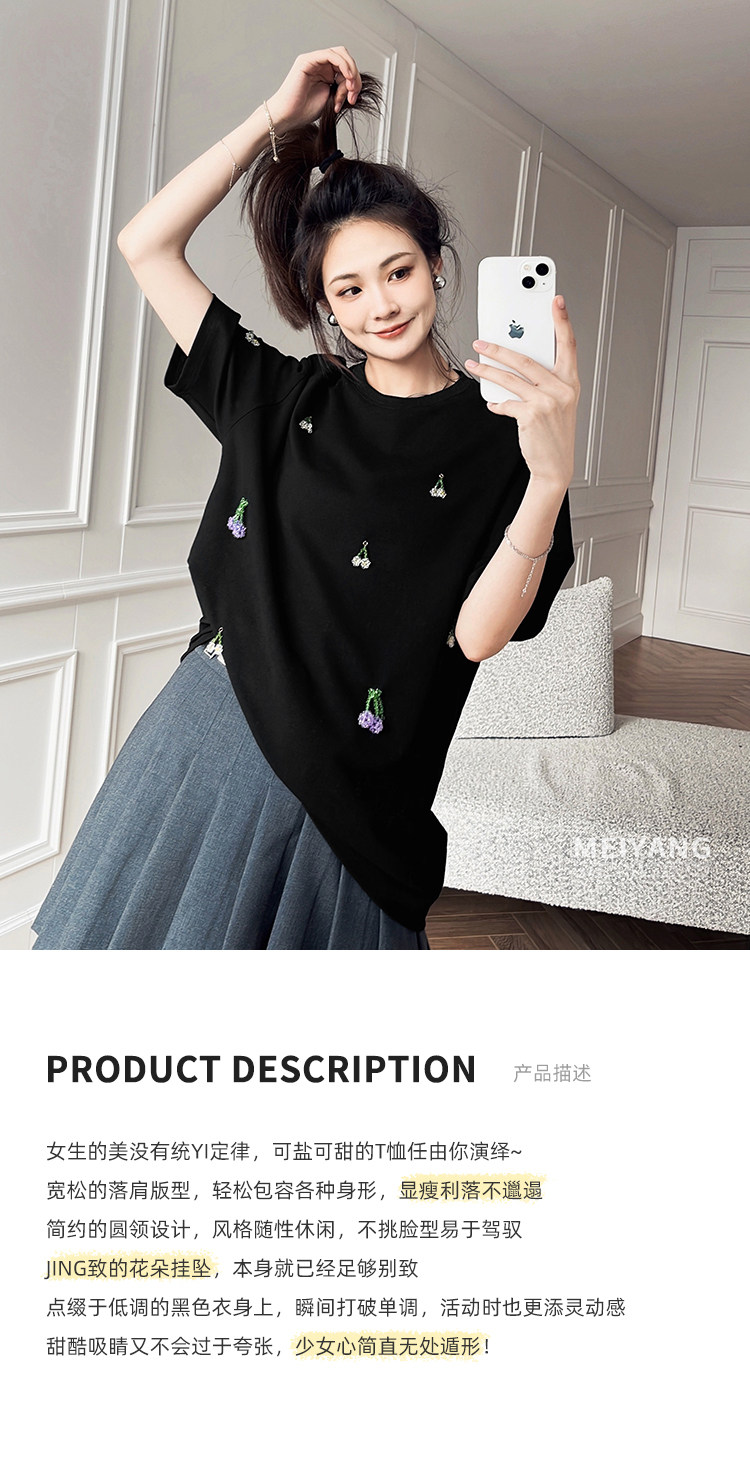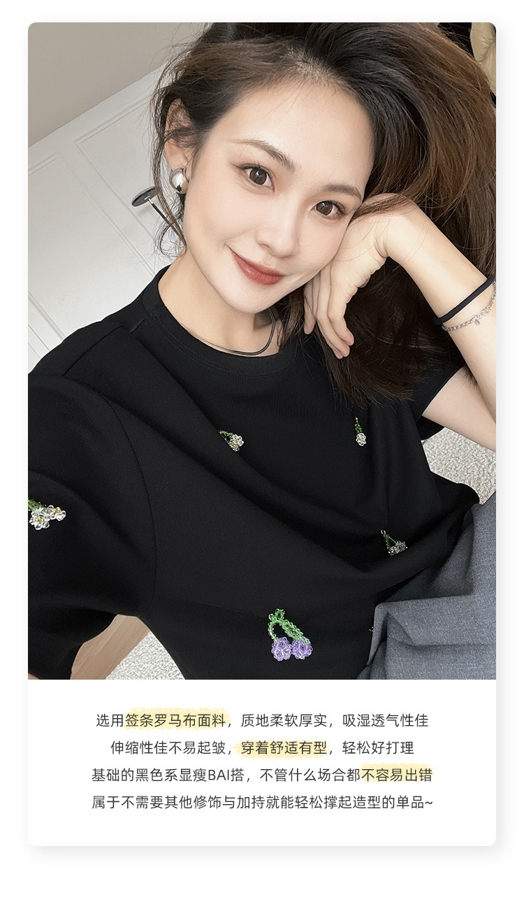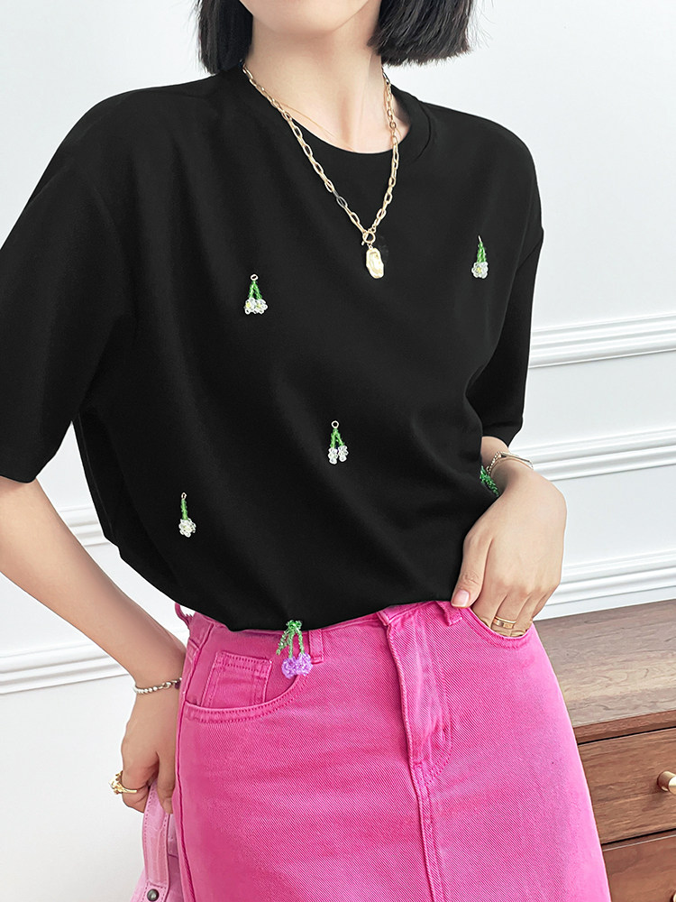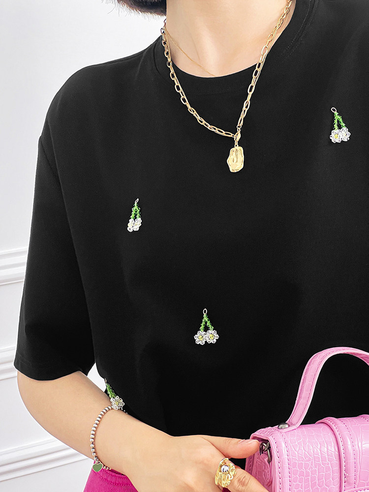 Футболка, трехмерные трикотажные нарукавники, свитер, в цветочек, короткий рукав