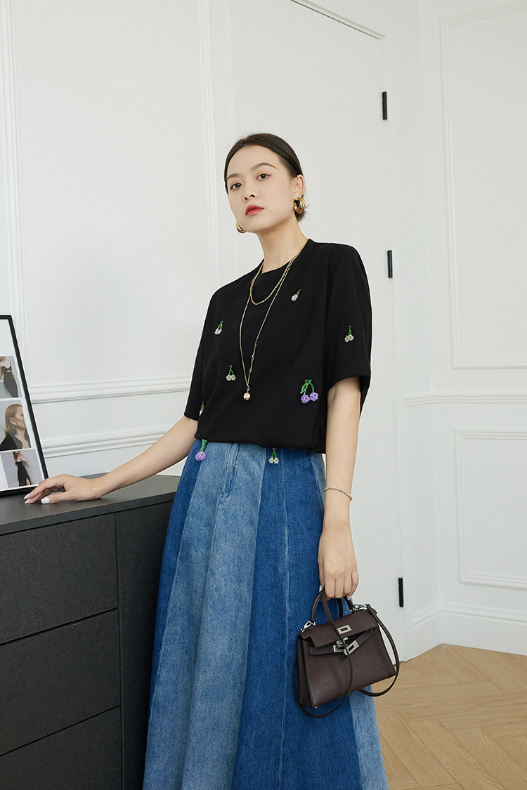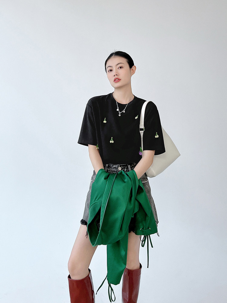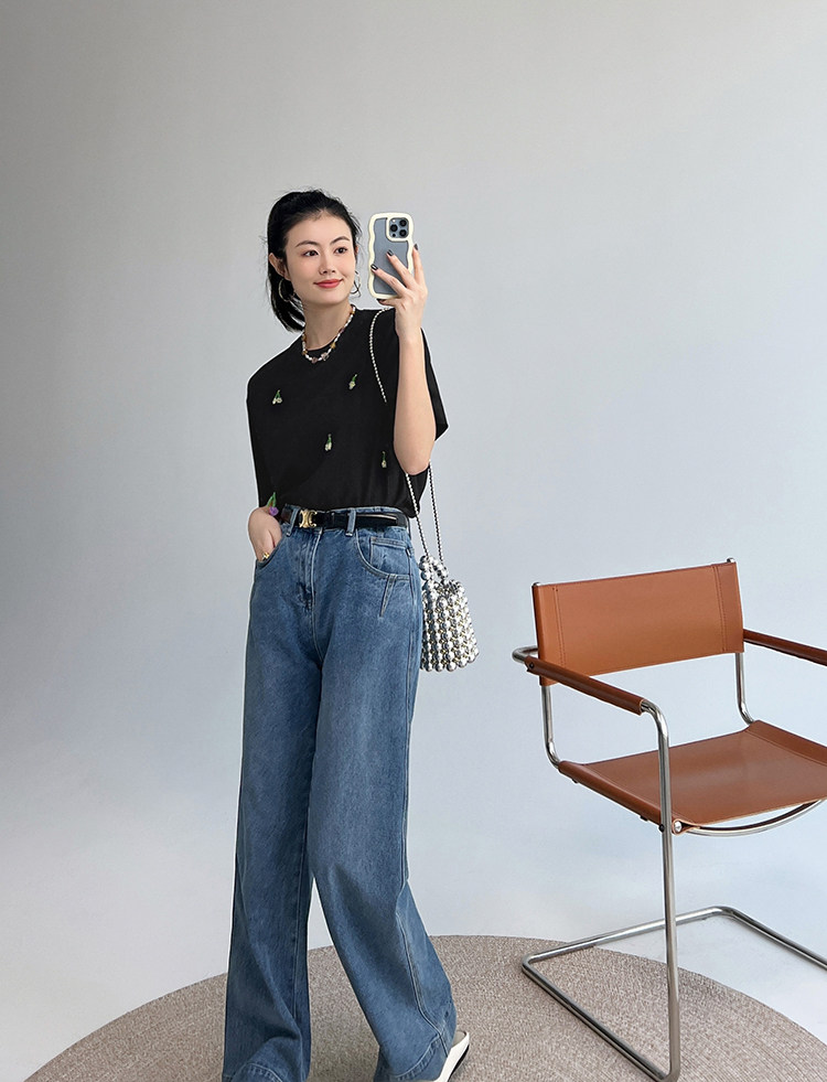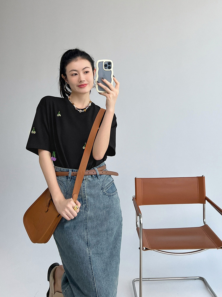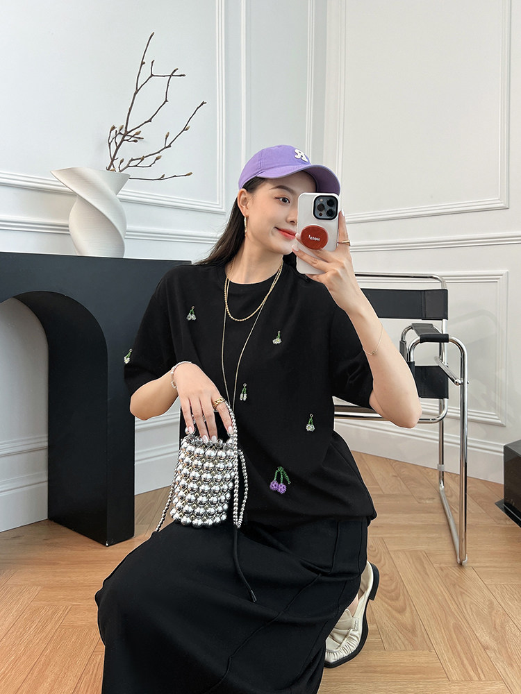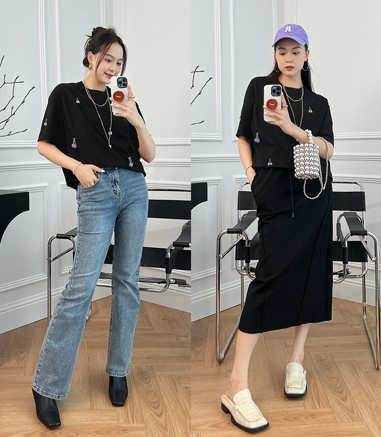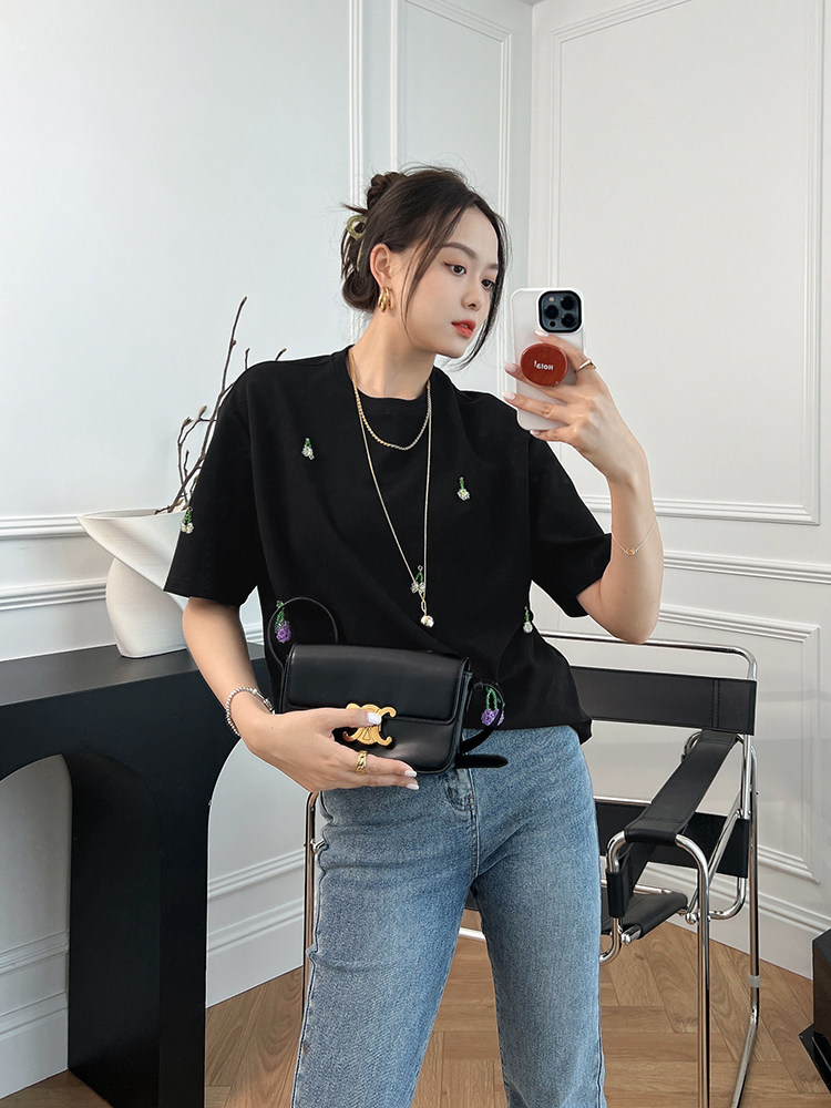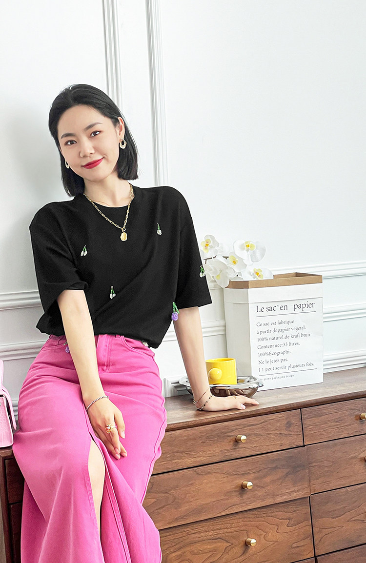 Футболка, трехмерные трикотажные нарукавники, свитер, в цветочек, короткий рукав