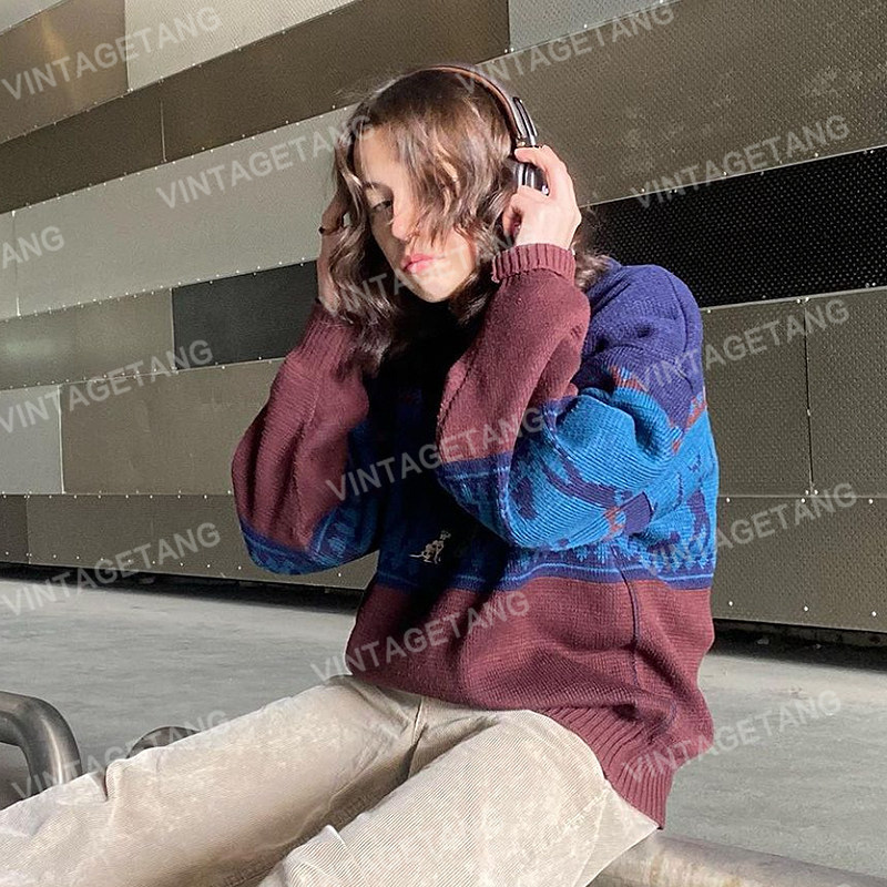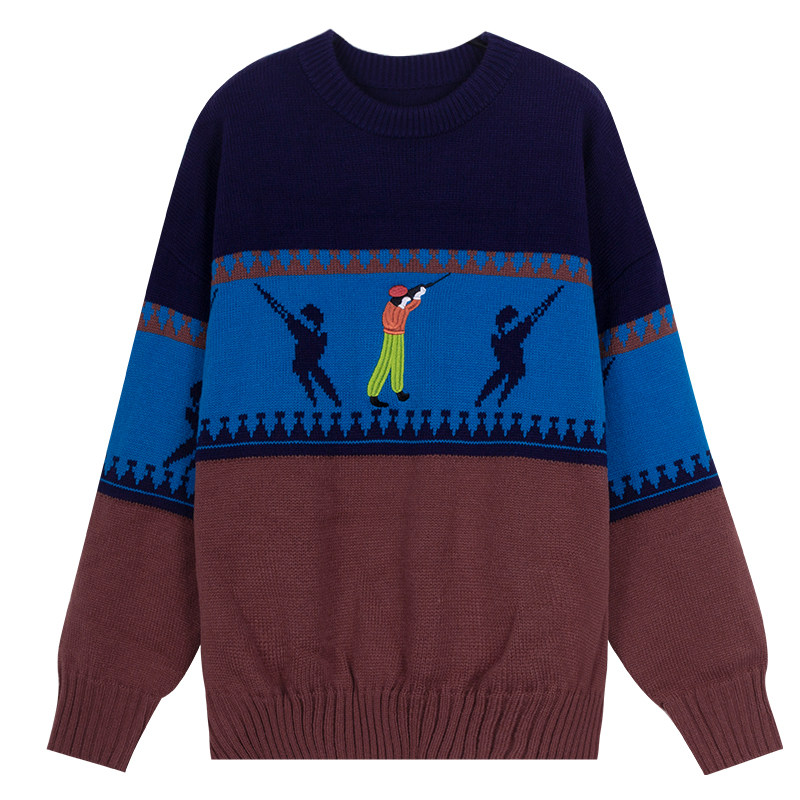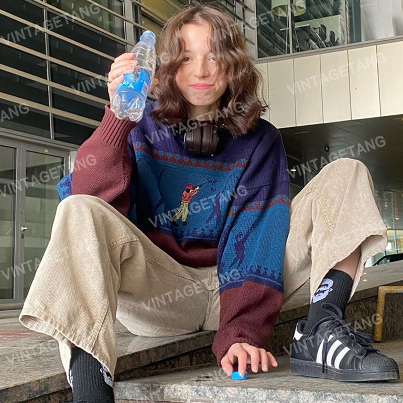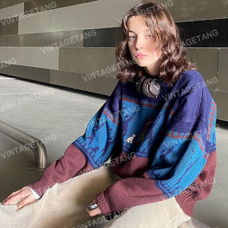 Ретро синий демисезонный трикотажный свитер, в американском стиле, с вышивкой, свободный крой