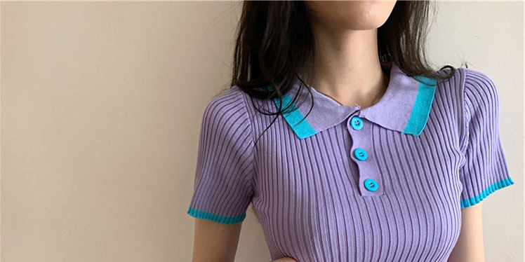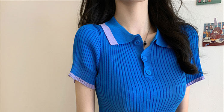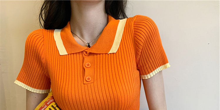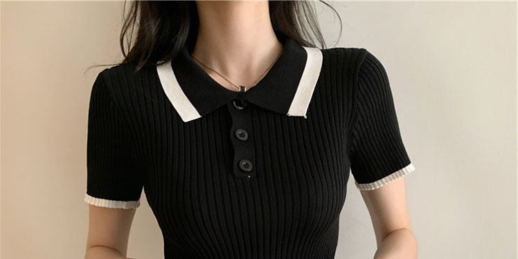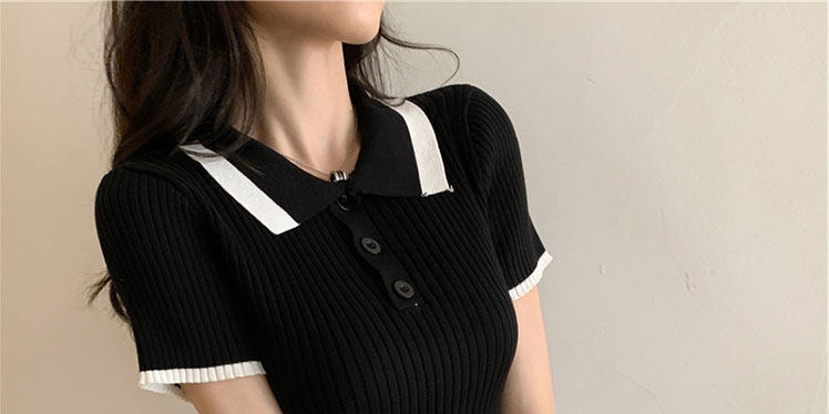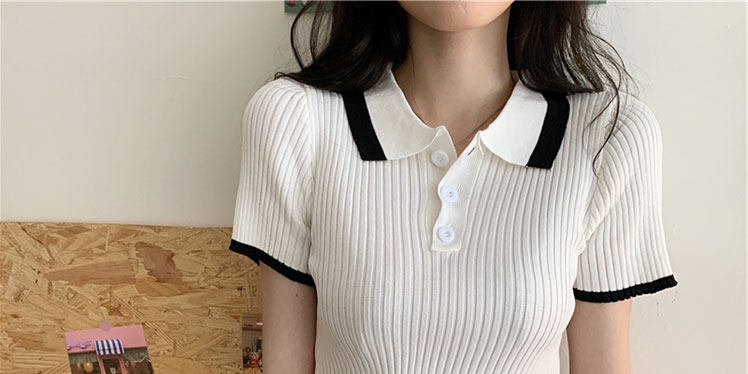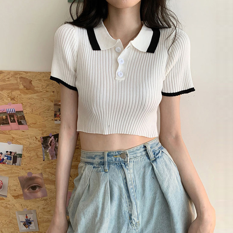 Белая футболка, трикотажный свитер, воротник поло, короткий рукав, коллекция 2022, в корейском стиле, высокая талия