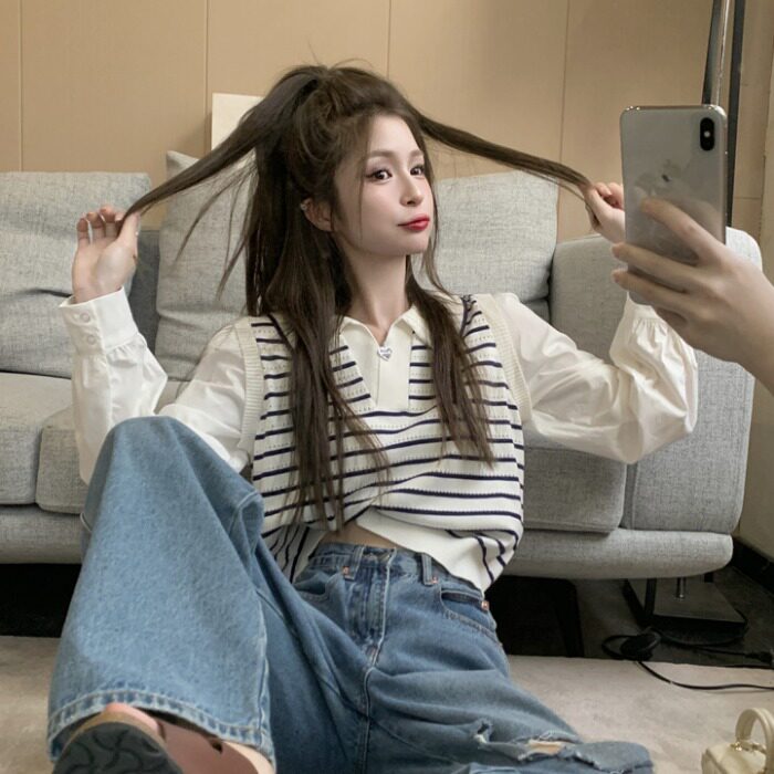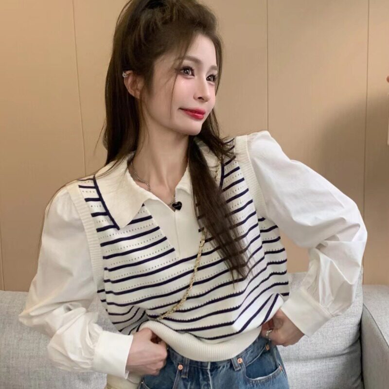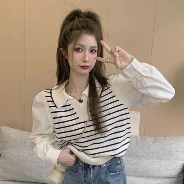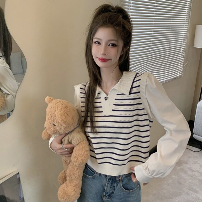 Комплект, осенний дизайнерский лонгслив, короткий трикотажный брендовый свитер, воротник поло, тренд сезона