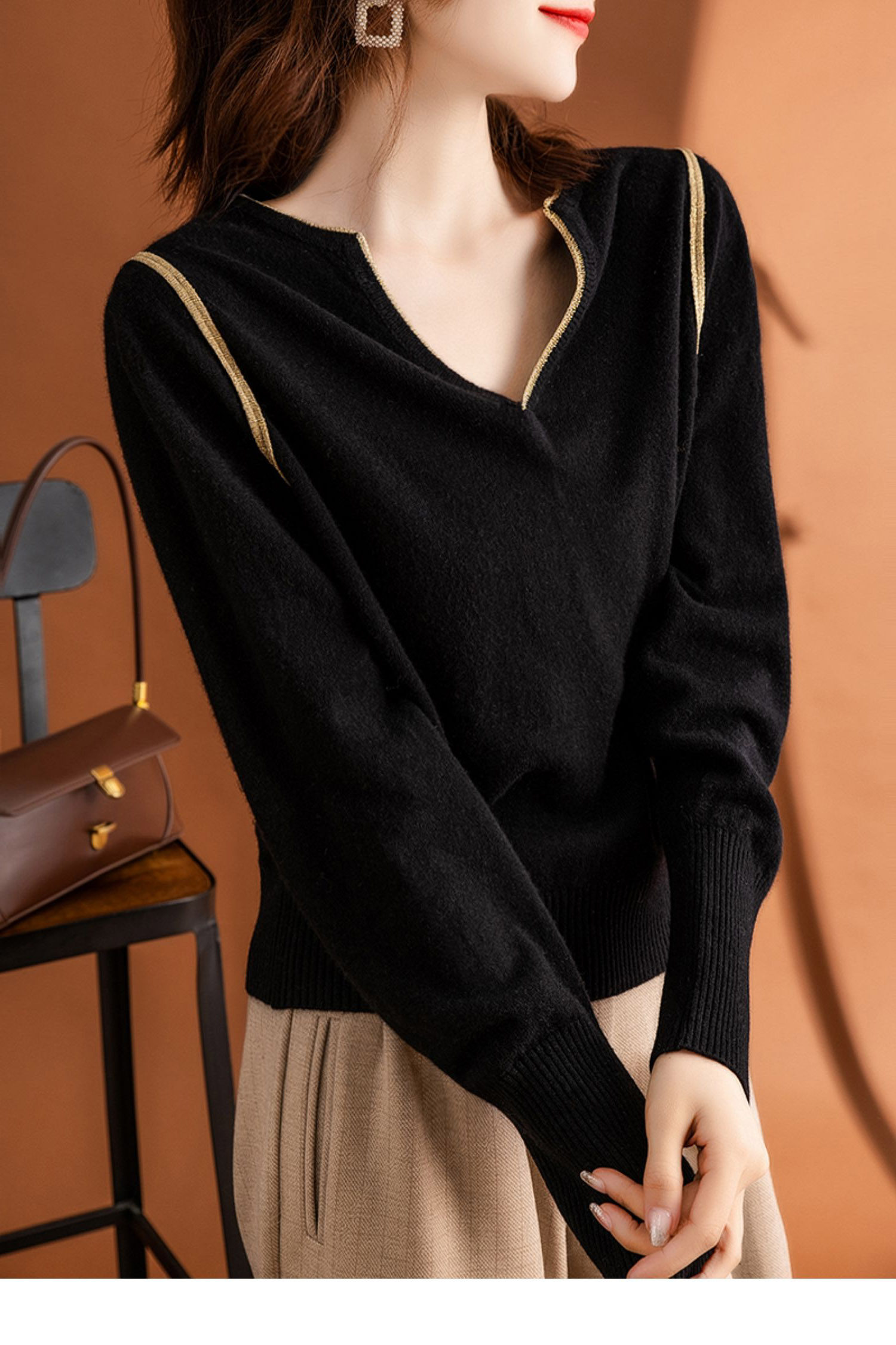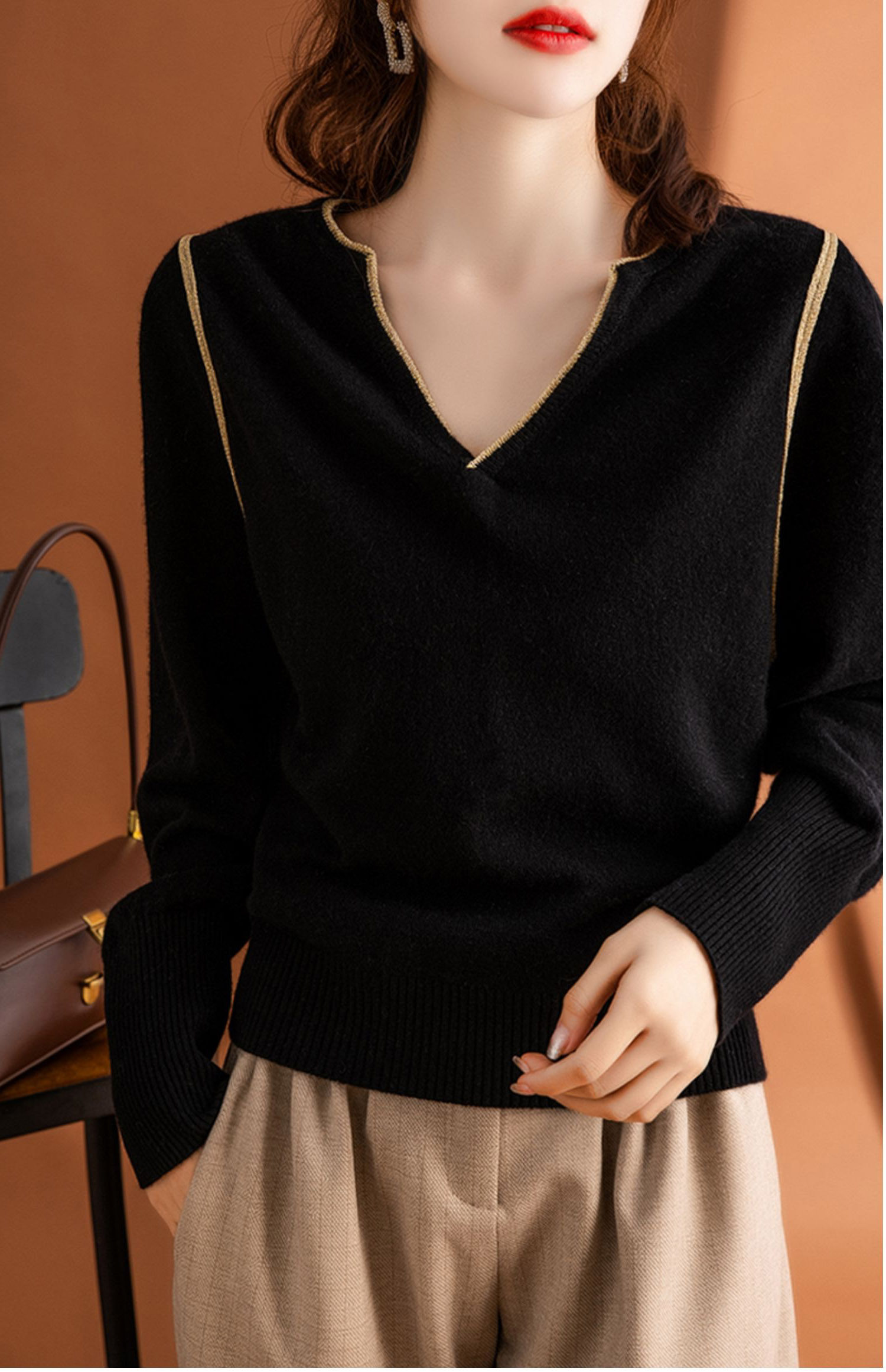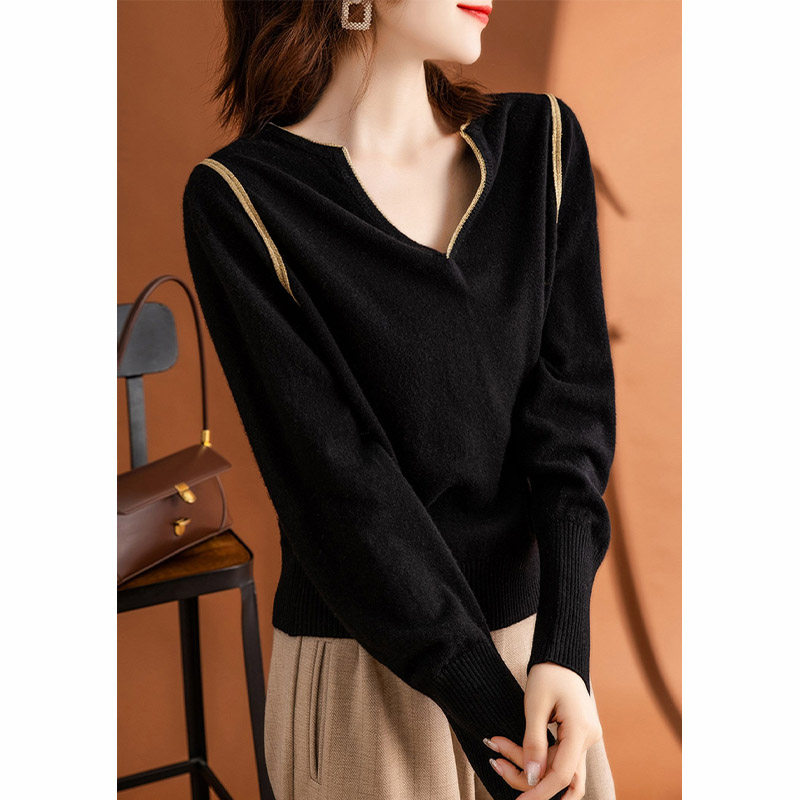 Шерстяной осенний элитный свитер, модная кашемировая футболка, базовый лонгслив, V-образный вырез