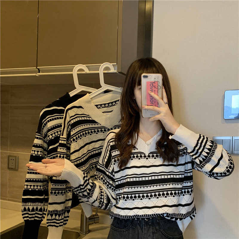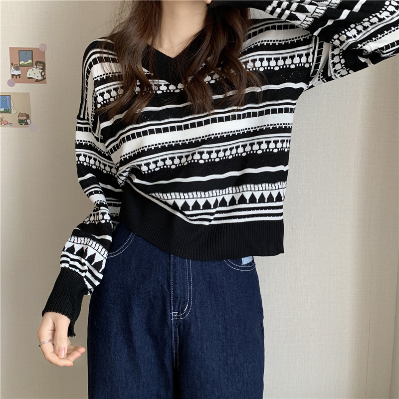 Осенний дизайнерский трикотажный ретро базовый приятный телу короткий свитер, тренд сезона, V-образный вырез, оверсайз