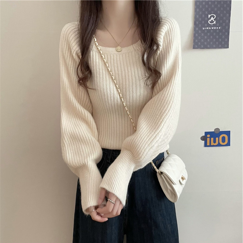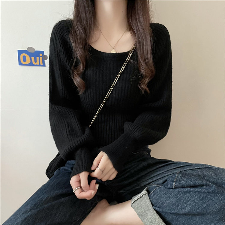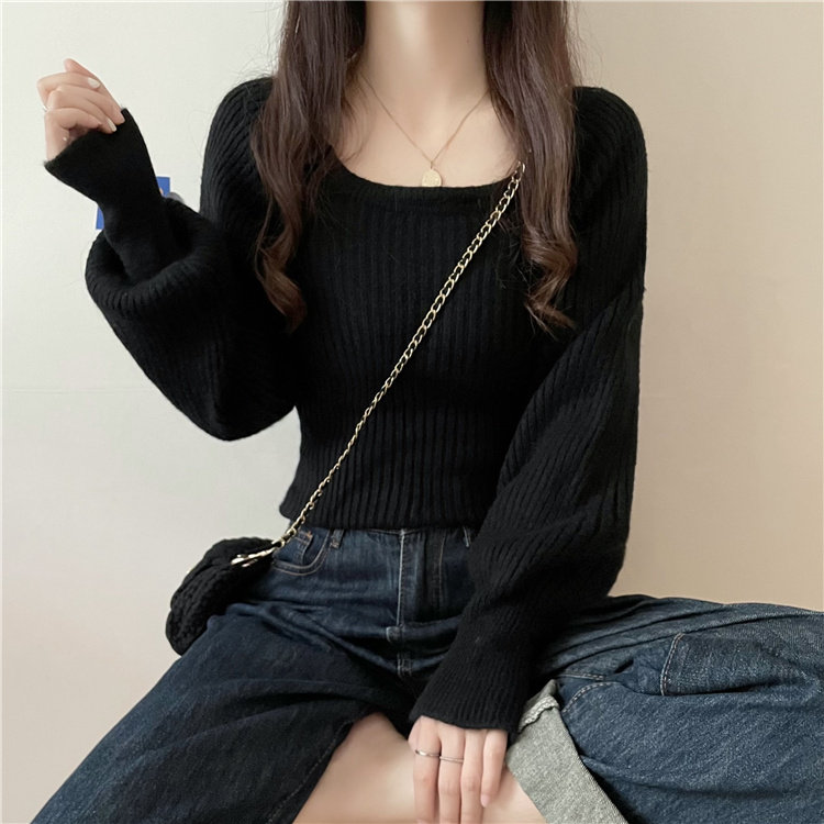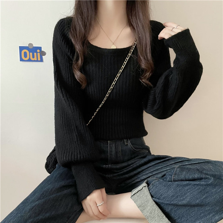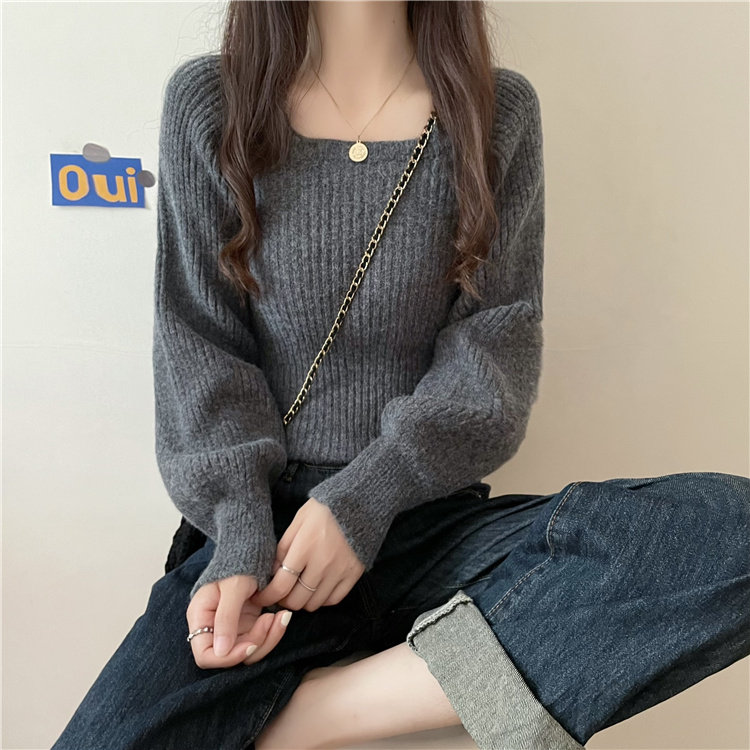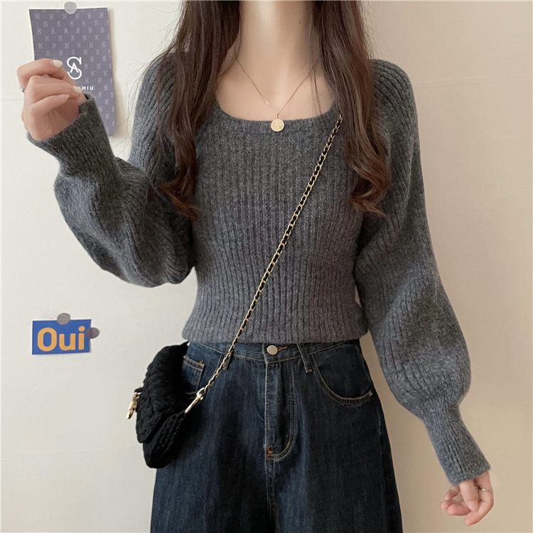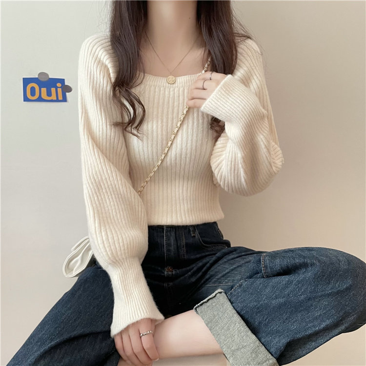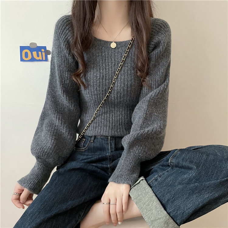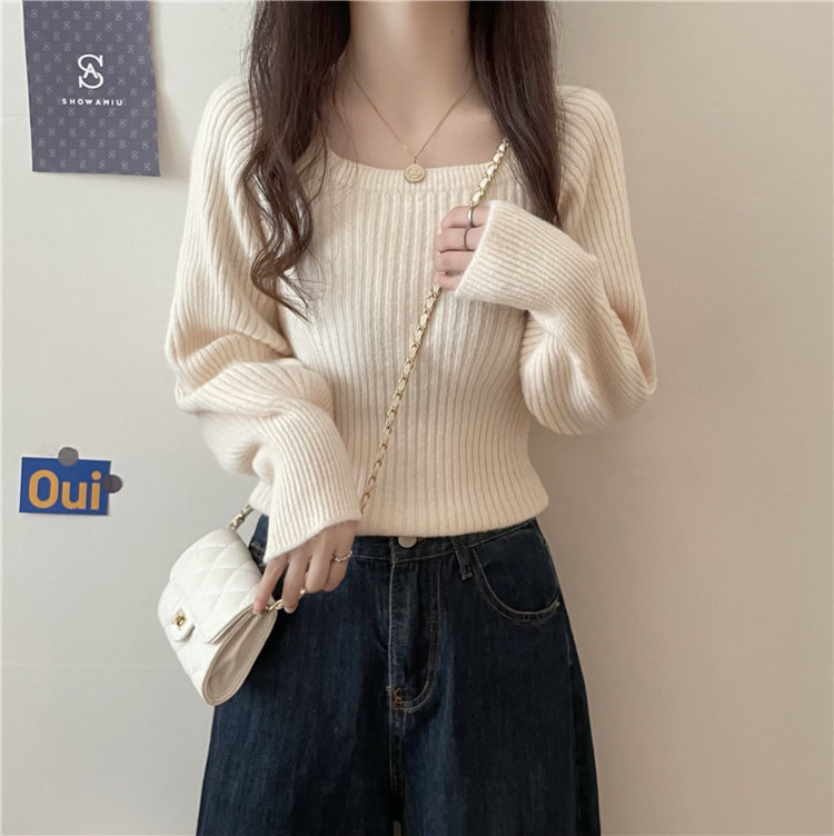 Ретро фонарь, осенний приталенный трикотажный свитер, квадратный вырез, в западном стиле