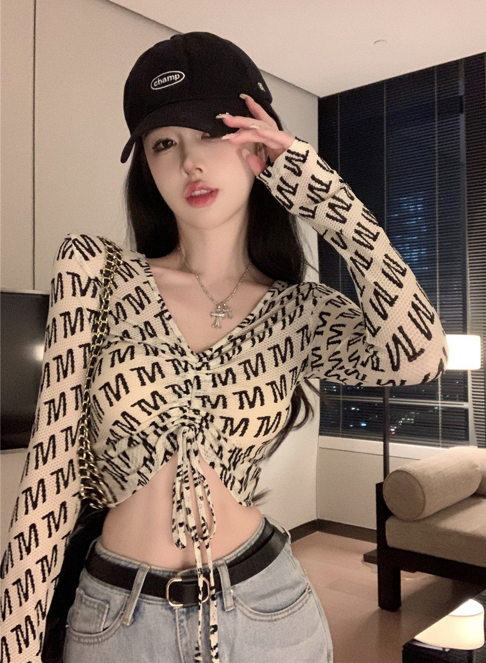 Короткая осенняя футболка, дизайнерский сексуальный лонгслив, на шнурках, коллекция 2022, тренд сезона