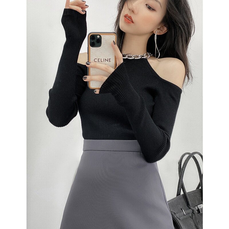Базовый приятный телу демисезонный весенний трикотажный свитер, изысканный стиль, открытые плечи