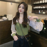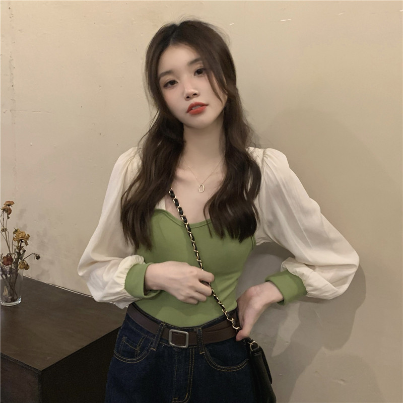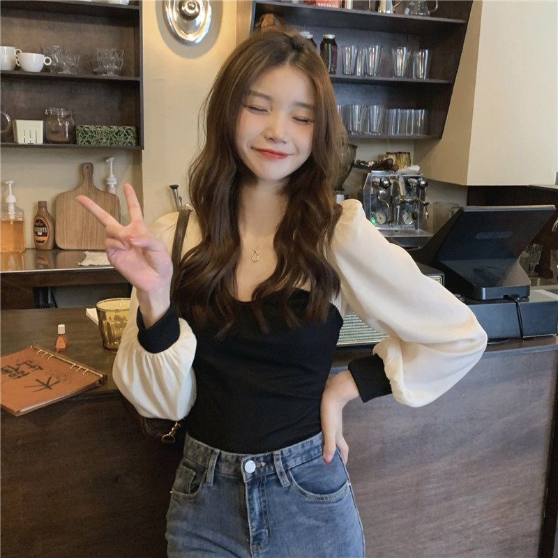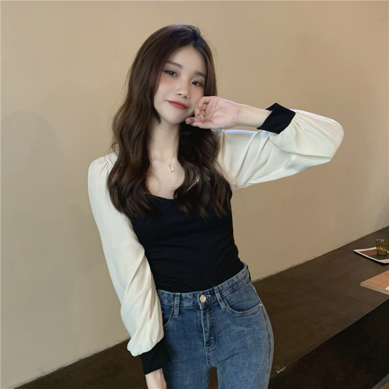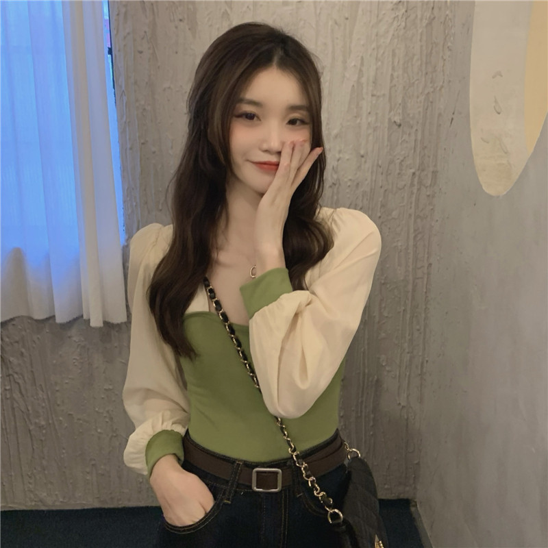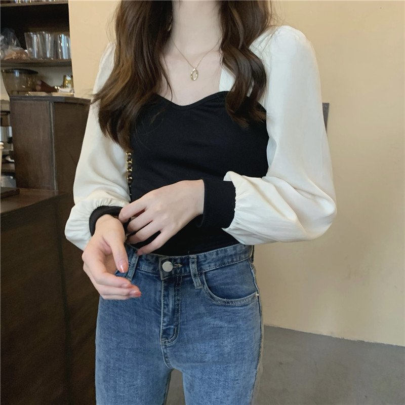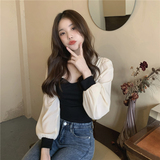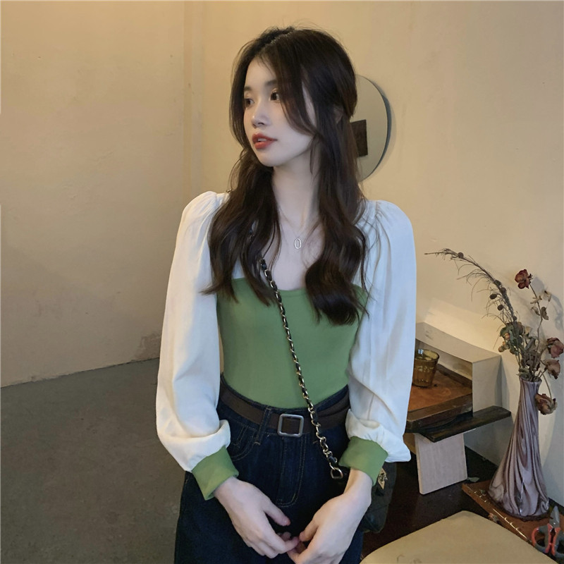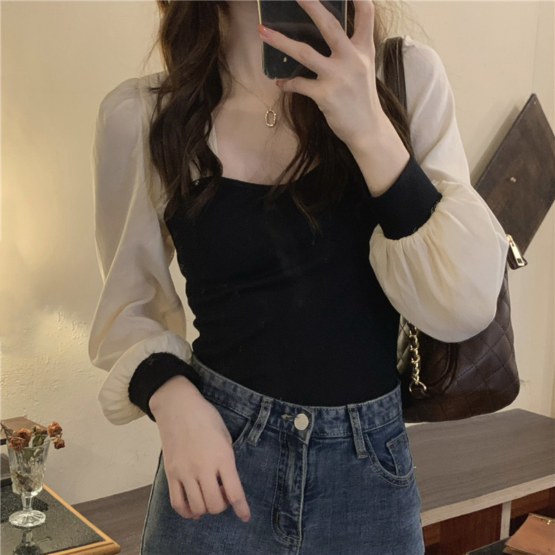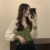 Трикотажный осенний дизайнерский свитер, квадратный вырез, французский стиль, рукава фонарики, тренд сезона