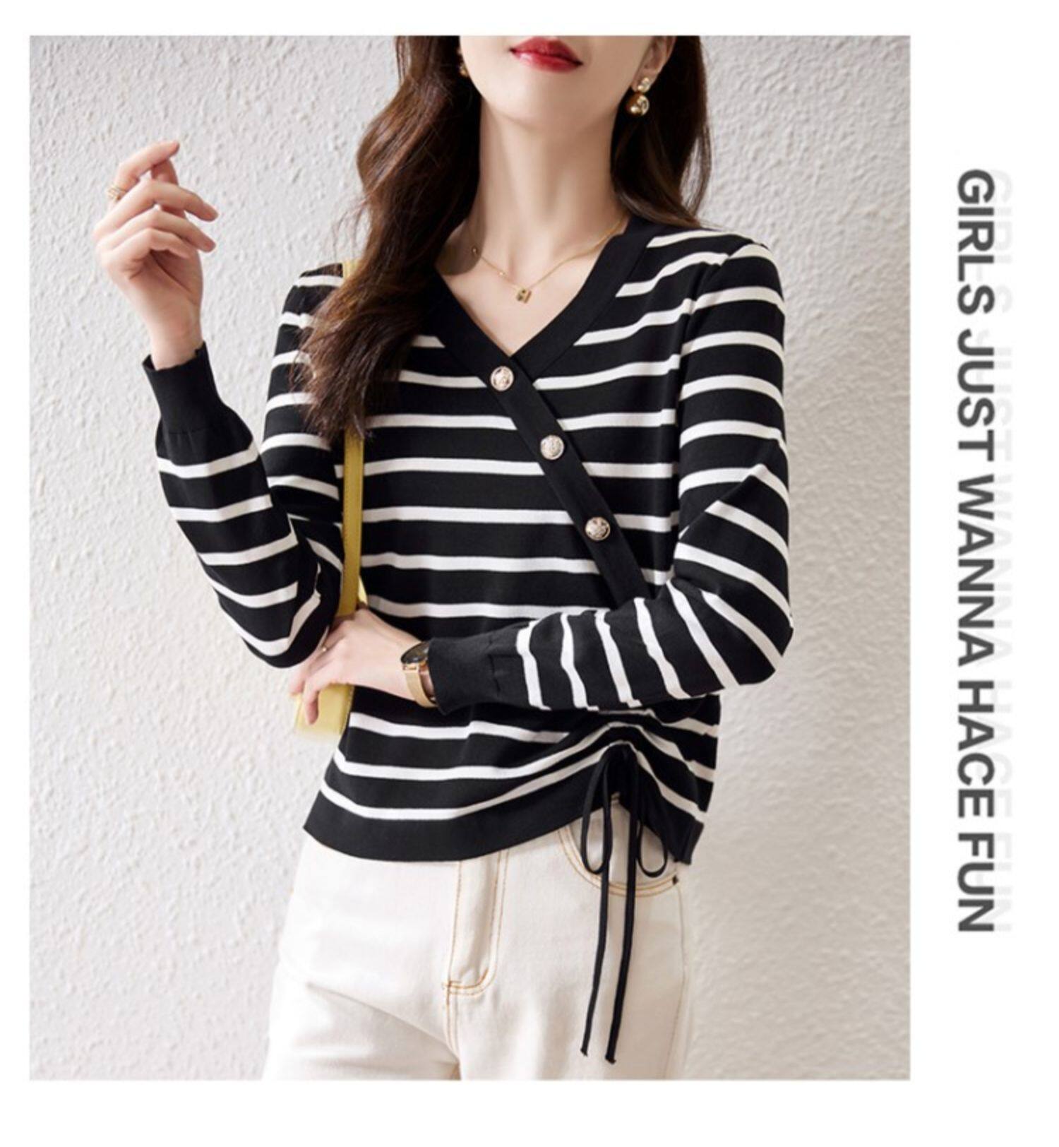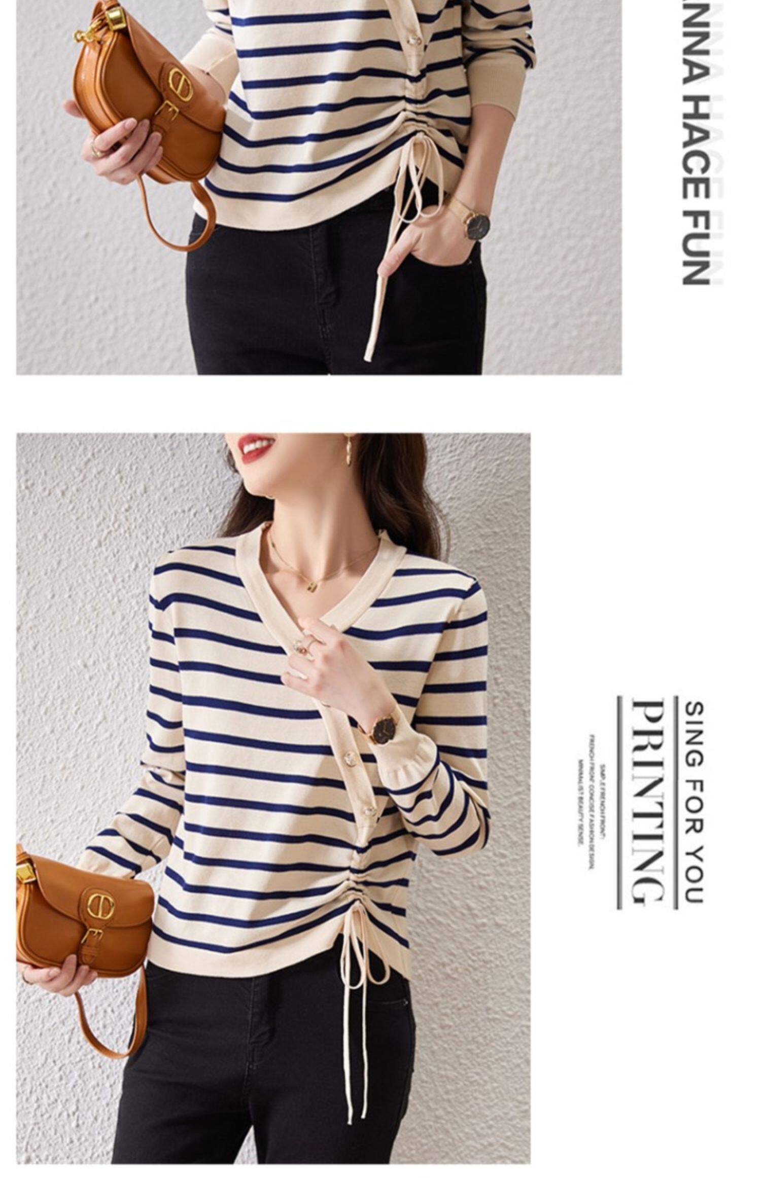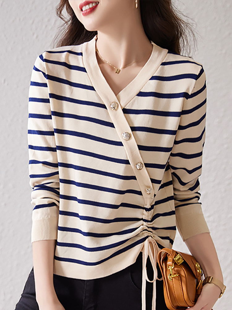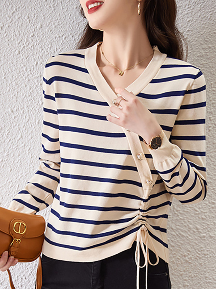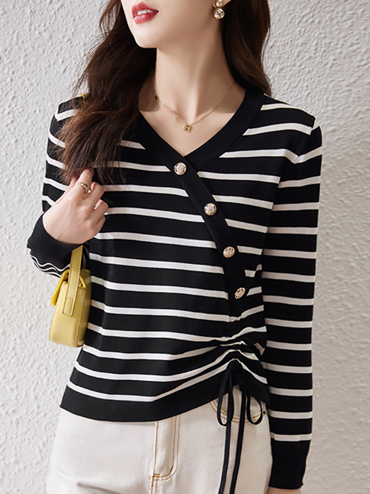 Полосатая трикотажная нижняя рубашка женская весна, осень и зима 2025, новый стиль, тонкая майка с v-образным вырезом в западном стиле, топ