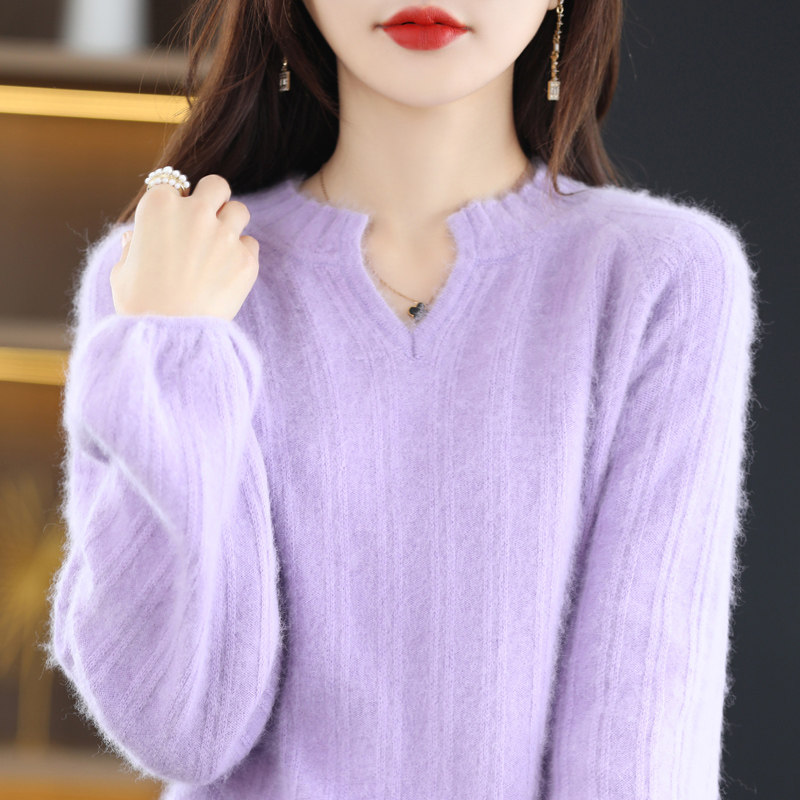 Бархатный однотонный шерстяной демисезонный трикотажный свитер, рукава фонарики, V-образный вырез, увеличенная толщина