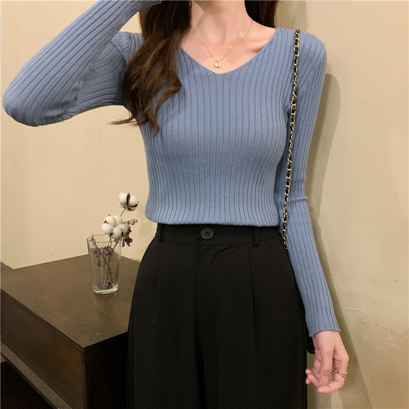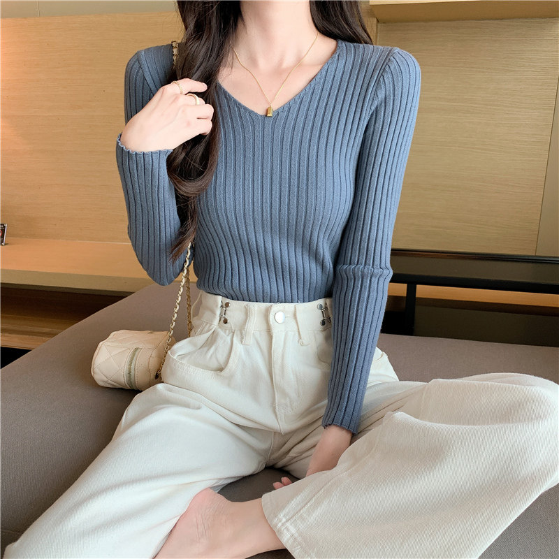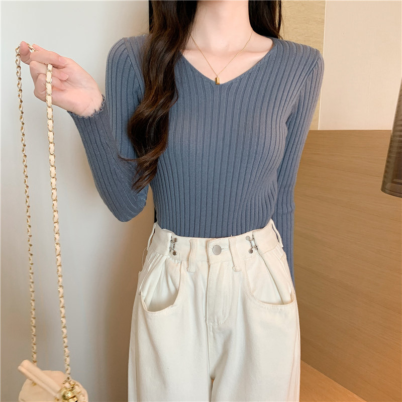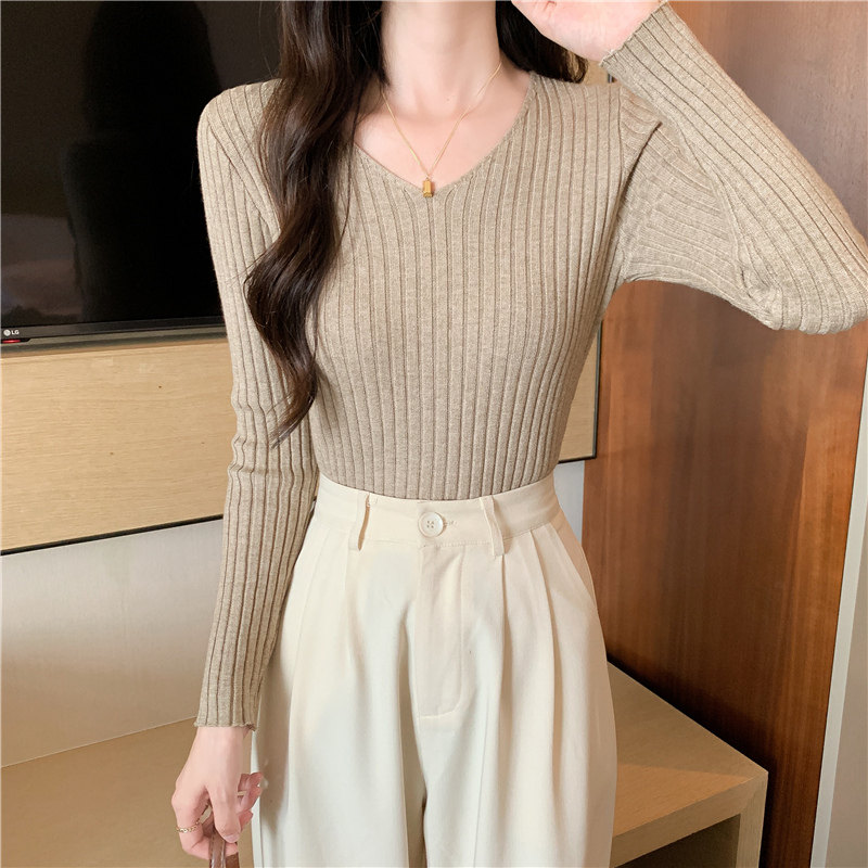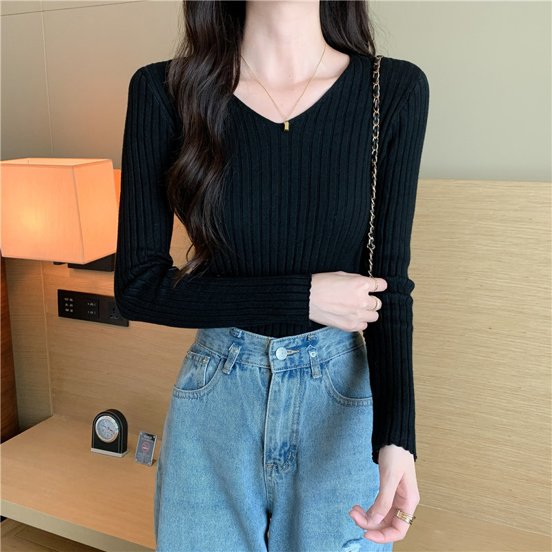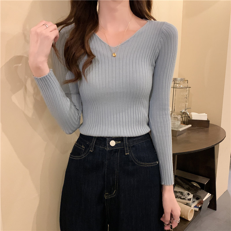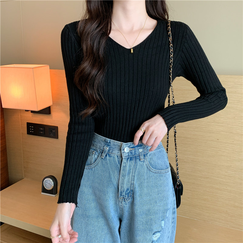 Демисезонный трикотажный лонгслив, свитер, V-образный вырез, облегающий крой, в обтяжку