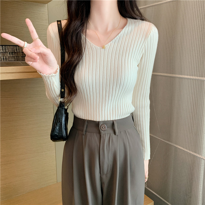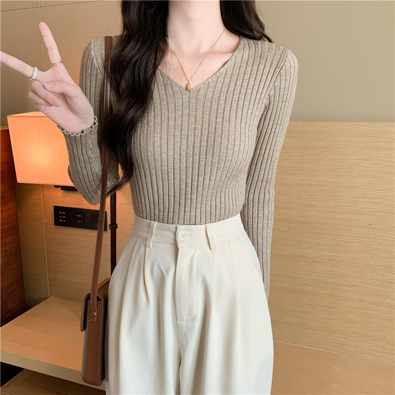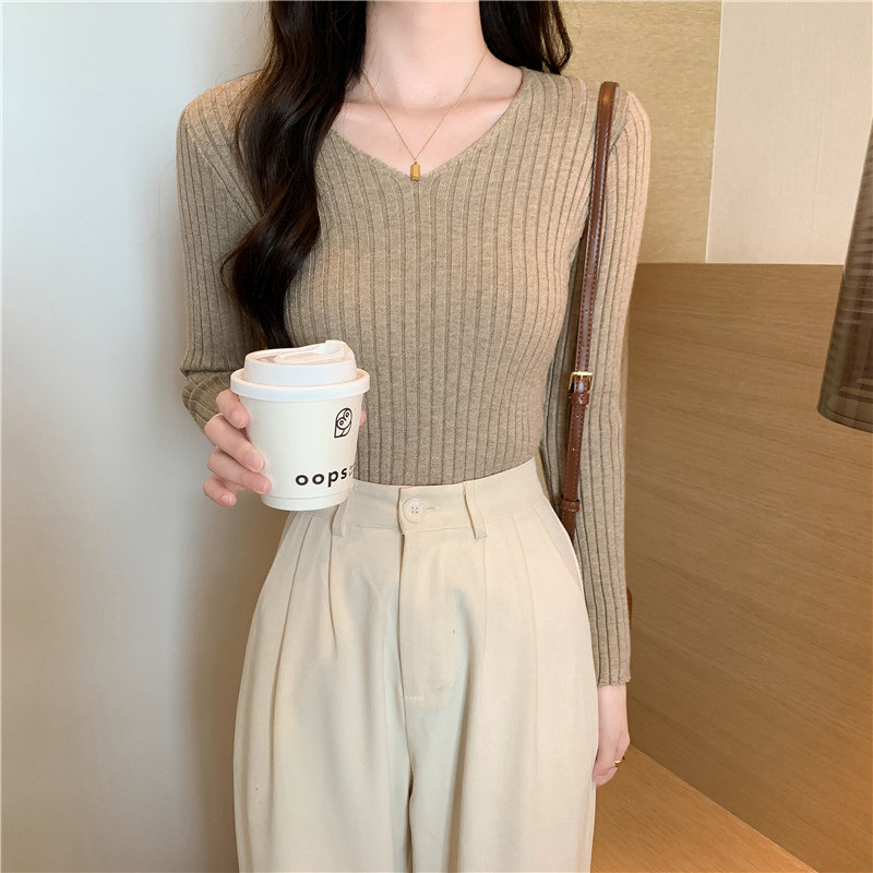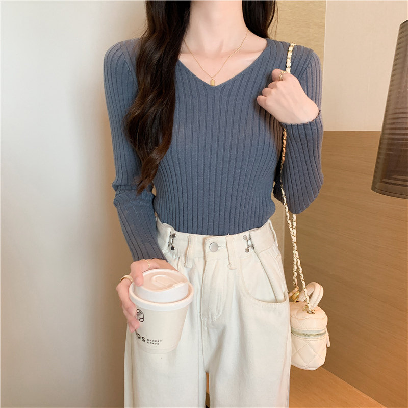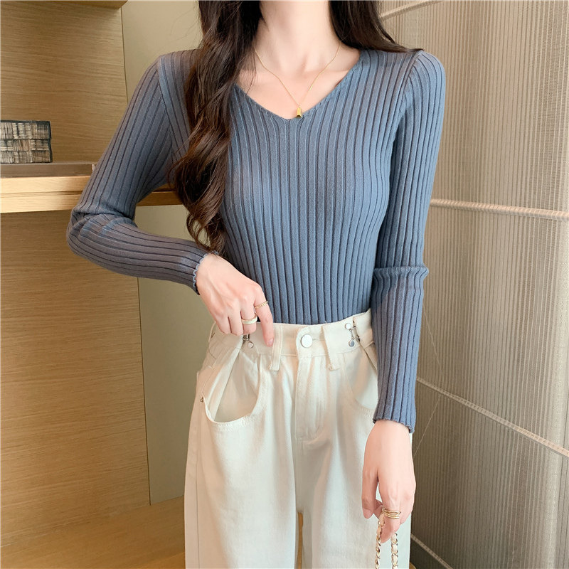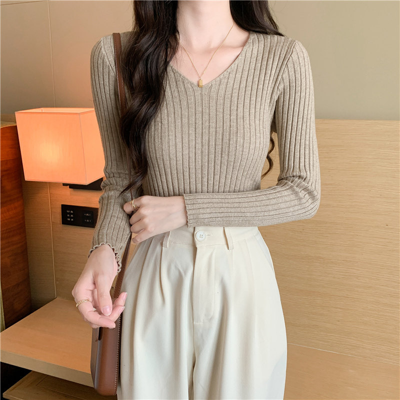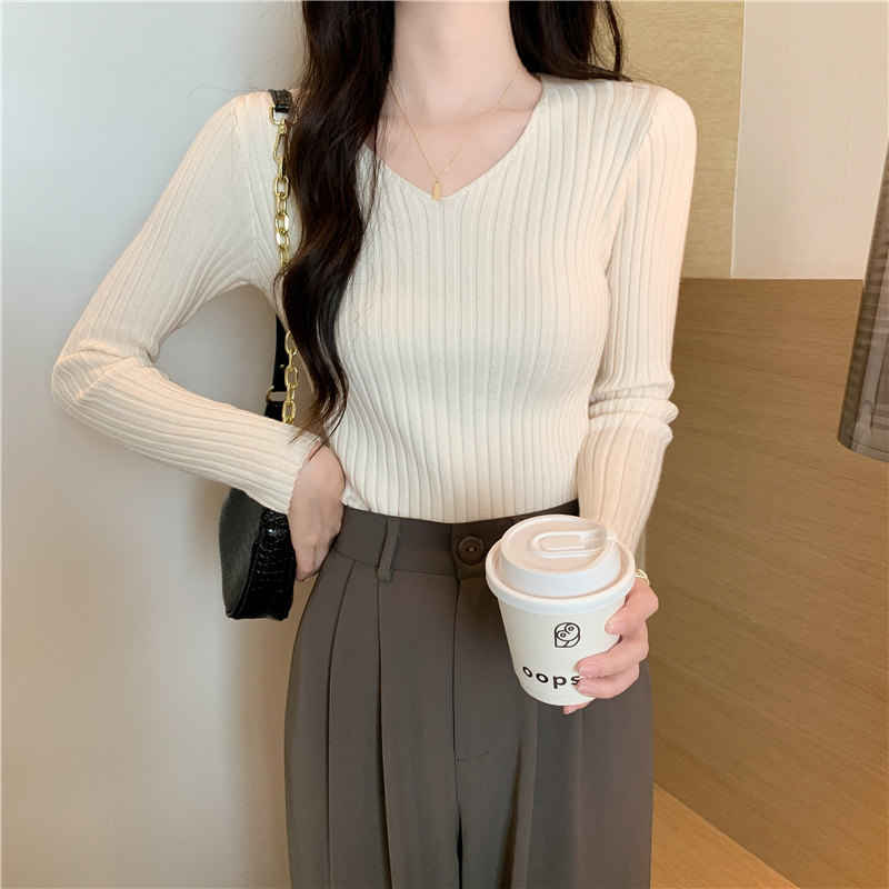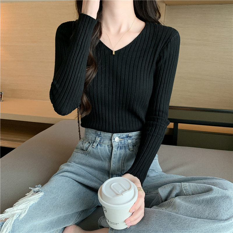 Демисезонный трикотажный лонгслив, свитер, V-образный вырез, облегающий крой, в обтяжку