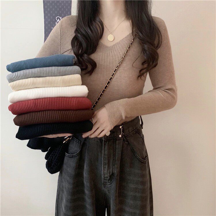 Трикотажный лонгслив, свитер, базовая приятная телу футболка, облегающий крой, V-образный вырез