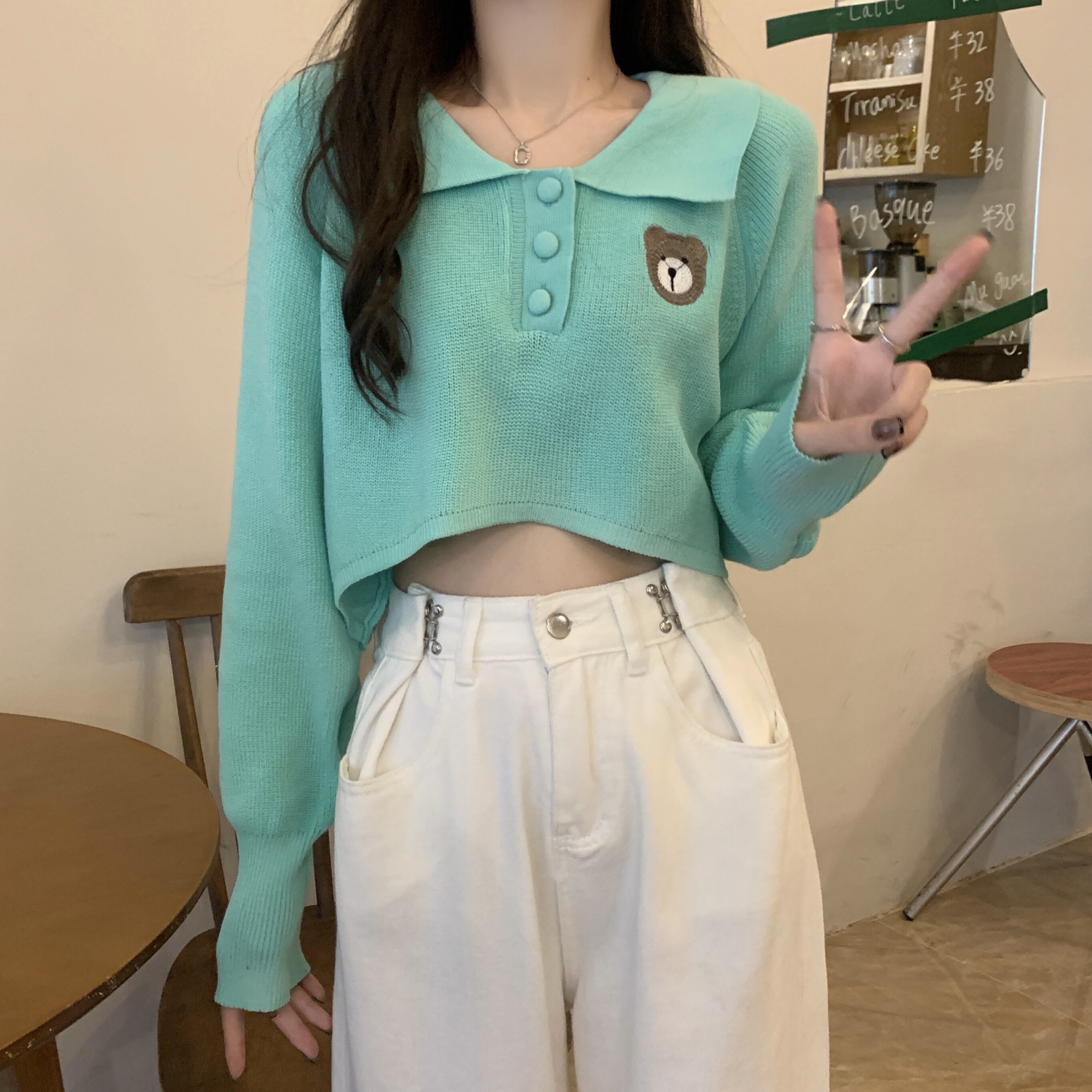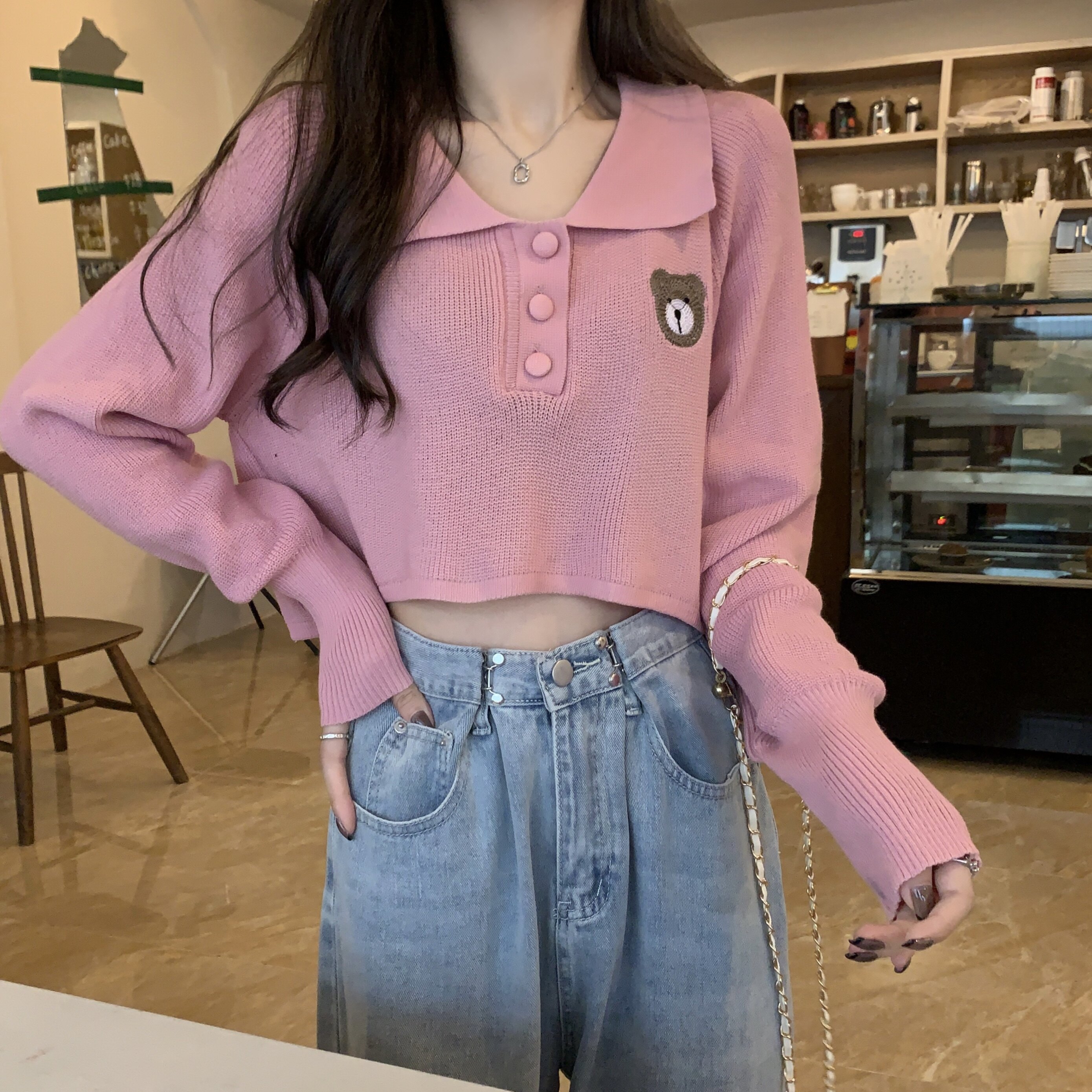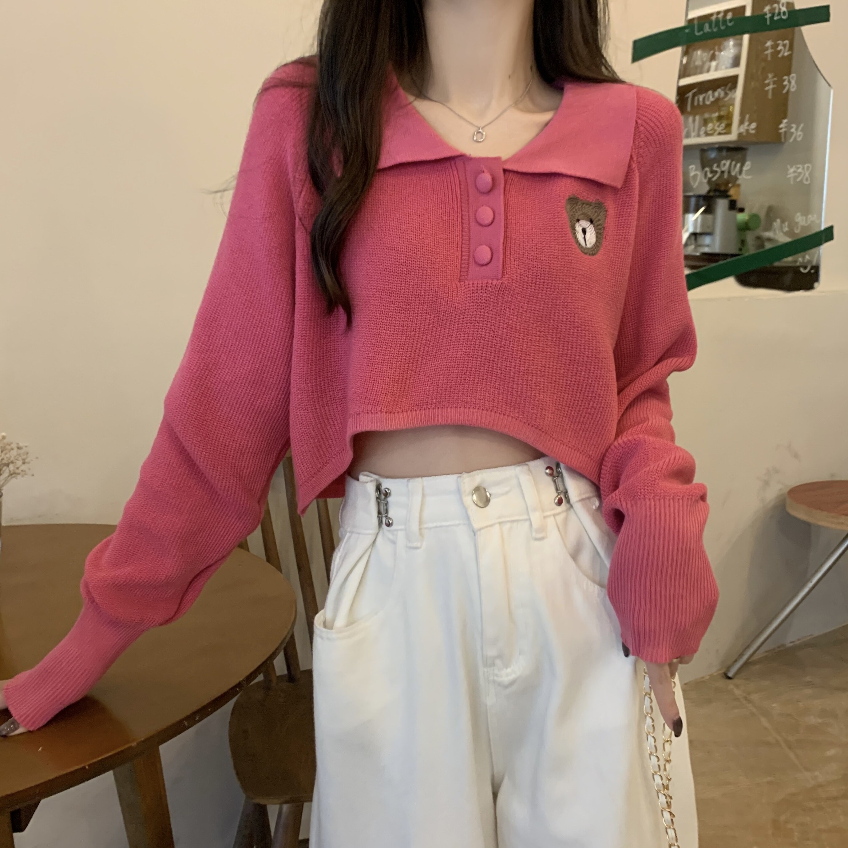 Малиновый розовый медведь вышитый вязаная базовая рубашка для женщин для женщин в весне носить маленький короткий нерегулярный топ