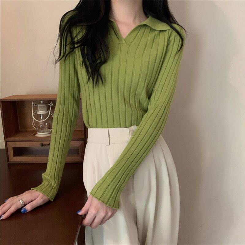 Трикотажный лонгслив, осенний дизайнерский приталенный базовый свитер, V-образный вырез, в корейском стиле, тренд сезона
