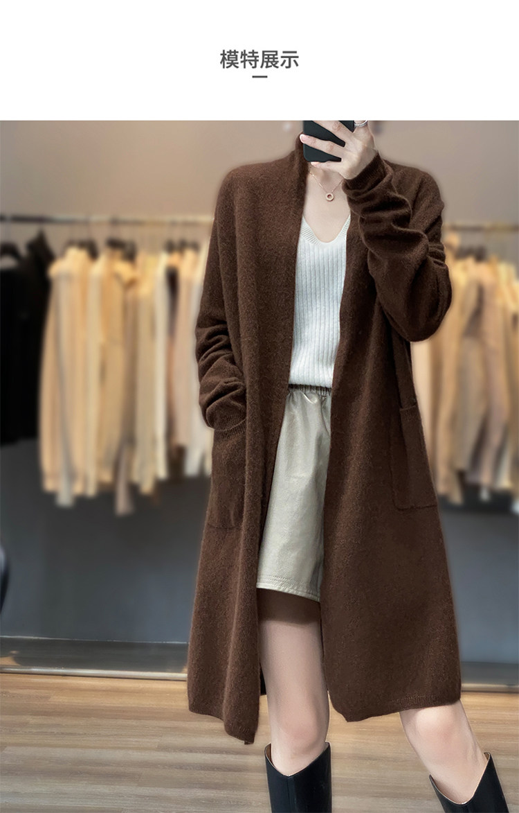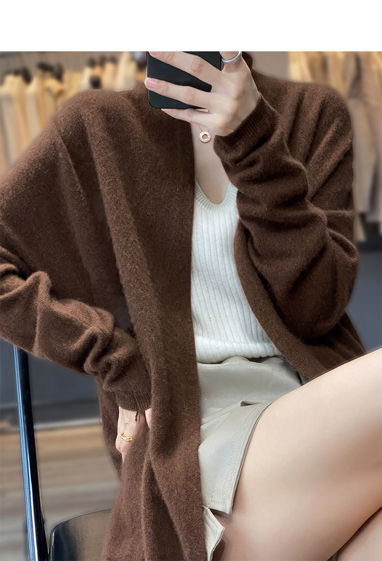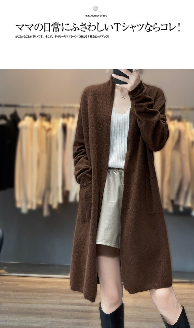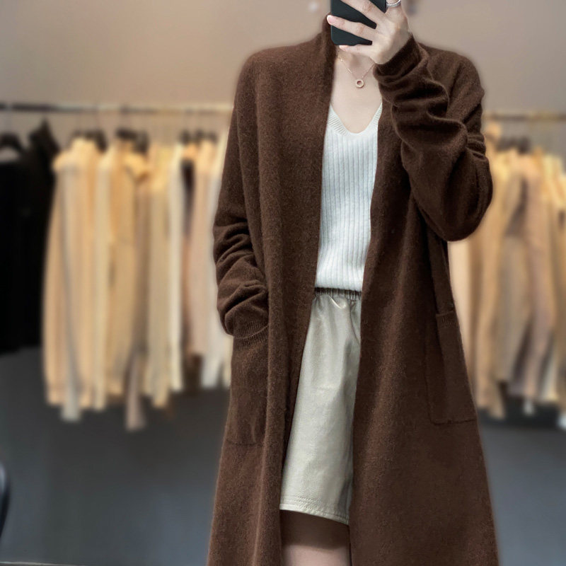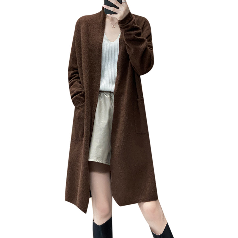 Демисезонный кашемировый однотонный кардиган, длинная трикотажная шерстяная куртка, V-образный вырез, оверсайз, средней длины